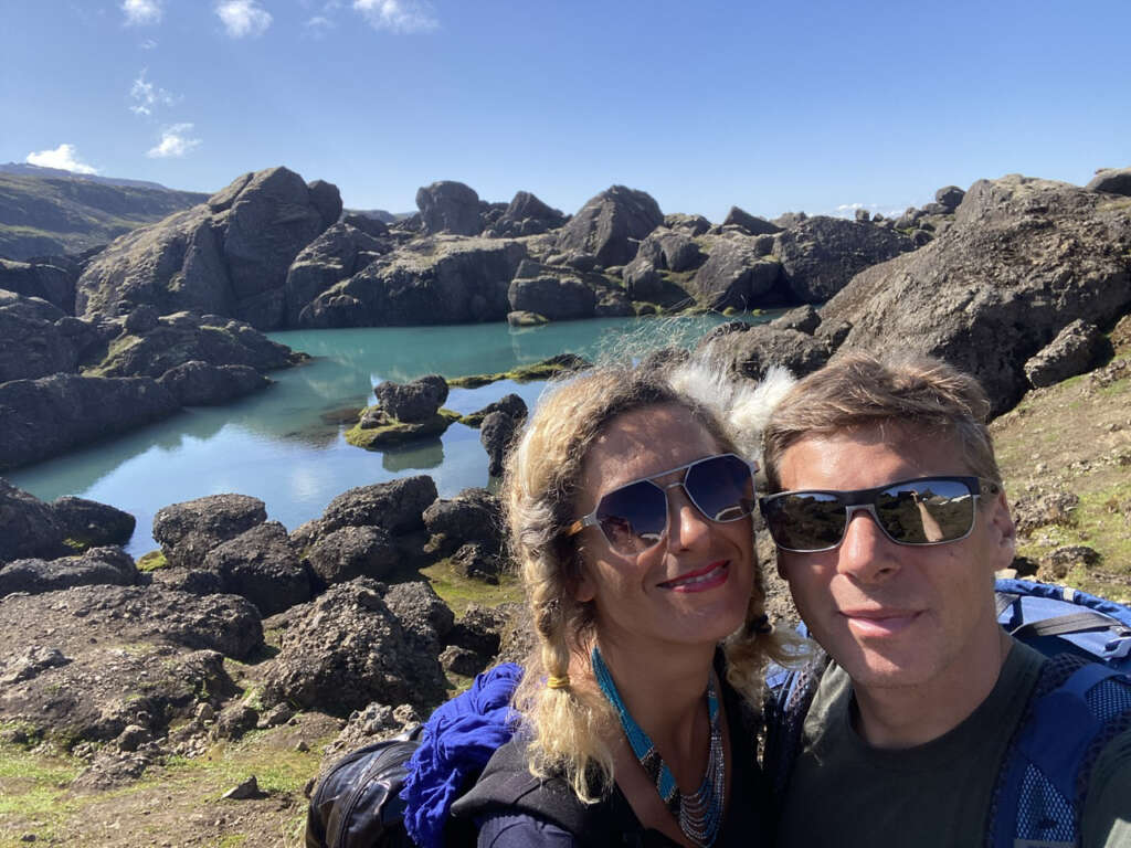 Il faut imaginer une sorte d’oasis en plein désert. Depuis qu’on marche on est entouré de montagnes et tout d‘un coup quand on bascule de l’autre côté, on découvre un cirque d’origine volcanique avec un glacier suspendu, des montagnes dentelées tout autour, et en contre-bas, un ensemble improbable de lacs d’un bleu émeraude émaillé de nombreux rochers qui font penser à ceux de la digue aux Seychelles et qui forment comme des petites iles au milieu. Merci weddingplanner effectivement, ce lieu est hors du temps.