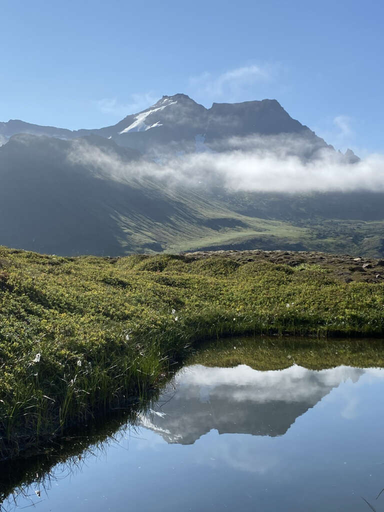 Après avoir traversé la petite rivière, on se dirige vers le lac émeraude qu’on surplombe assez rapidement. Bienvenue aux Seychelles… avec de l’eau à 3 degrés et le glacier en arrière-plan.