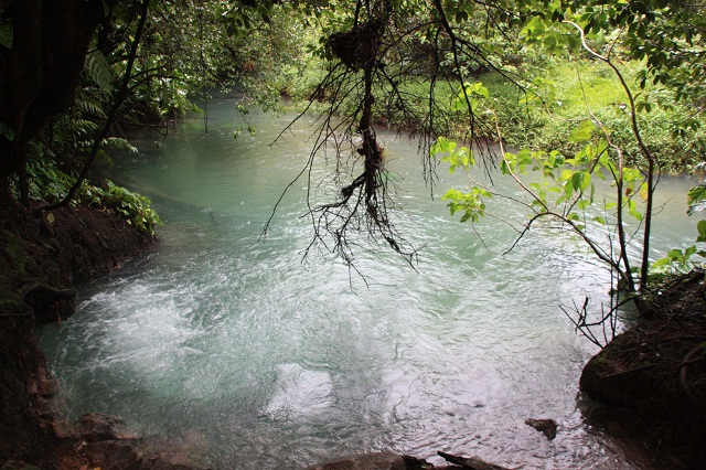 … puis que le rio celeste se mélange avec un autre fleuve en amont qui apporte notamment le souffre et d’autres minéraux pour aboutir à cetet couleur (cf photo ci-dessous ou on voit bien les 2 eaux se mélanger pour donner ce bleu).