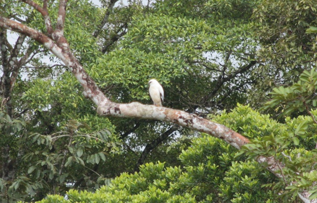 Le rio Celeste est à 30 Km du lodge, donc 1H15 de voiture sur des chemins défoncés. On se prend le guide du lodge car l’expérience en Equateur nous a appris que dans une forêt tropicale, sans guide, tu ne vois rien.  Sur la route, le temps vire au ciel bleu et on verra ainsi nos premiers toucans sauvages (Fred en est tombé amoureux), et un faucon blanc assez majestueux il faut avouer.