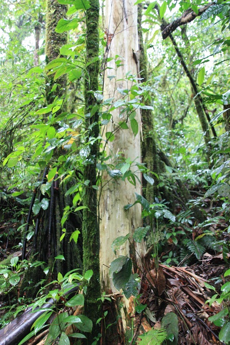 Pour l’arbre pris au piège par le “Strangular Ficus” (Figuier étrangleur en français, ça c’est facile !) je “suppute” qu’il pourrait s’agir d’un eucalyptus qui est un arbre à tronc exfoliant (perd son écorce en lamelles – en bas à droite de la photo -). Mais y-a-t-il des eucalyptus au Costa Rica ? D’autres arbres sont sur la défensive, Ceiba pentanda, Acacia, Cecropia ……