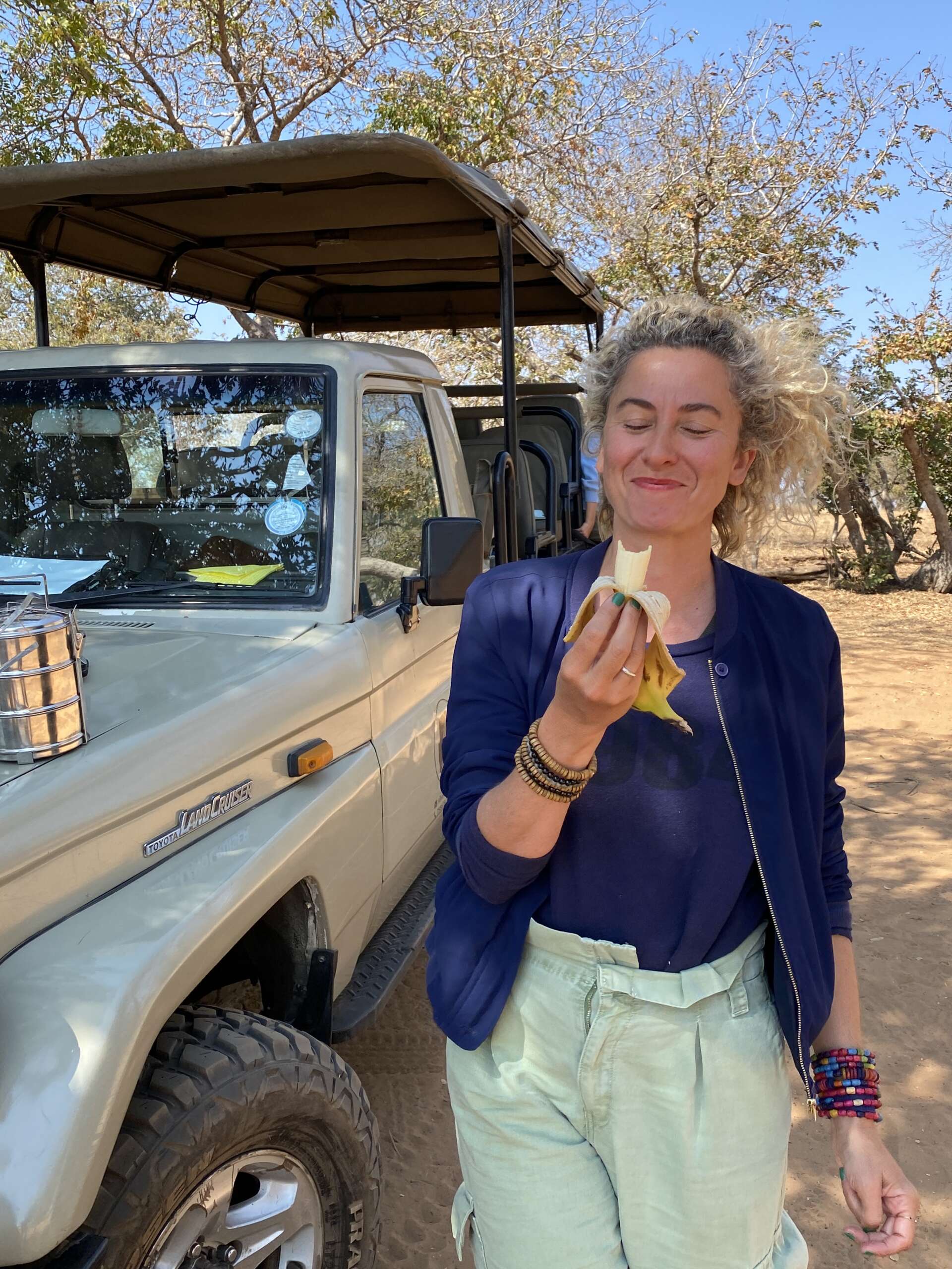 On retourne au spot du léopard. La carcasse est toujours là, mais pas de léopard en vue. On descend vers la rivière et on s’apprête à manger à 200 mètres de là où est la carcasse avec le léopard dans les parages. Noah, si tu pouvais éviter de trop t’éloigner, même pour aller faire pipi…