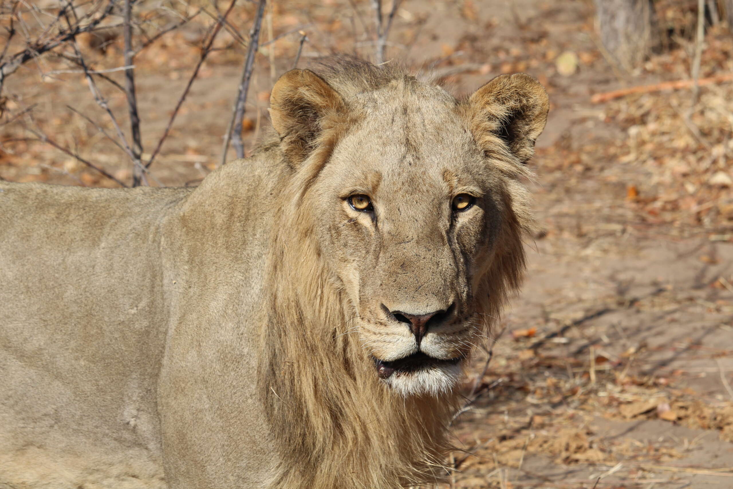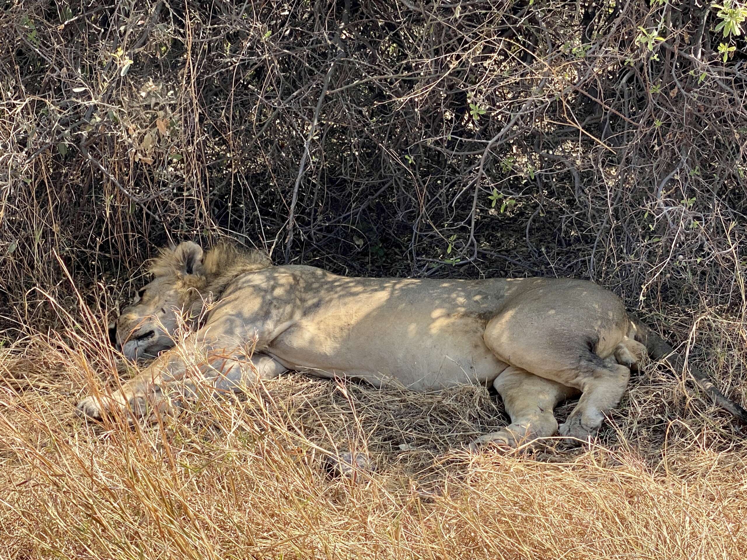 On roule ainsi 10 minutes, puis on s’arrête. Il y a bien un lion qui se prélasse à l’ombre d’un buisson mais pas de trace de carcasse. Wrong Lion. C’est un des mâles de la troupe qu’on a vu tantôt. Rien à voir avec celui qu’on cherche.