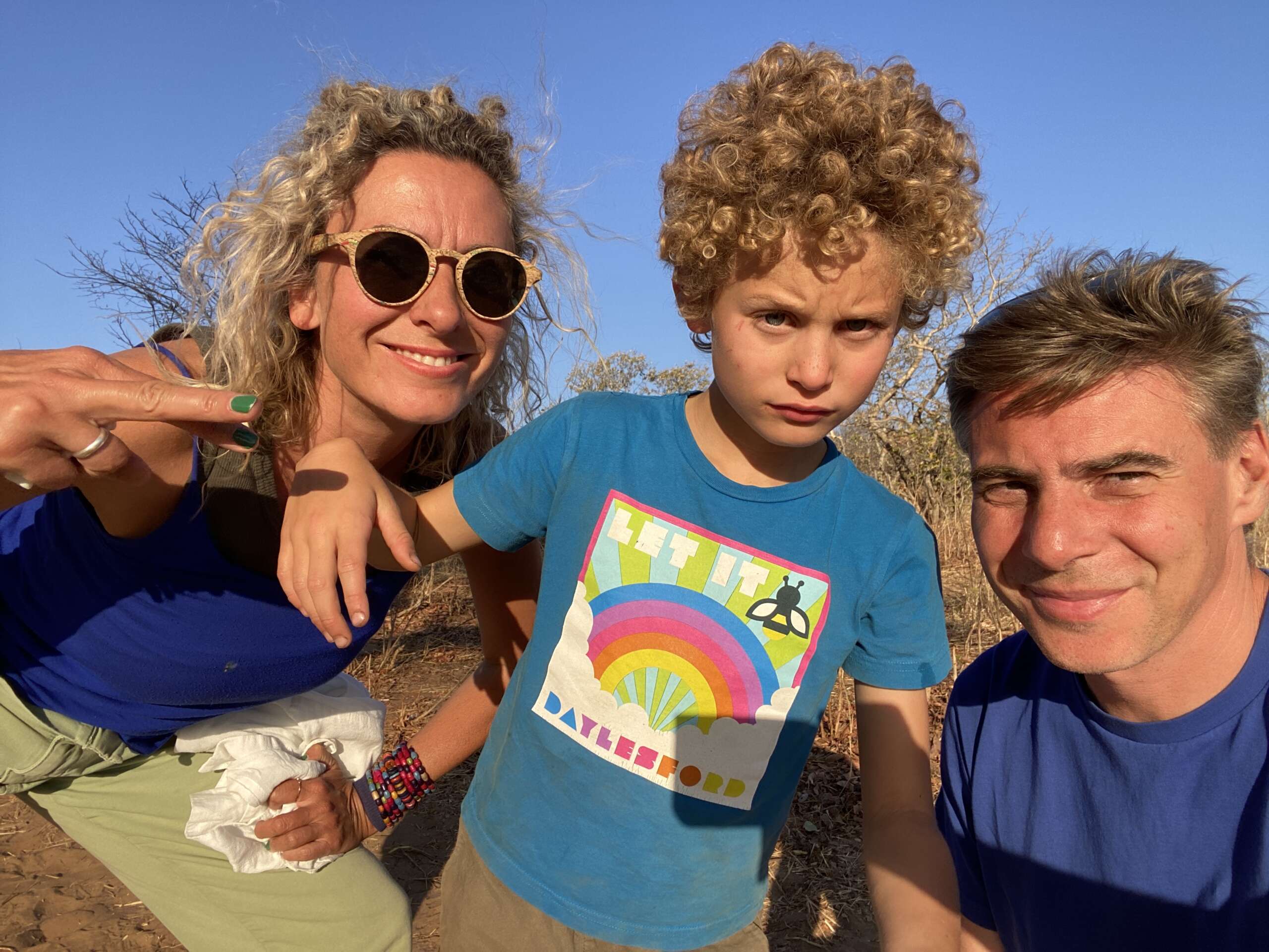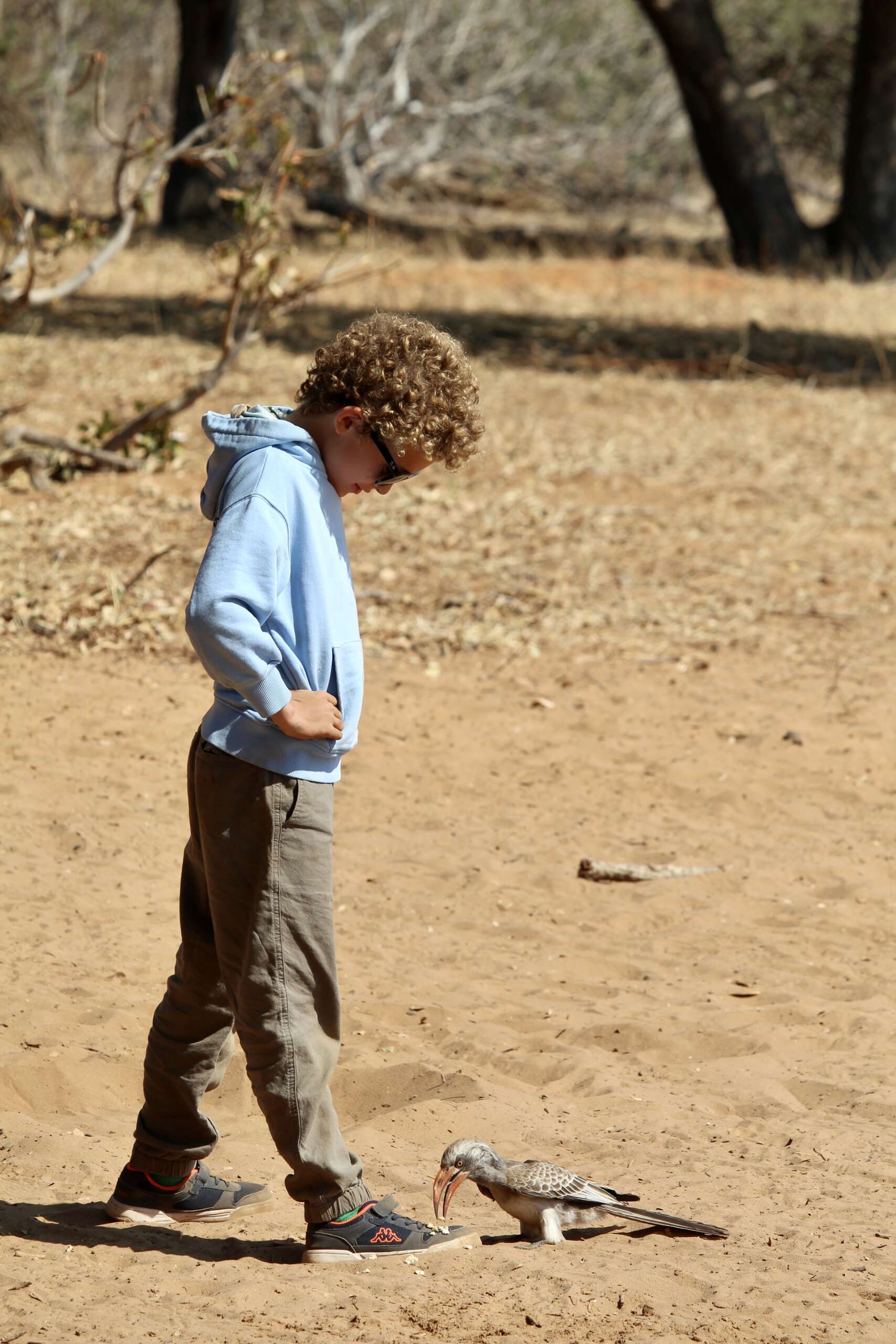 Bref, on arrive à notre spot pause petit déj, sous un énorme arbre. Et en effet ici, il y en 4 – 5 Kalaos qui volent autour. Avec la bénédiction de Quentin, Noah, qui bien sûr ne mangera rien alors que cela fait 20 minutes qu’il réclamait une pause parce que son ventre faisait des gargouillis, émiette le Muffin que Virginie lui avait mis de côté et entreprend de creuser une assiette dans le sable pour donner à manger aux Kalaos.
