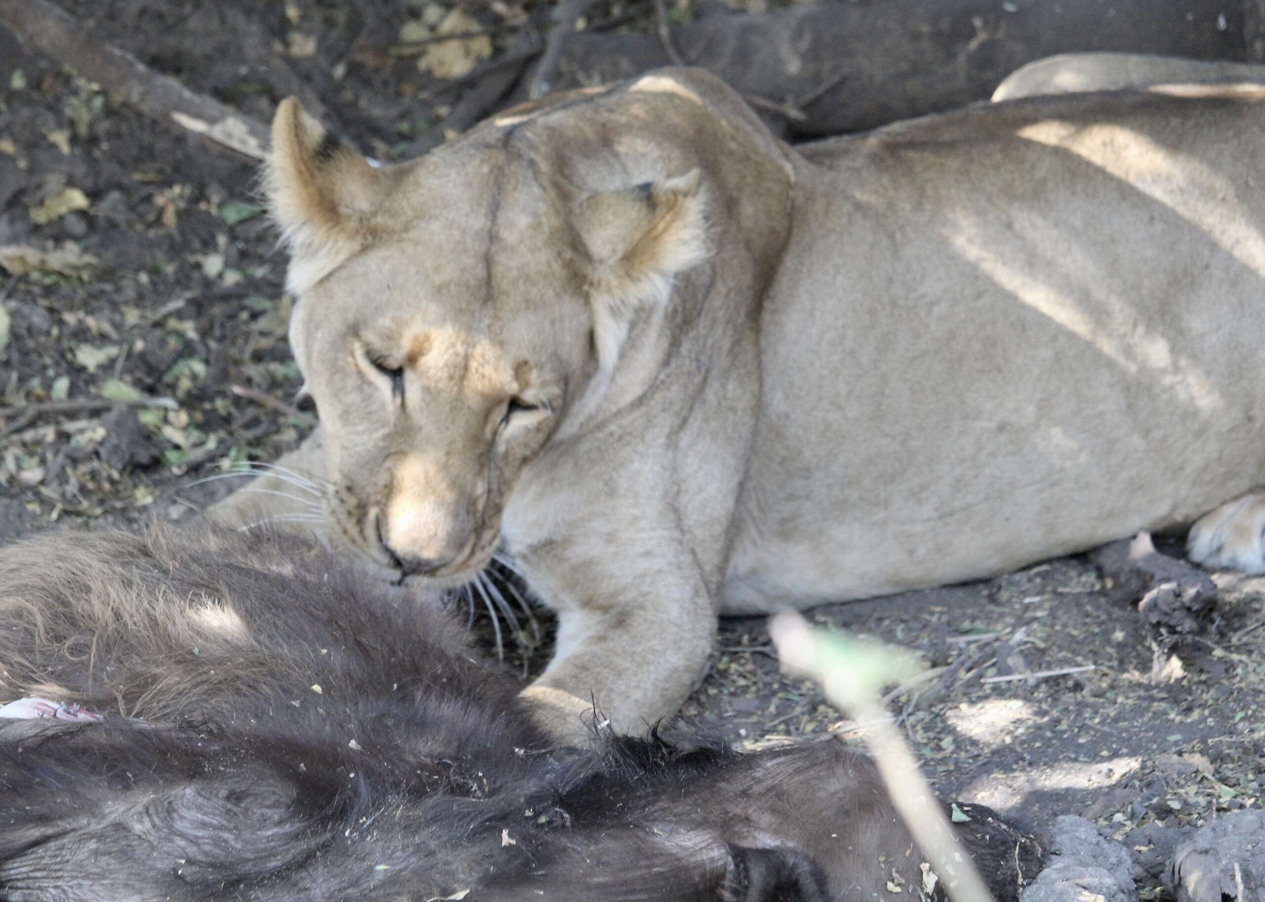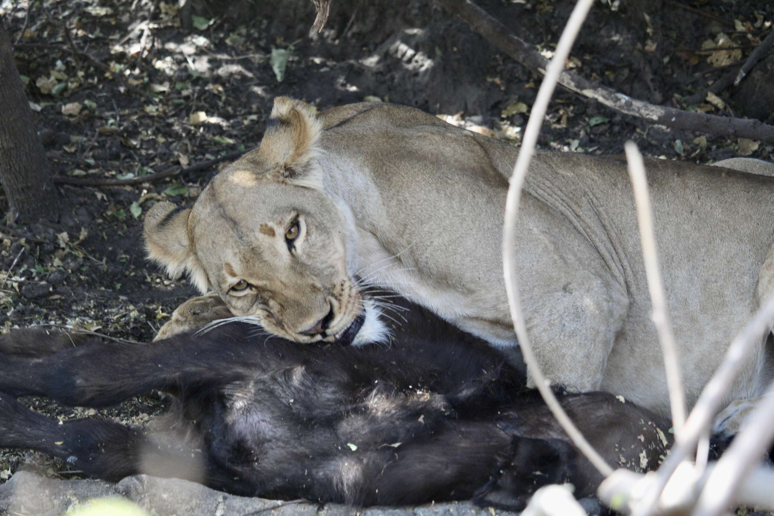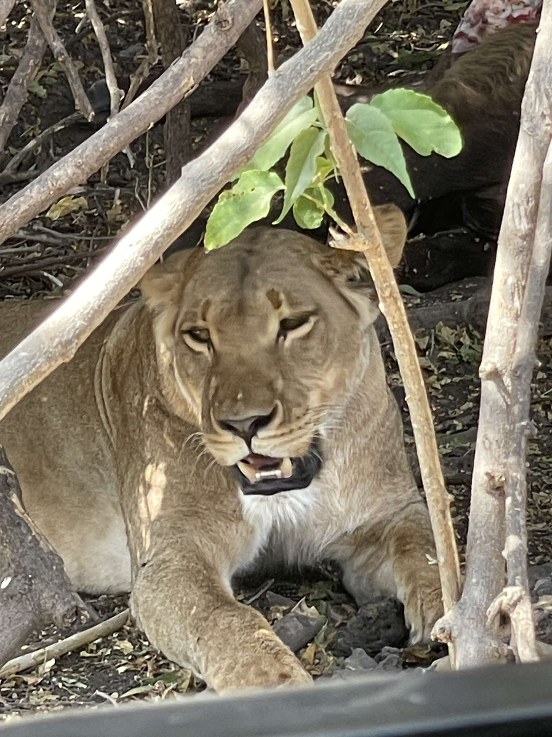 Quentin nous demande alors si on veut en profiter pour s’arrêter et manger un truc, mais nous, on a envie d’aller chercher le lion alors on repart alors que la jeep devant nous a disparu depuis belle lurette. Quentin voit à peu près ou le lion pourrait être. Et à moins de 5 minutes en voiture, que voit-on planqué dans un fourré ? Notre lion qui s’avère être une lionne, avec un kudu mort qu’elle veille jalousement à côté d’elle.