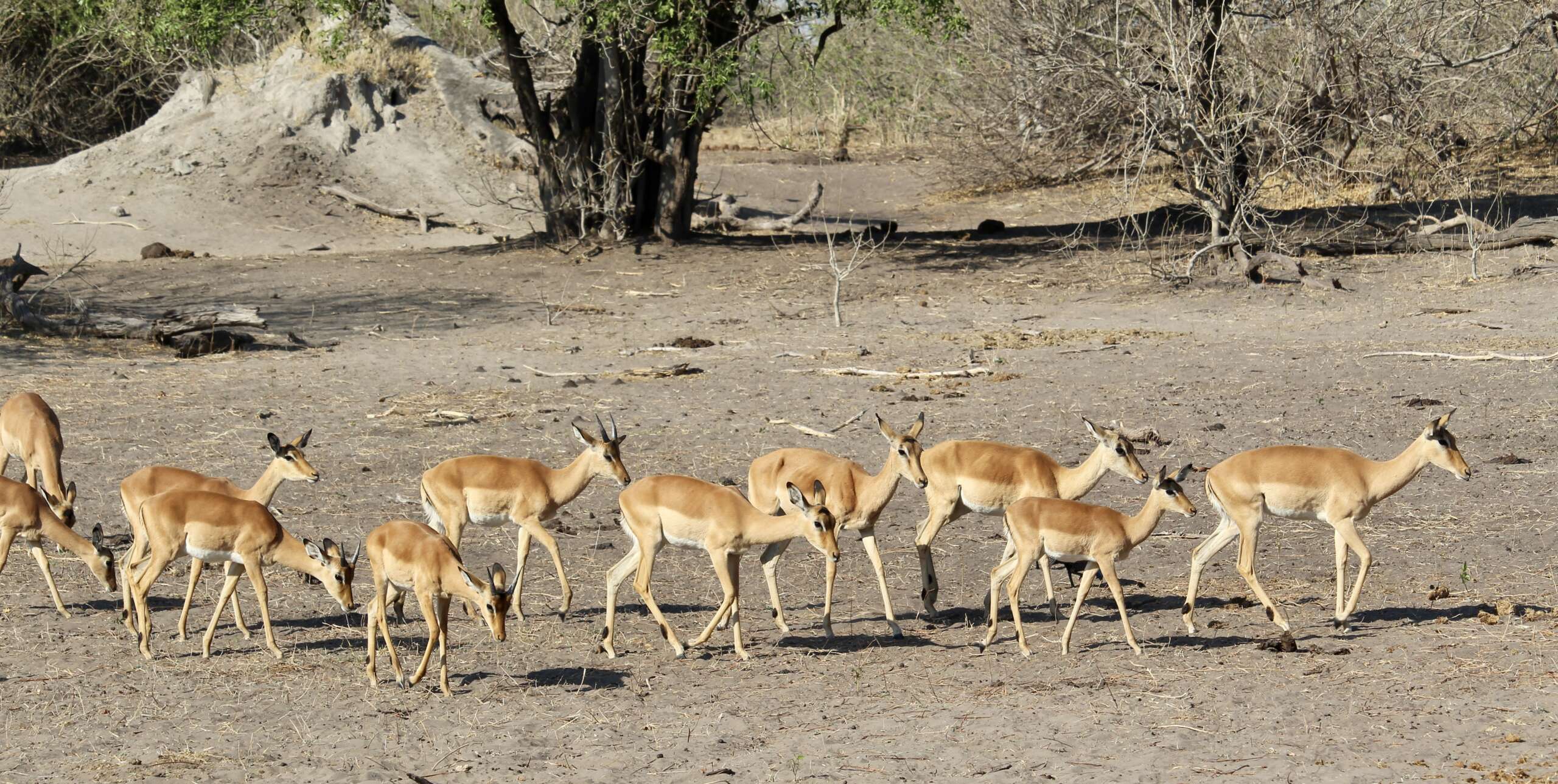 Finalement, lorsque la jeep de devant fini par ralentir aux abords d’un grand arbre mort on ne sait honnêtement même plus vraiment ce qu’on cherche. Quentin me dit alors que c’est le spot ou le léopard a été repéré. Et en effet au bout d’un moment, pas de léopard en vue mais la carcasse de l’antilope qu’il a tuée et cachée dans un fourré mais qu’il a à peine commencé à manger.