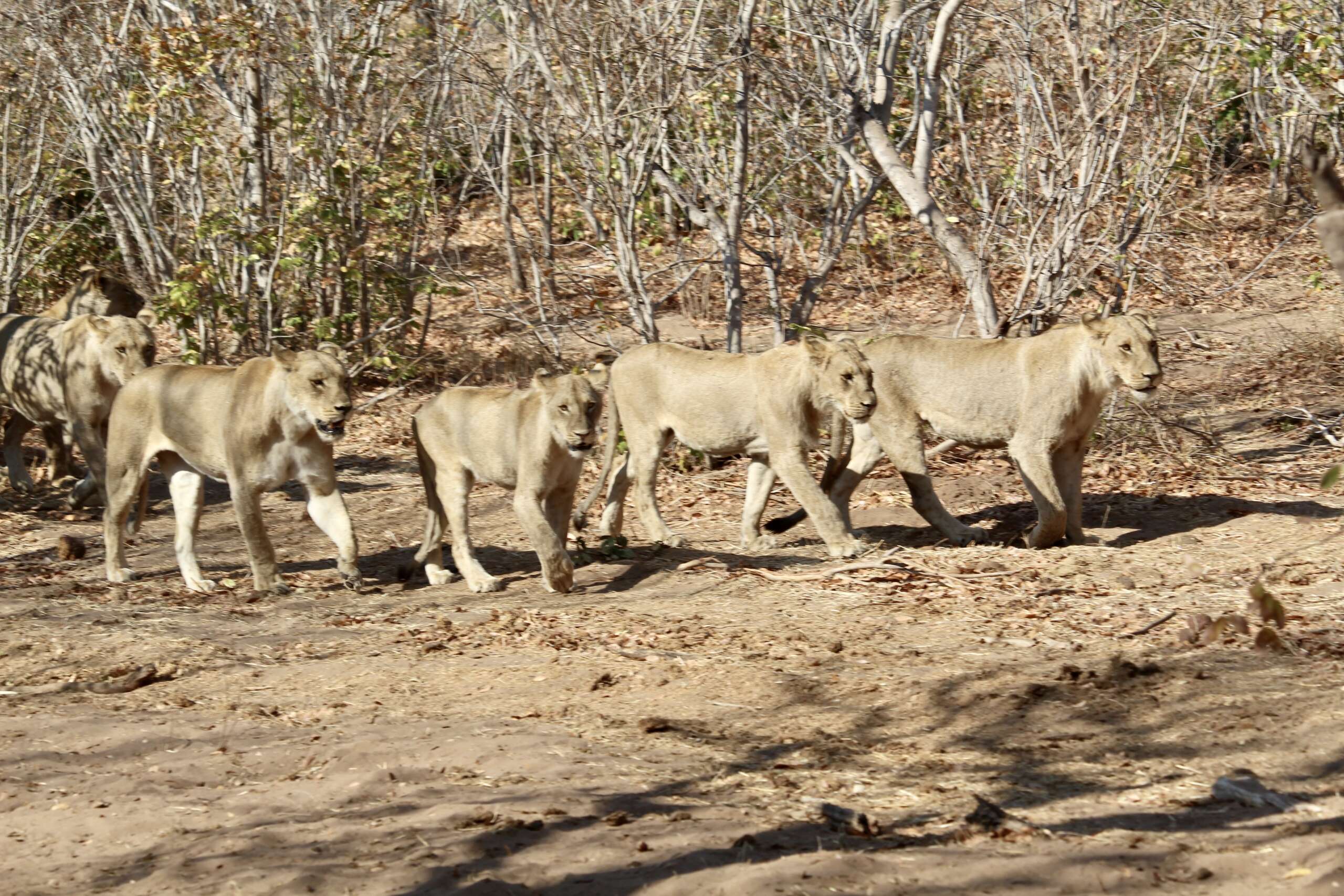 Et ceci signe la fin de notre manque de chance de la journée, ou plutôt, osons le dire, le début de « Félins’ paradise ». Du bush on voit surgir une troupe de 8 lions qui traversent la savane d’un air décidé. On les suivra tant bien que mal une quinzaine de minutes à un rythme assez soutenu à travers le bush, reculant régulièrement lorsqu’on est dans l’impasse pour essayer de se repositionner devant eux. Cela débouchera d’ailleurs sur une bonne gifle végétale que recevra Virginie (l’effet boomerang quand on passe trop près d’une branche).