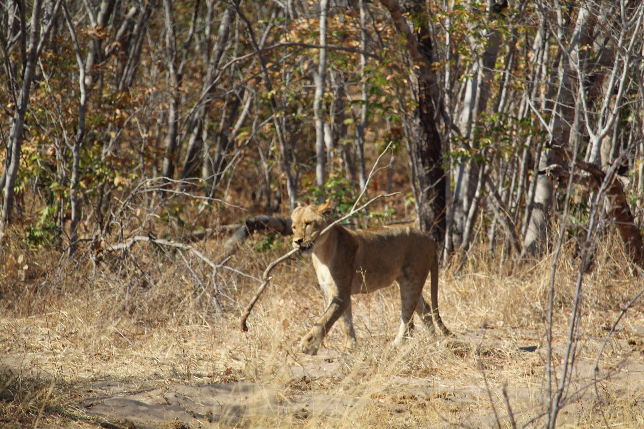 Pas étonnant que les lions parcourent assez facilement 20 km par jour, quand ils se mettent en mouvement c’est fluide et régulier, mais sans avoir l’air ça dépote. Un des lions qui était un peu à la traîne se ballade avec une branche dans la gueule. Pas bien compris le pourquoi à part que ça donne l’envie à Noah de lui lancer un bout de bois pour voir s’il va le lui ramener. Euh… pas sûr que ce soit une super idée.