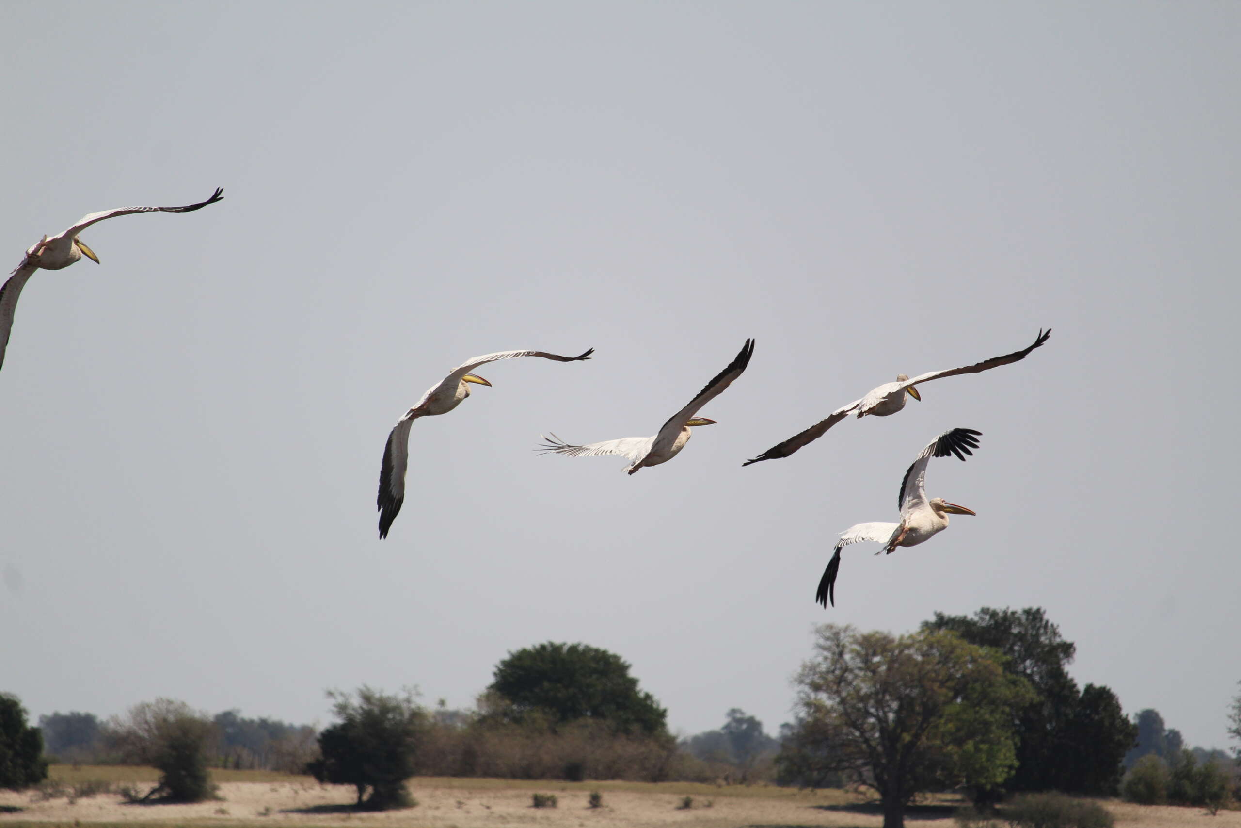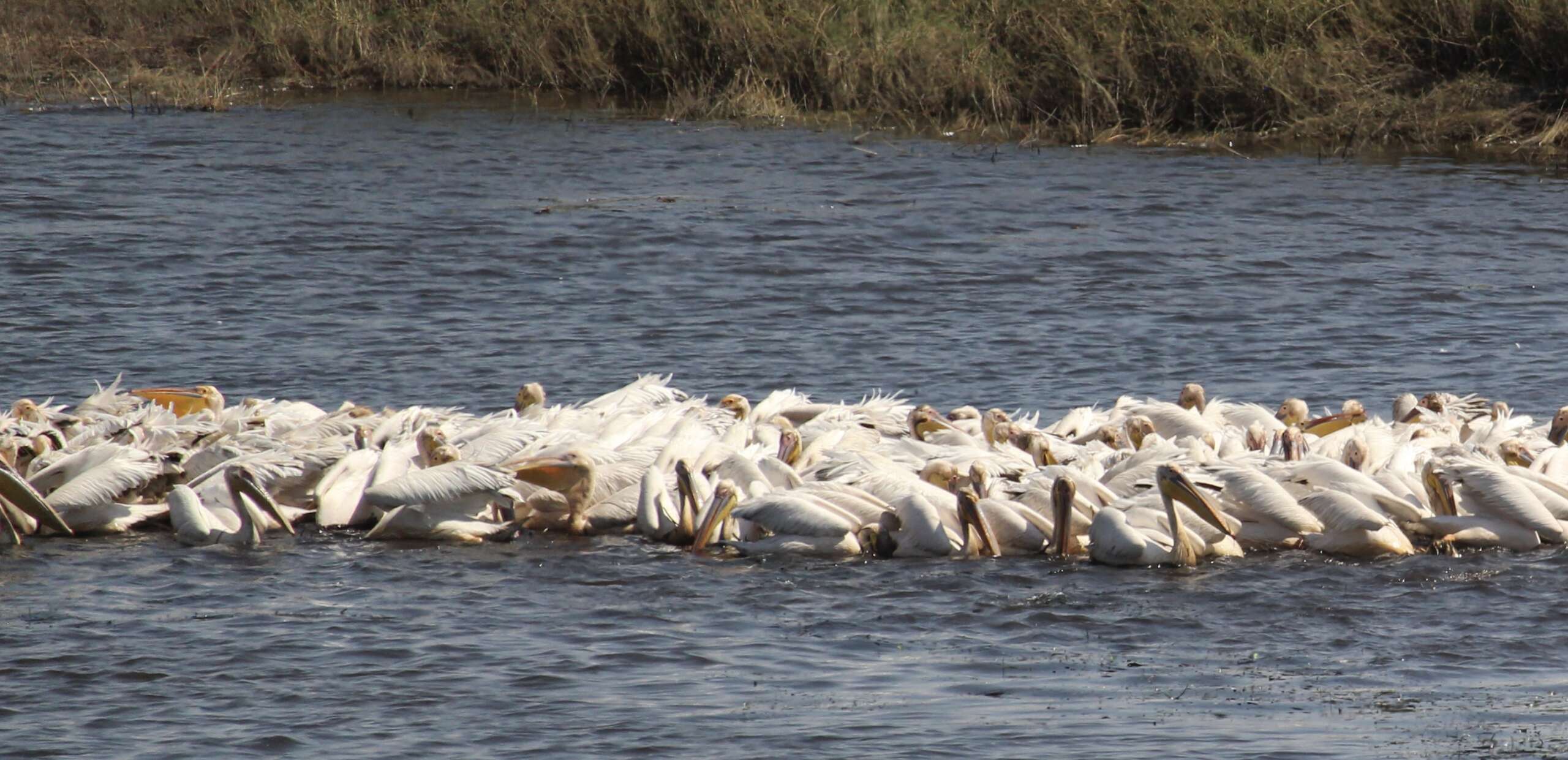 On longe maintenant à nouveau la rivière Chobe et on aperçoit un énorme groupe de pélicans dans l’eau qui se mettent progressivement à décoller ; puis un arbre à Vautour ; puis un troupeau de buffle caché dans le bush, au point que franchement on en vient presque à oublier cette quête de lions et léopards en train de casser la croûte vu que cela fait presque 1h30 qu’on roule désormais dans cet objectif.