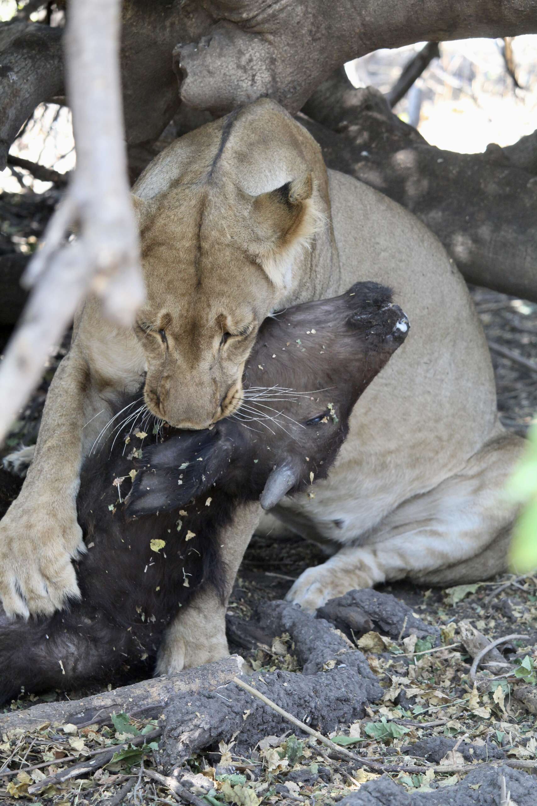 Noah est à la fois fasciné et dégouté. La lionne mange un bout du kudu, puis se déplace, attrape le kudu par la gorge et le tire un peu plus dans le fourré, puis le remange un peu. Entre la vue d’un peu de sang, d’os, le bruit de la mastication et de la langue râpeuse du lion sur la carcasse, Noah vire un peu au vert. D’autant qu’on va rester là une bonne vingtaine de minutes. A la fin, il continue toujours de regarder parce qu’il n’arrive pas à s’empêcher de le faire. Il est entre fascination morbide et dégout.