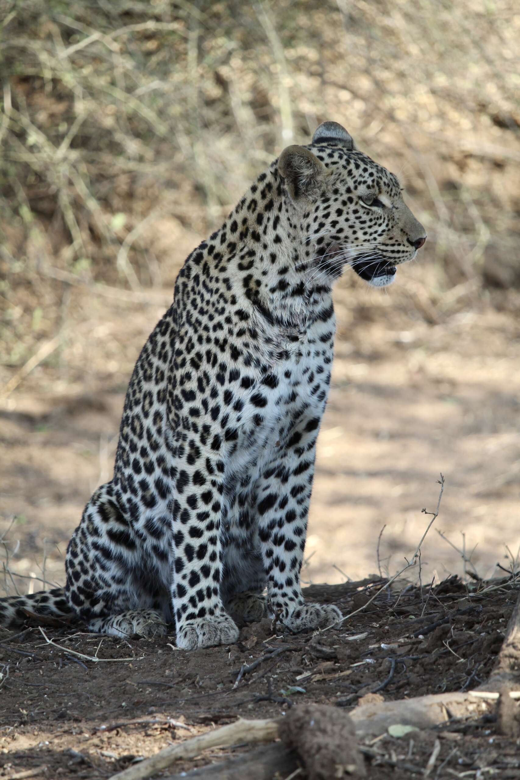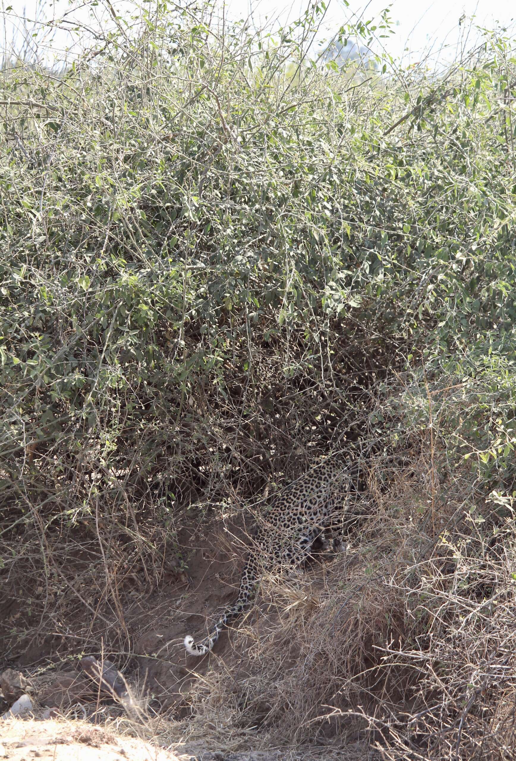 On observe seuls la scène. Puis le léopard se lève, se déplace se remet sur un nouveau spot, remarche et commence à partir dans le bush avant de se poser à un endroit improbable et impossible à approcher. Le voici devenu un point sombre ou son pelage le rend à peine discernable du bush. On pourrait passer 100 fois devant qu’on ne le verrait jamais.