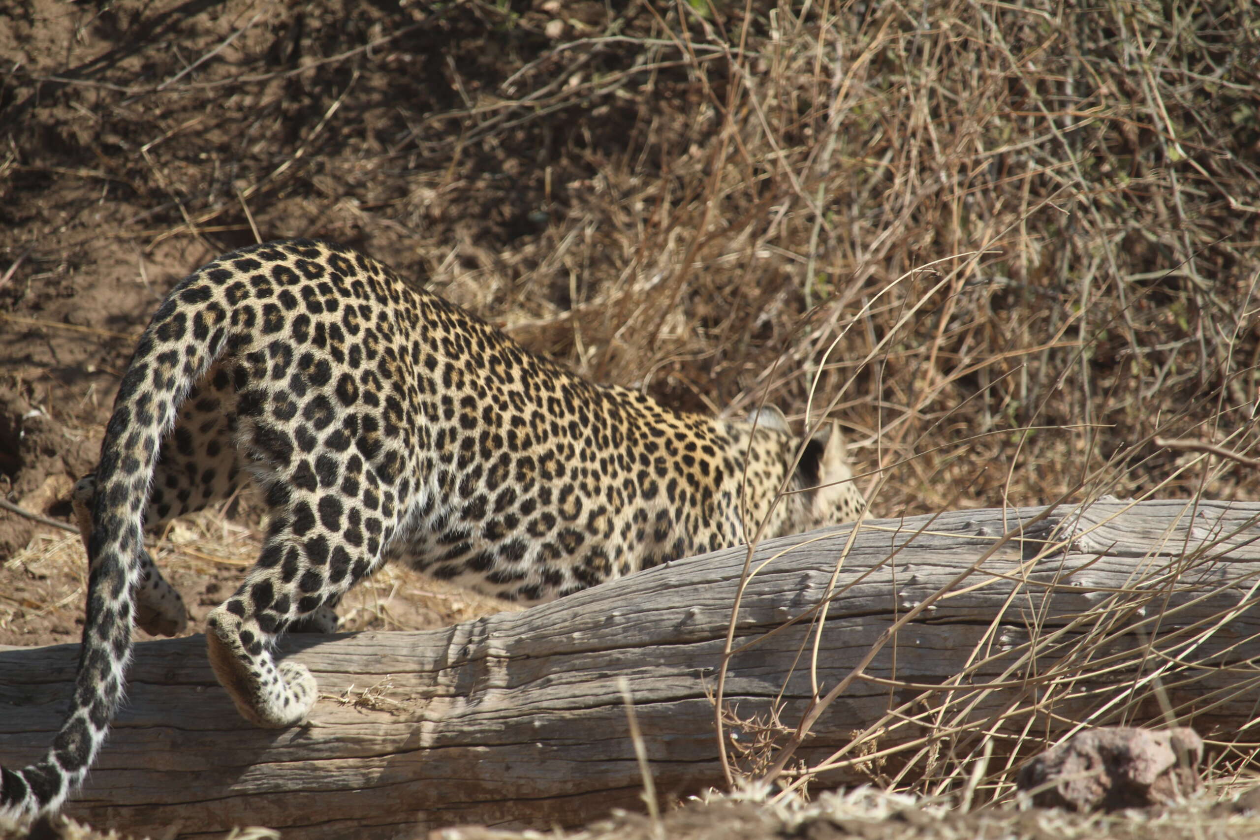 Un léopard n’allant jamais très loin de sa proie, Quentin pense qu’il a été dérangé dans son repas ou a été effrayé et qu’il ne doit pas être loin. On cherche dix bonnes minutes les alentours avec l’autre jeep mais on ne voit rien.