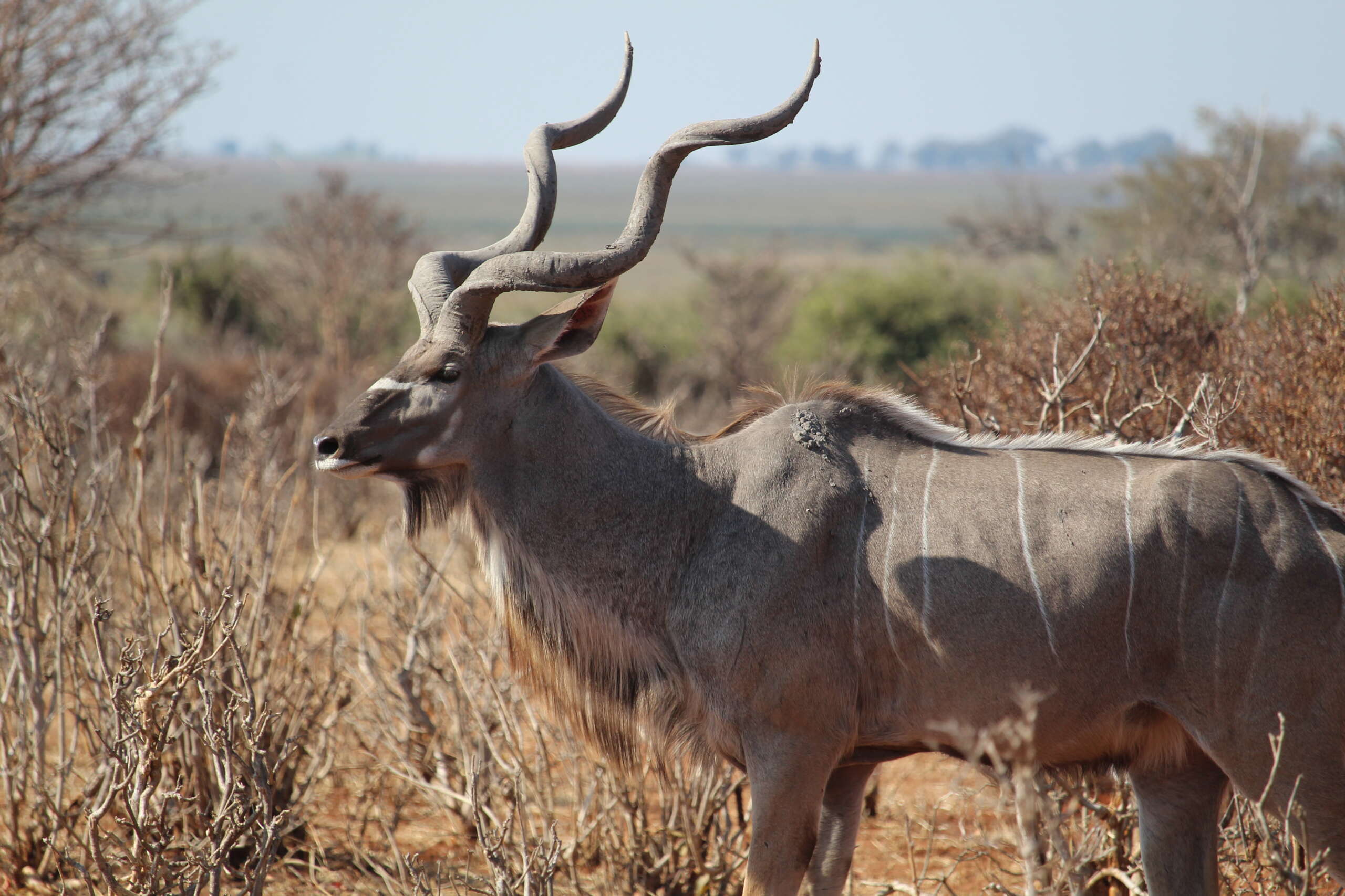 En parlant de troupeaux, nouvel appel de radio safari. La troupe de lions aurait été aperçue ; Quentin nous demande si on veut y aller sachant que c’est un peu loin. Ben oui, pourquoi pas ! Et on repart mais à un rythme plus normal cette fois. Rapidement on s’enfonce dans le bush dans une partie de la réserve qu’on n’a pas encore explorée. Les animaux se font de plus en plus rare dans cette partie. Sans points d’eau, ils sont beaucoup plus dispersés et donc… on ne voit rien.