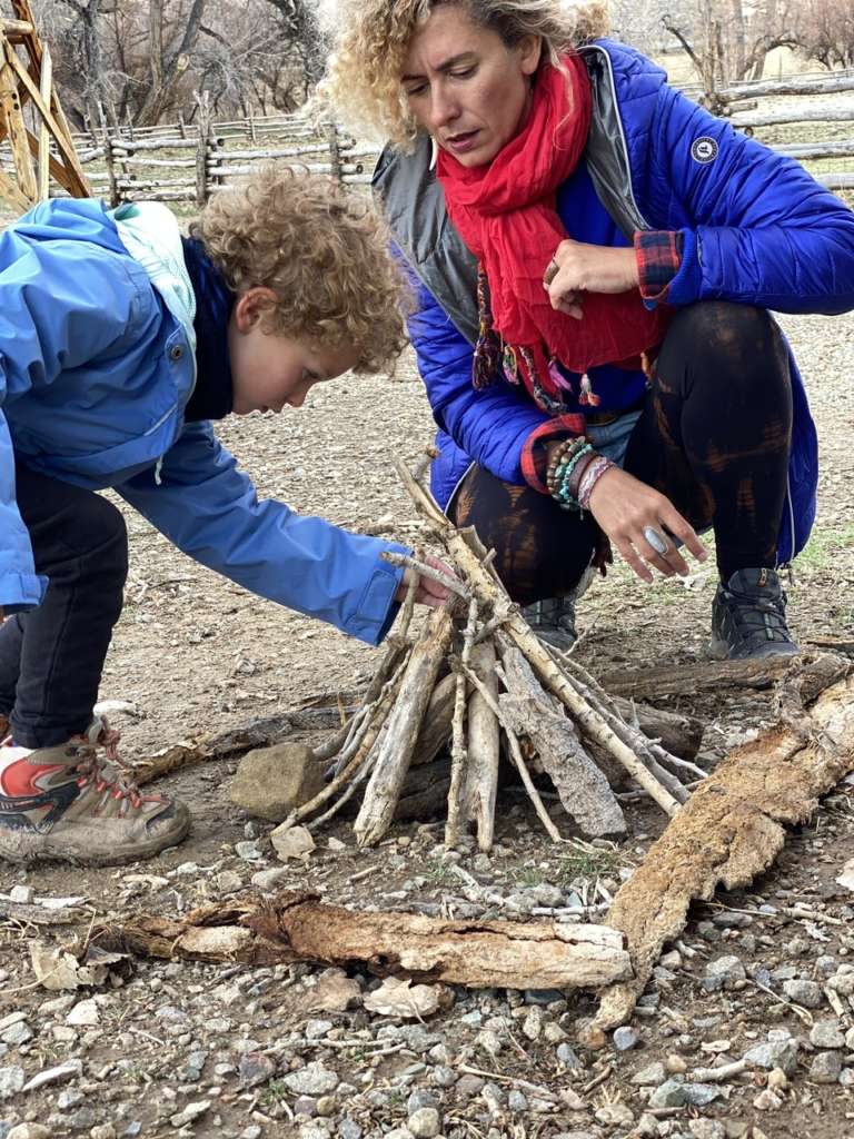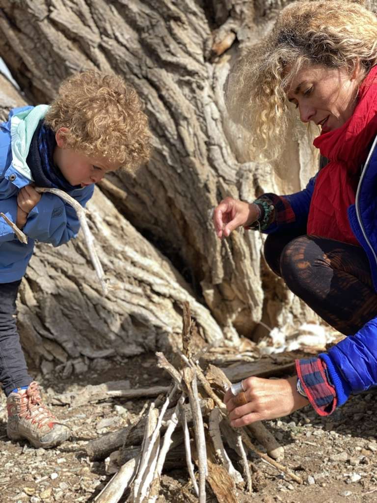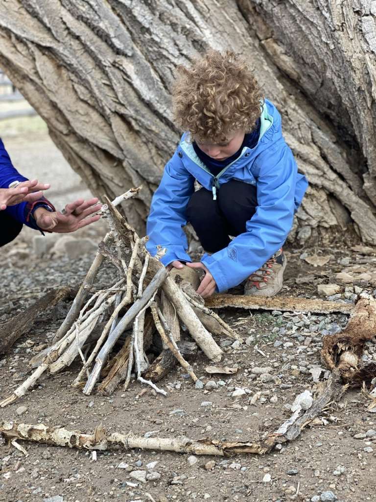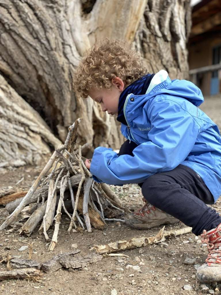 Très rapidement Noah prend le lead et se contente désormais de distiller à Virginie ses ordres. Elle doit aller chercher des brindilles, puis les disposer comme ceci de manière à respecter son tracé, et il l’a corrige quand cela ne correspond pas exactement à ce qu’il imagine. Aïe aie aie. Les chiens ne font pas des chats on dirait.