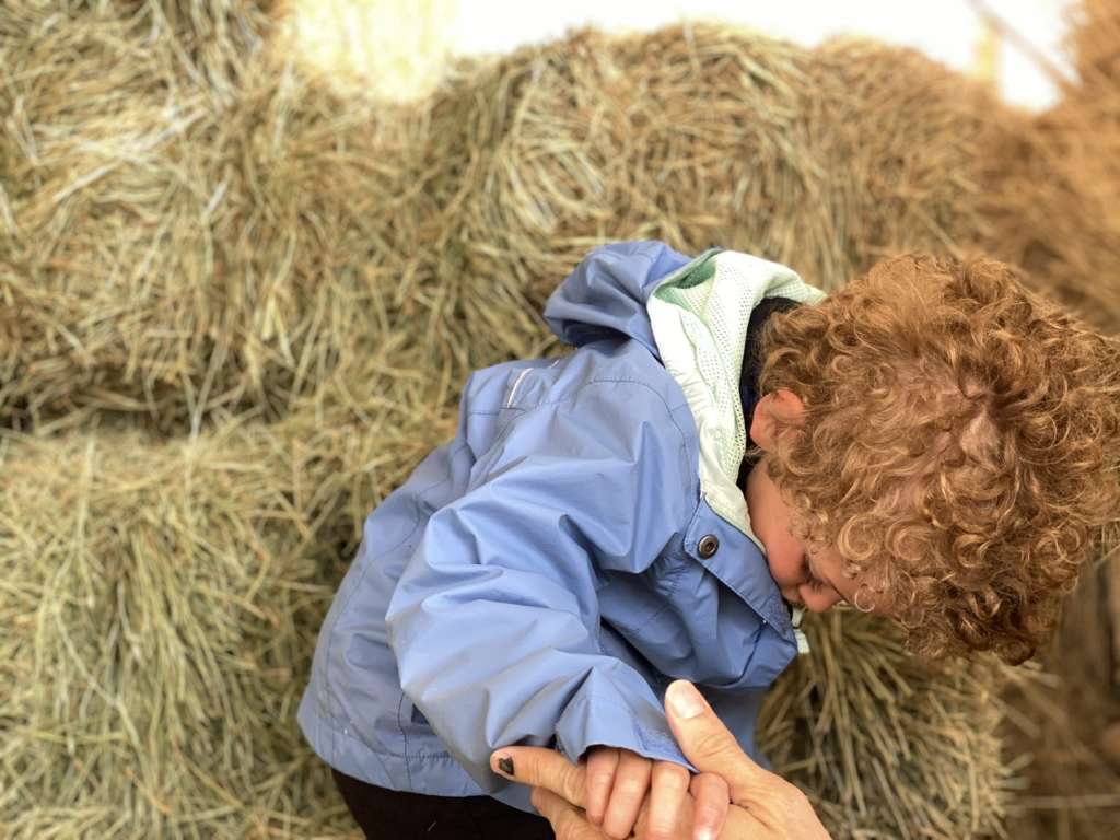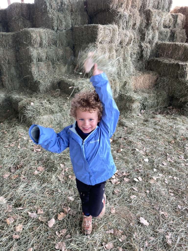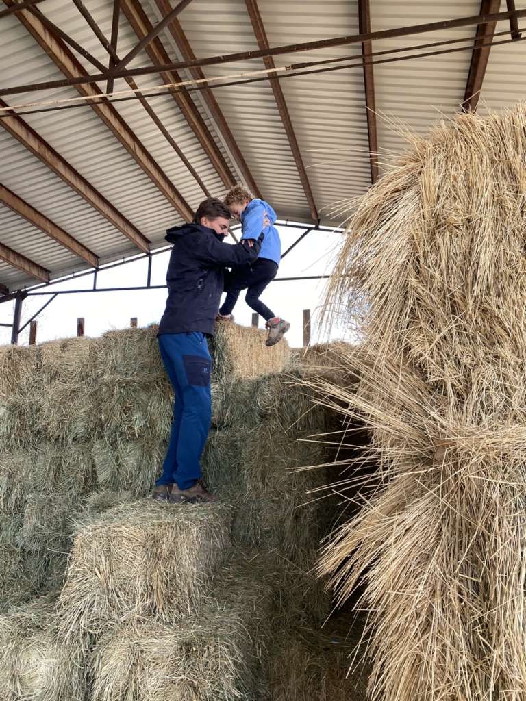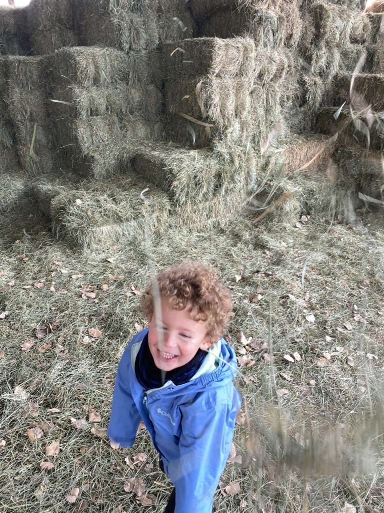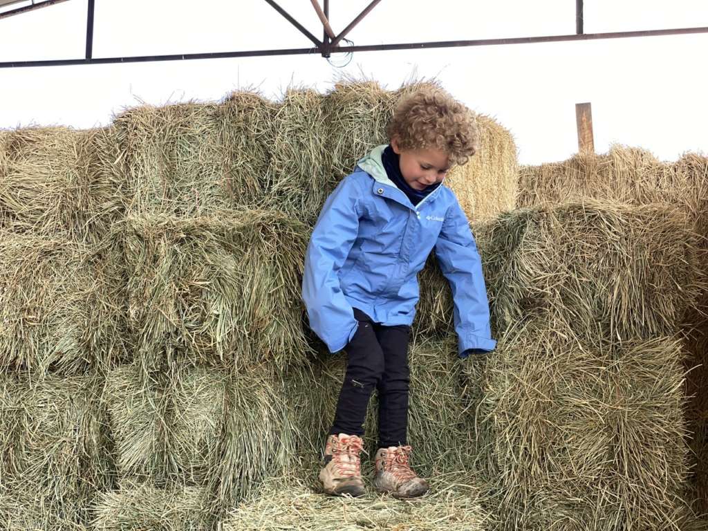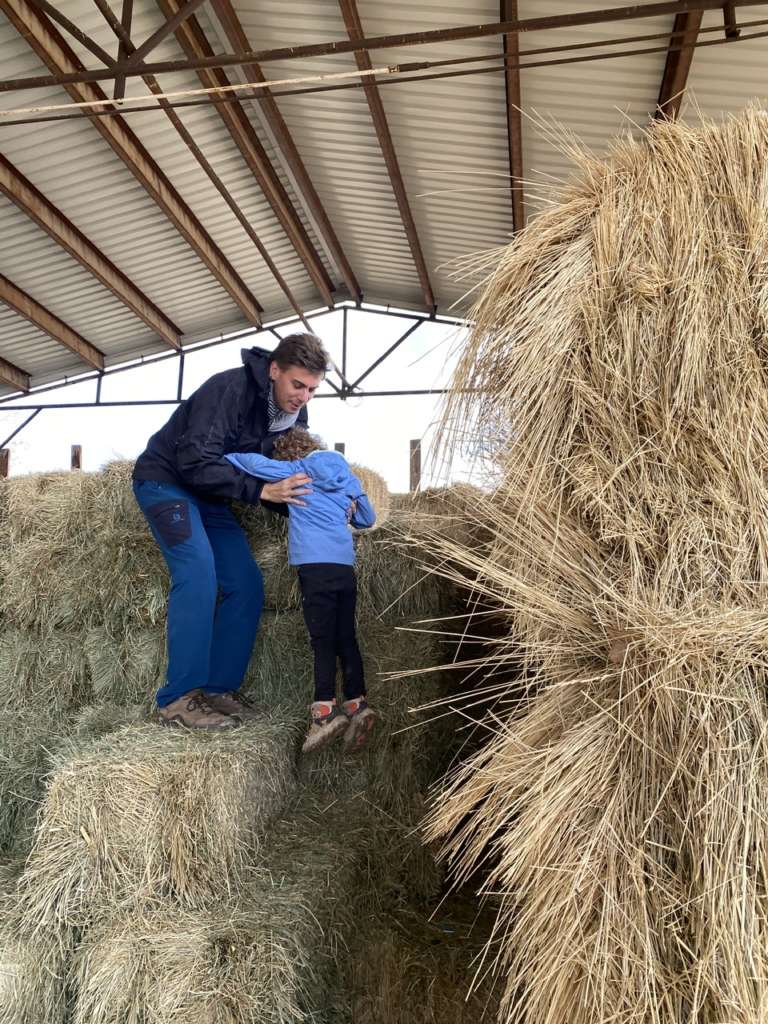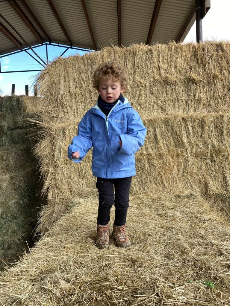 Puis Noah repère des bottes de foins en face de l’enclos des agneaux et ne résiste pas à l’envie de monter tout en haut et jouer dedans.