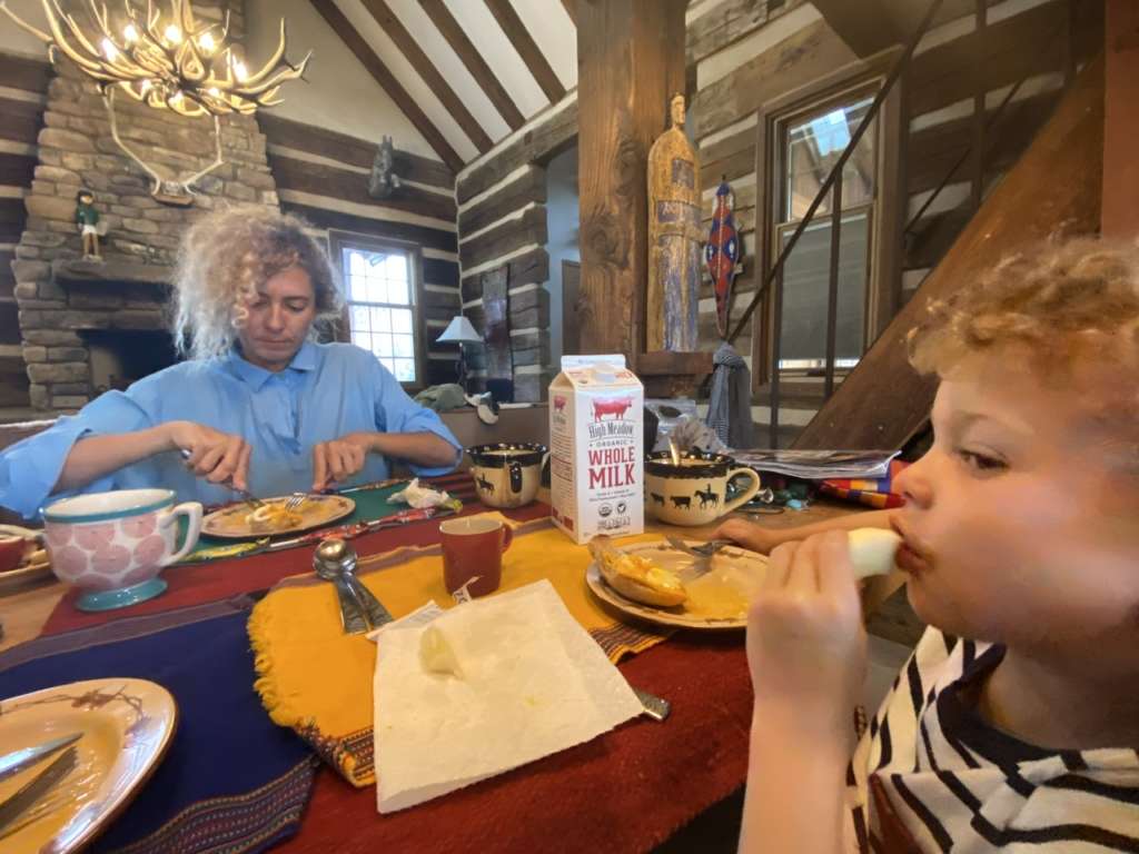 Dîner au Farm Bistro, endroit écolo de la région qui s’approvisionne de produits locaux, puis retour tranquille juste avant la nuit pour profiter du coucher de soleil sur la route, puis d’un bon feu de bois dans notre super maison.