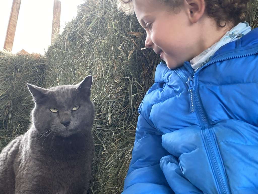 Il y fait la rencontre d’un des 2 chats de la ferme, Bear Bear. Et bien ce gros chat, qui pèse pas loin du poids de Noah est le plus affectueux des chats qu’on n’ait jamais rencontré. Désolé Anouk et Jenn, mais vos chats sont beaux, mais franchement antipathiques (ce sont des chats, quoi). Et désolé les Ledieu, mais celui-là, il est encore plus câlin que les votre. En moins de temps qu’il en faut pour le dire, voici Bear-bear qui sur simple appel de Garry, sort et vient câliner Noah.