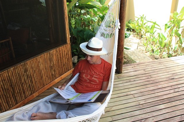 Résultat, l’hôtel se transforme en meilleur point d’observation de la jungle avec notamment un gigantesque arbre ou les toucans ont élus domicile et qui viennent en nombre tôt le matin et dans l’après-midi dès que la chaleur tombe un peu. En face, sur un autre arbre, des perroquets verts viennent de temps en temps, et plusieurs fois par jour, un couple de macaos (les magnifiques grands perroquets rouge) survolent l’hôtel en suivant la côte.