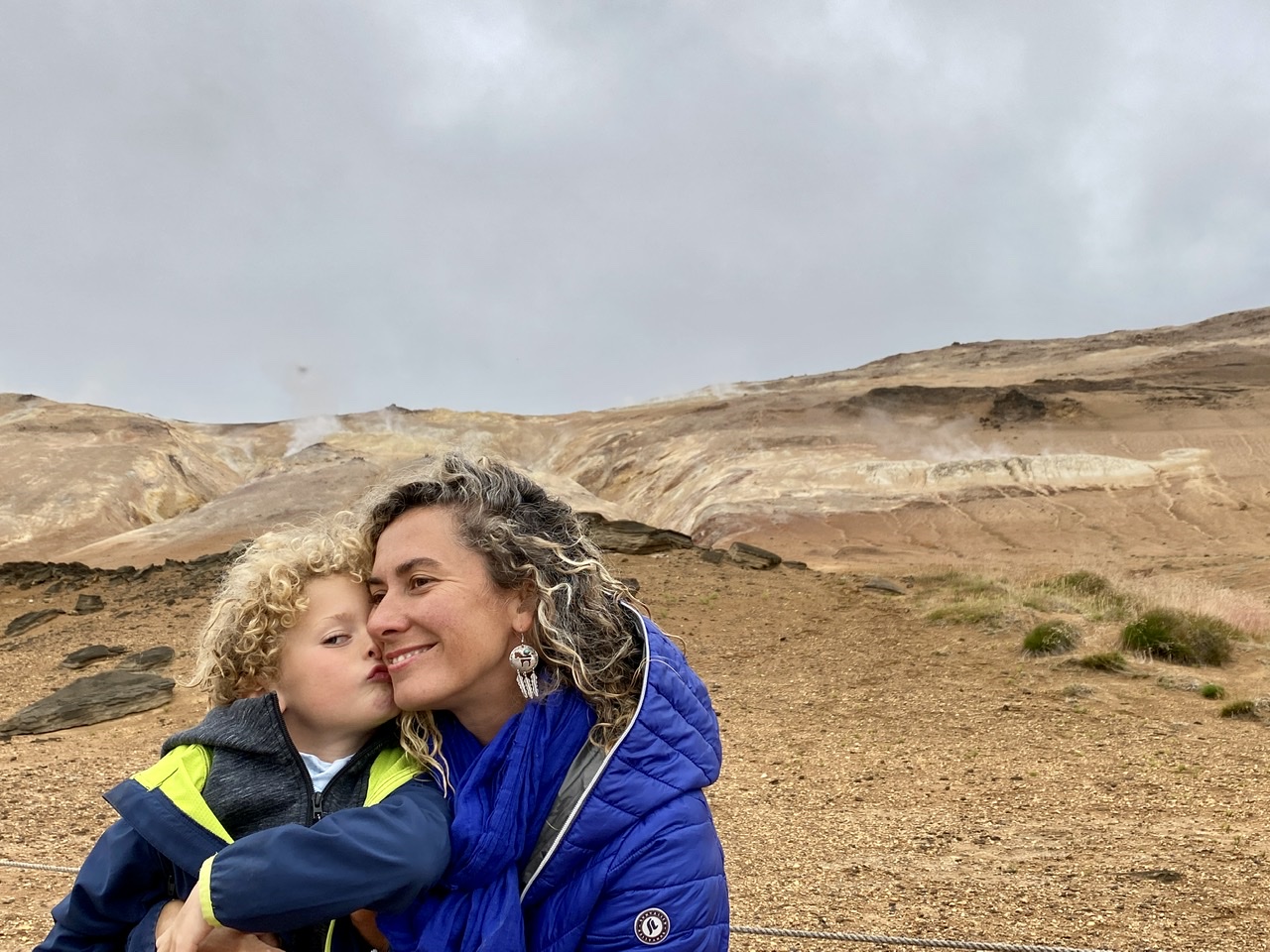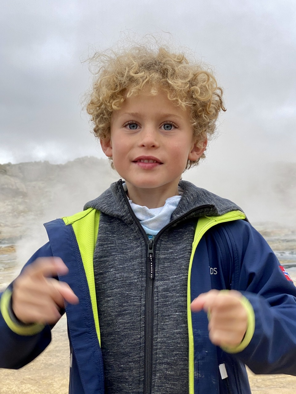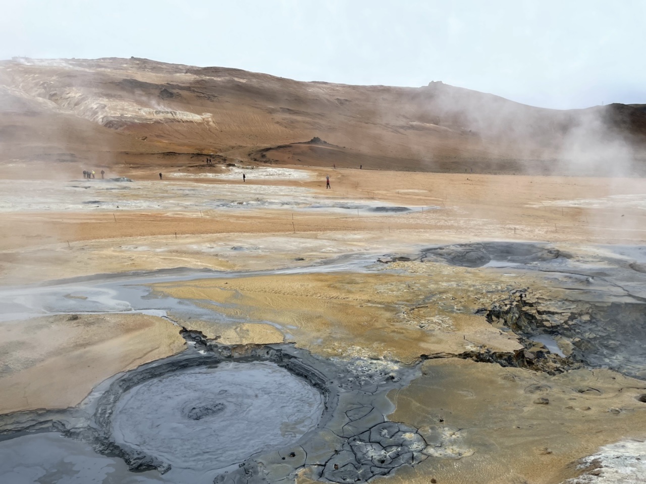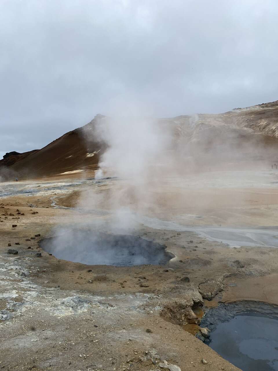 Alors autant le dire tout de suite, le cœur net, on a l’a eu, les chaussures nettes, c’est une autre histoire. On les a plus déguelassées en 15 minutes que depuis les 17 jours qu’on a passé en Islande jusqu’à présent. La faute à cette fichue zone géothermale où les sols chauffés à 60 degrés provoquent toutes ces marmites en ébullition qui dégoulinent et génèrent un sol boueux bourrés de minéraux divers et variés qui ont une propension certaine à boucher tous les interstices des rainures de nos semelles avant de se solidifier en une pâte indécrottable, tant est si bien qu’on devra changer de chaussures avant de remettre les pieds dans la voiture.