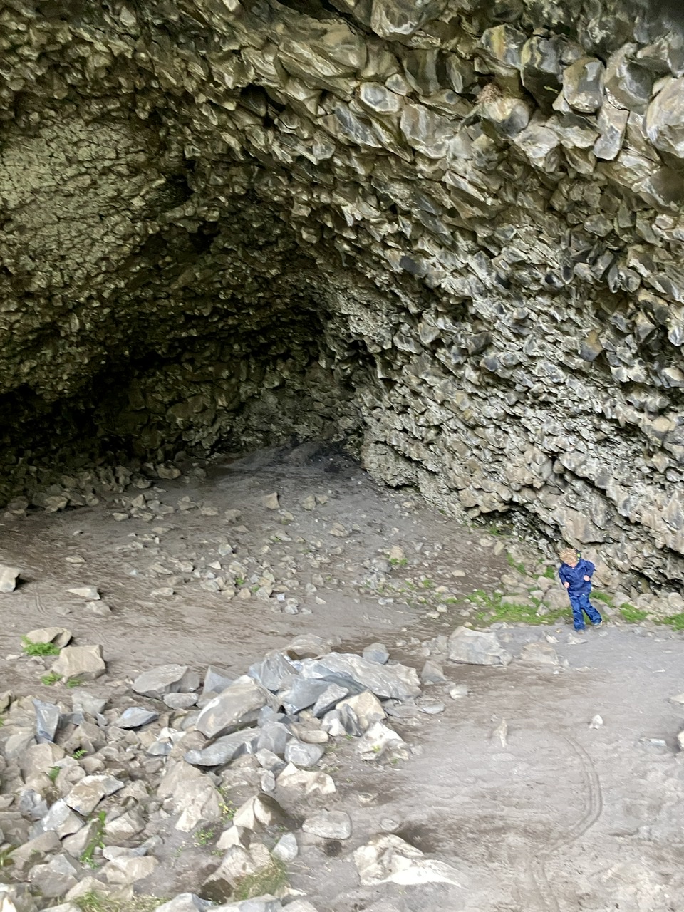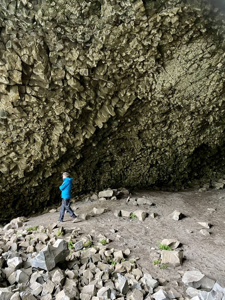 Dans le dédale de ces formations, on atteint une gigantesque grotte d’une dizaine de mètres de haut et d’une vingtaine de large en pierre de lave cristallisée qui m’inspire modérément confiance au vu du nombre de morceaux de roches tombés du plafond qui jonchent le sol.