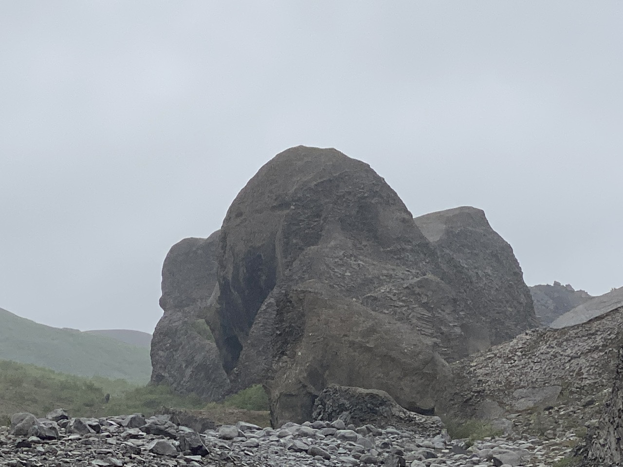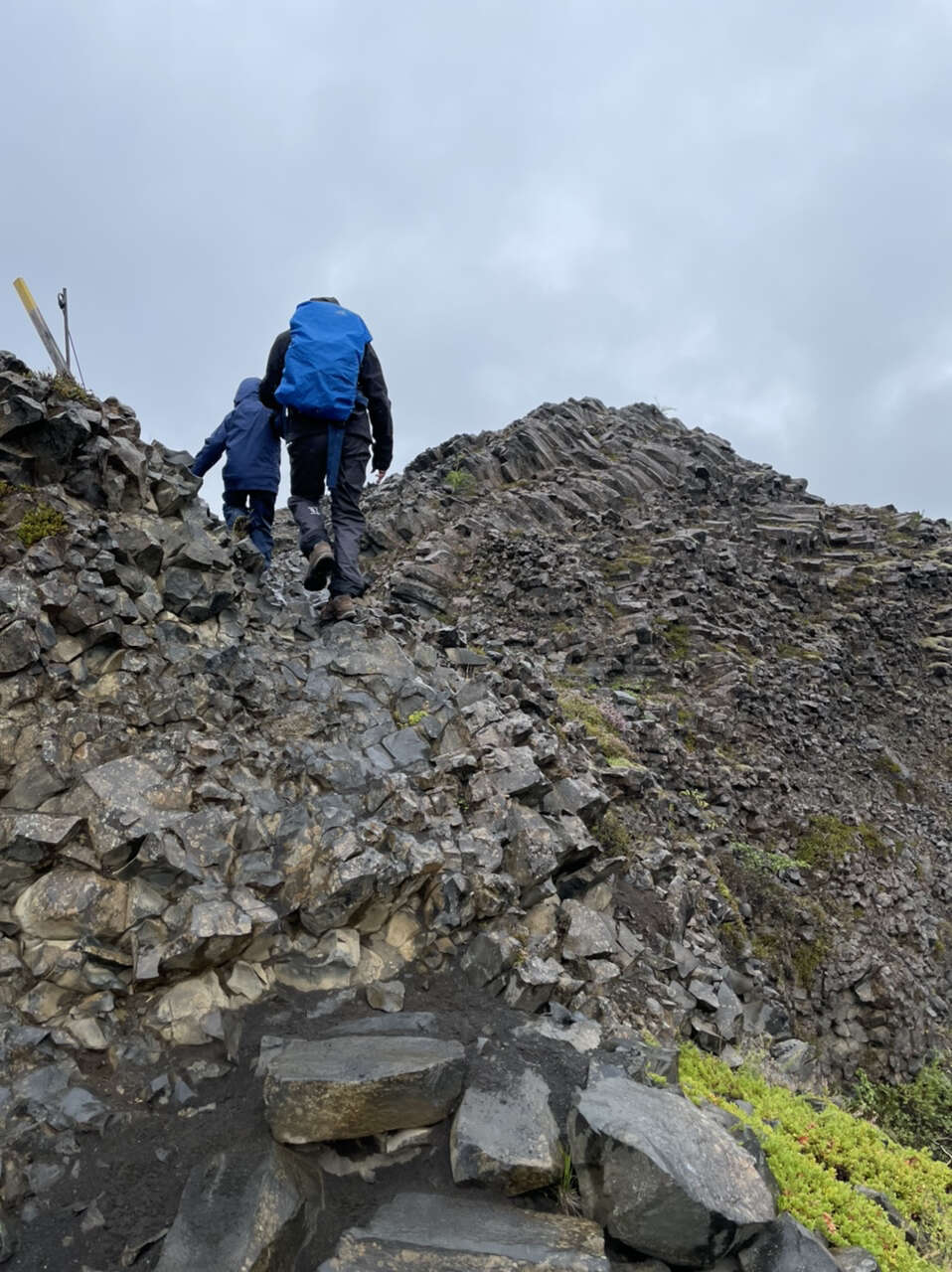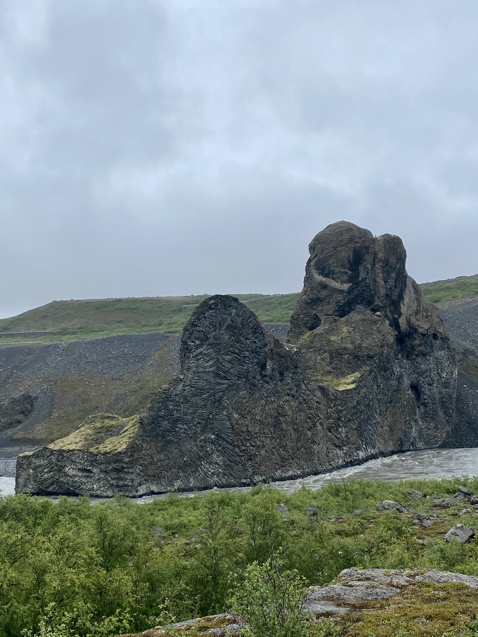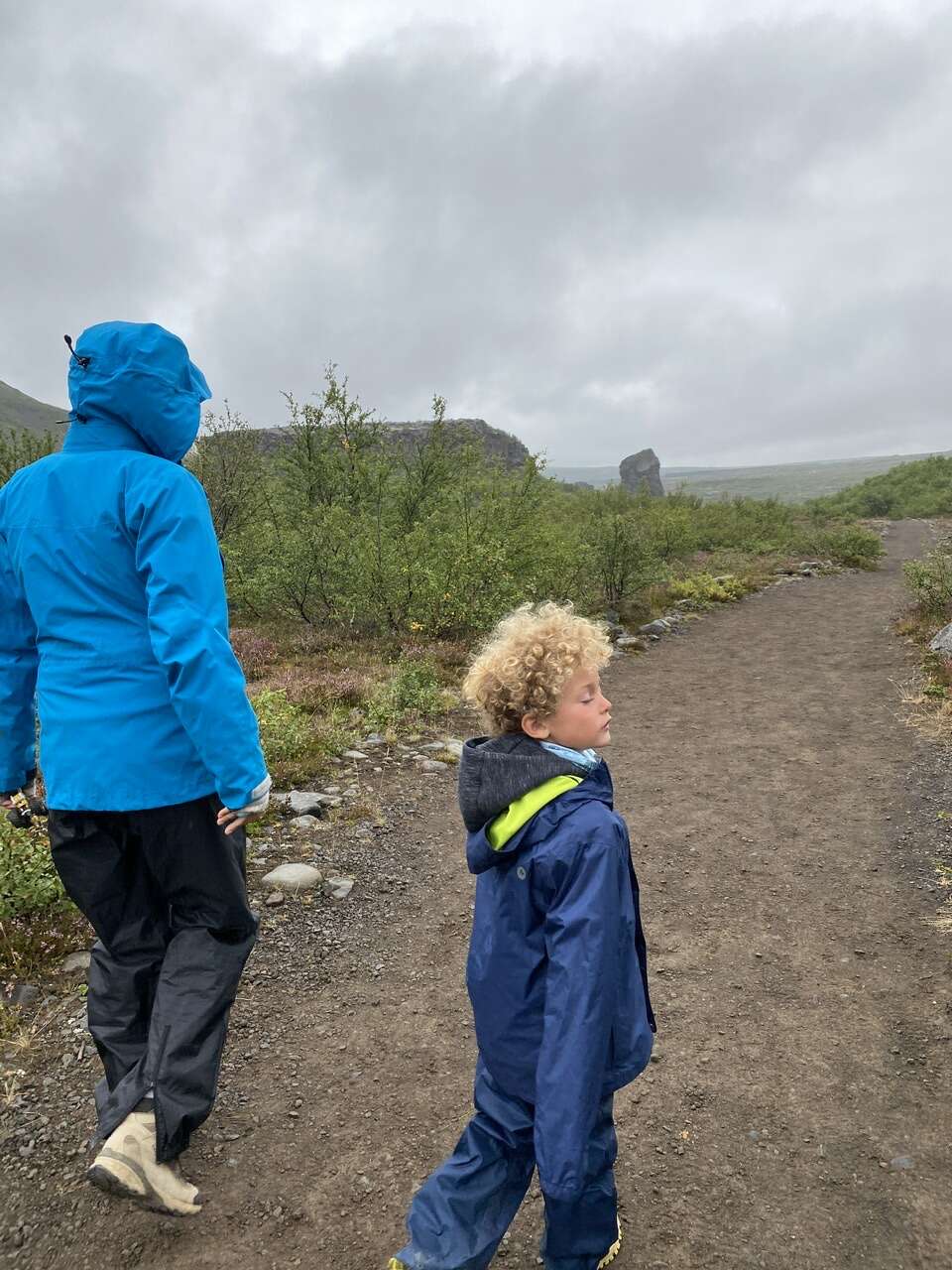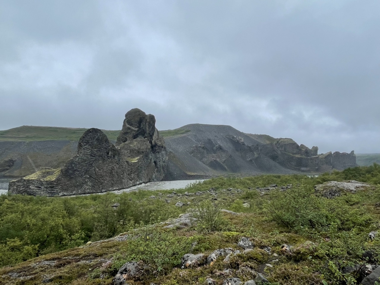 Finalement dans cet océan de pluie, à l’approche du canyon d’Asbyrgi, le temps se découvre « un peu » et pour avoir notre dose de dopamine (on marche plus de 10km par jour ce qui créé presqu’un manque lorsqu’on ne fait rien), nous voilà k-ways et pantalons de pluie vêtus, prêts à arpenter Hjodaklettar, ce qui en Islandais signifie quelque chose du genre la montagne qui parle.