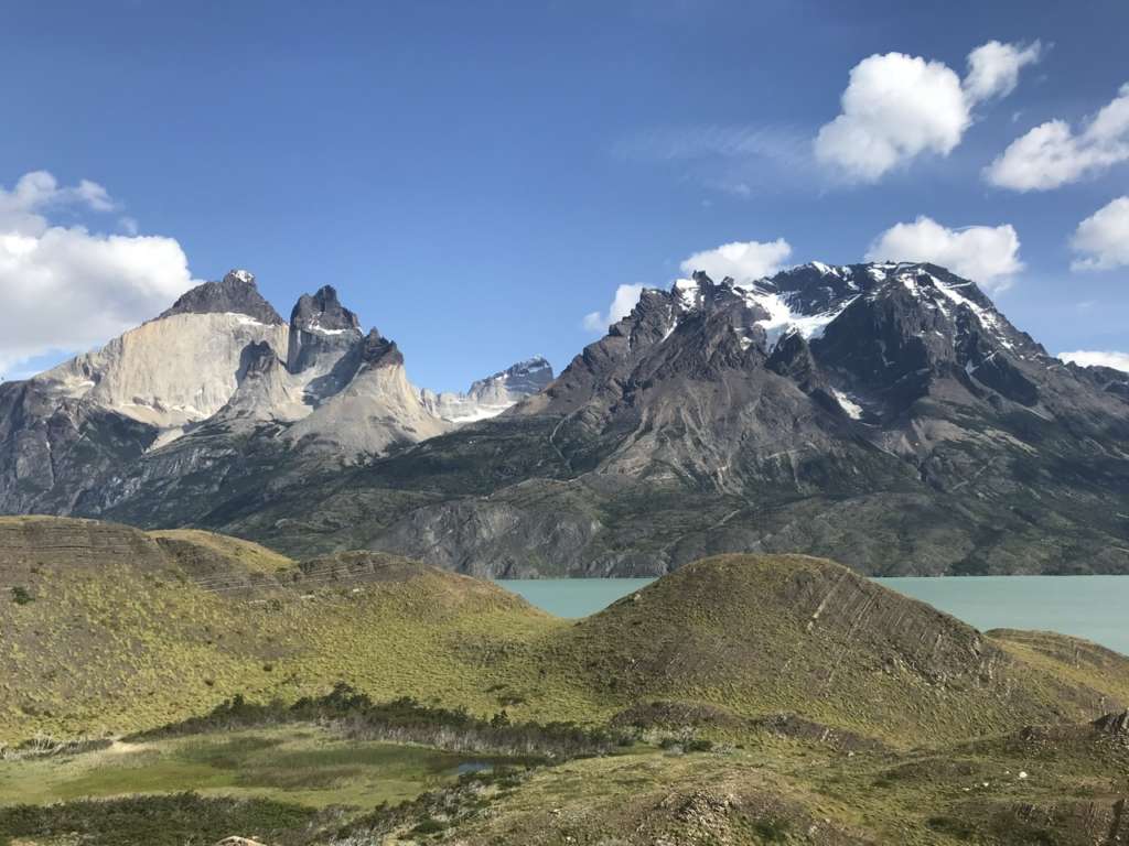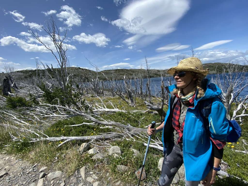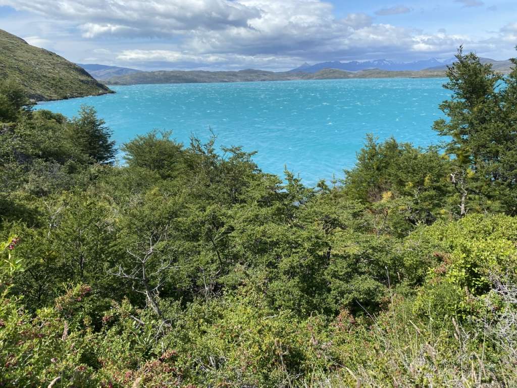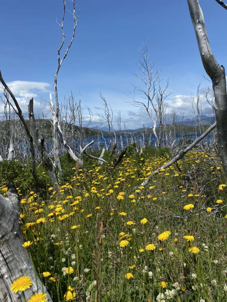 La rando de 8km jusqu’au camp des italiens est en tant que telle grandiose. On longe le lac Pehoe d’un bleu tantôt turquoise, tantôt profond d’un côté, et on le massif Paine de l’autre,  Les Cuernos, « la montagne en forme de Cornes » en face de nous en ligne de mire . On traverse tantôt la steppe, tantôt la pampa, on passe au milieu de forets qui ont été brûlées et dont les troncs blancs contrastent avec les fleurs jaunes et le bleu turquoise du lac.
