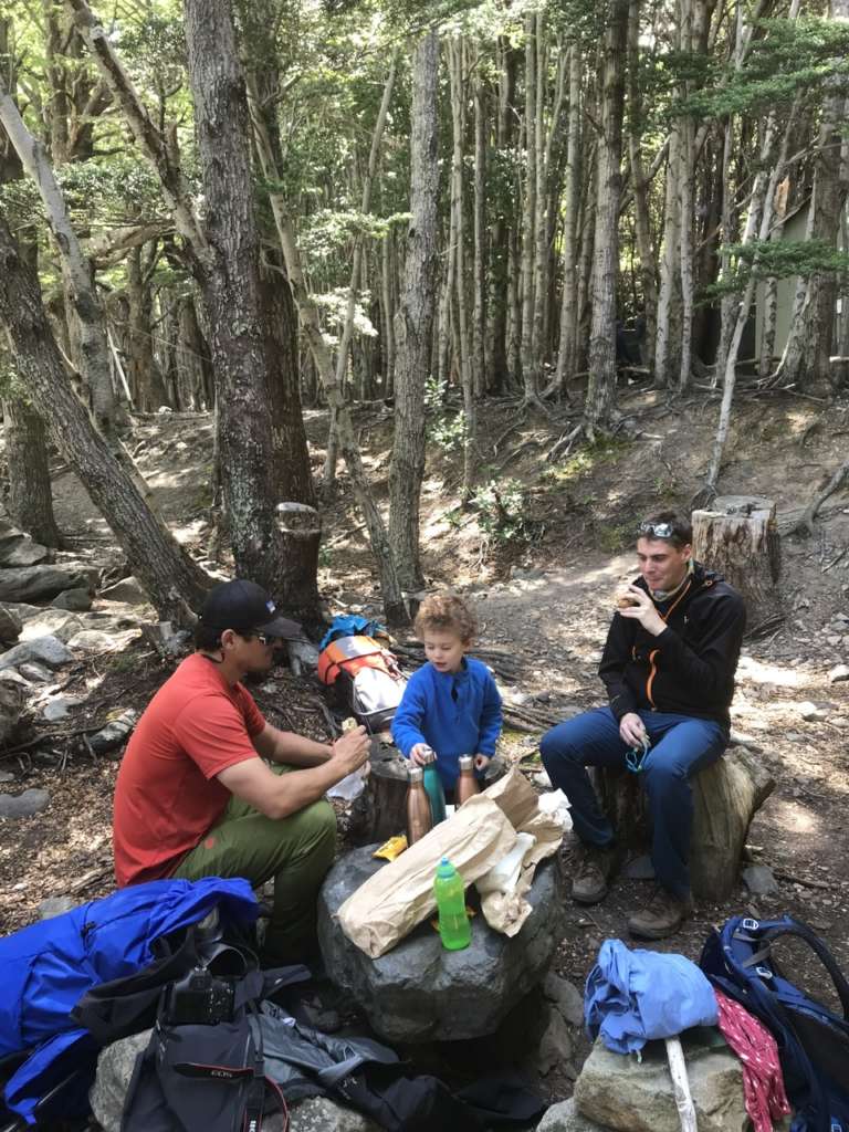 20 min plus tard, on a enfin traversé le lac et à l’approche du débarcadère, la mer se calme. Il est presque midi, on change Noah au refuge parce qu’il est quand même bien mouillé et on se met en route.