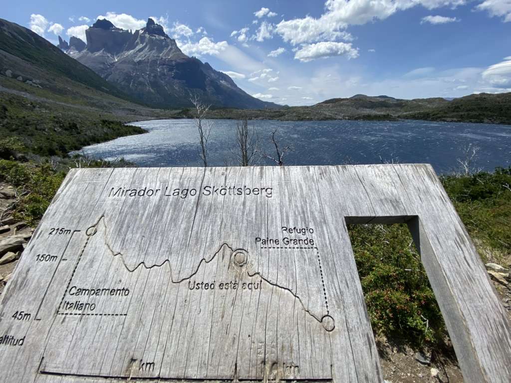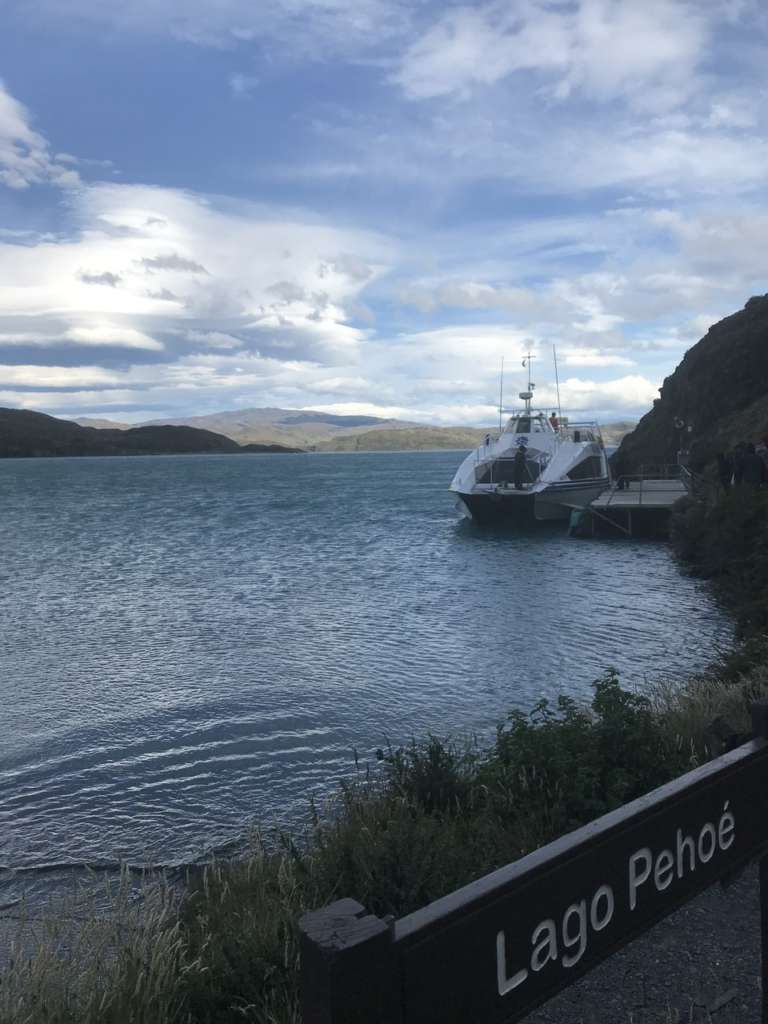 On avait senti Gustavo assez soucieux qu’on ne s’attarde pas trop au mirador. Arrivés à l’embarcadère on comprend mieux pourquoi. Un seul bateau, 2 horaires le matin (9h et 11h) et principe du premier arrivé, premier servi. Quand le bateau est plein, si tu n’es pas dedans, tu es marron. Comme c’est le point de départ du W, le circuit le plus fameux du parc qui parcoure les Torre sur 120 km et 4 à 6 jours de rando, il y a du monde. D’ailleurs notre rando du jour c’est justement le deuxième bras du W (On l’appelle le W parce que la rando trace justement un W). Le départ du W, c’est le point en bas à gauche de la lettre W. Le premier jour, tu fais un aller et retour vers la glacier Grey et tu reviens au départ du W (on l’avait fait il y a plusieurs années avec Virginie). Aujourd’hui, on fait l’équivalent du 2ème jour du W.