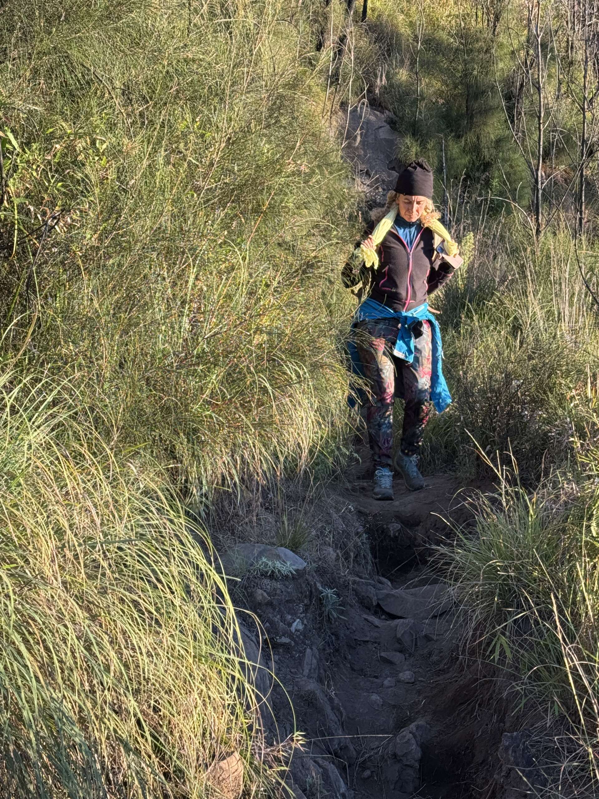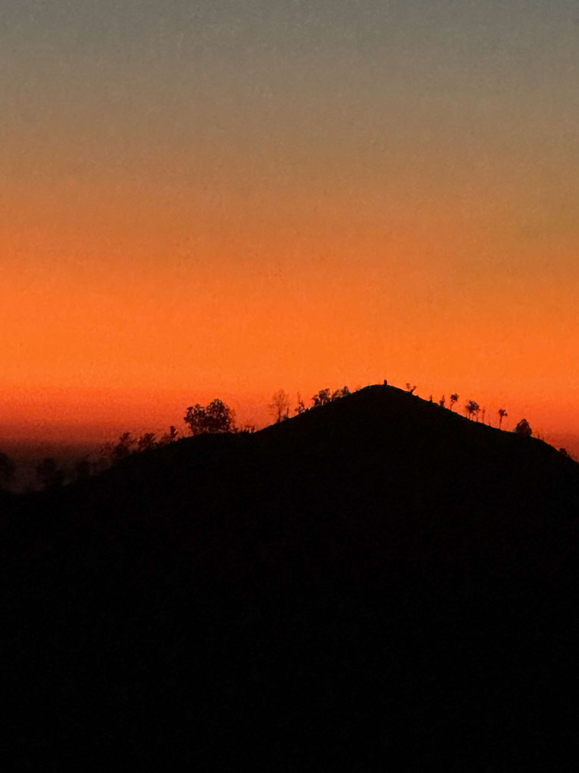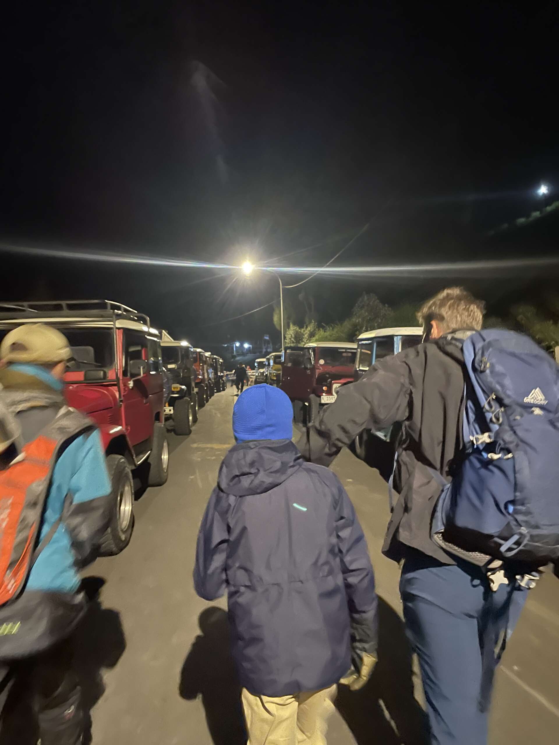 Bon, nous on a préféré marché comme des mulets, et donc on arrive à Penjakan 2 un peu avant 4h du matin. Et là pour aller à King Kong Hill, retour enfin à la vie sauvage. C’est pentu, c’est glissant, c’est étroit, c’est en bord de ravin et on est dans le noir total, éclairés à la seule frontale. Comme Noah est blanc comme un cachet d’aspirine et qu’on a encore un peu de temps avant le lever du soleil, on se fait une pause de 20 minutes à Penjakan 2 pour qu’il se remette un peu en selle et s’acclimate à l’altitude.