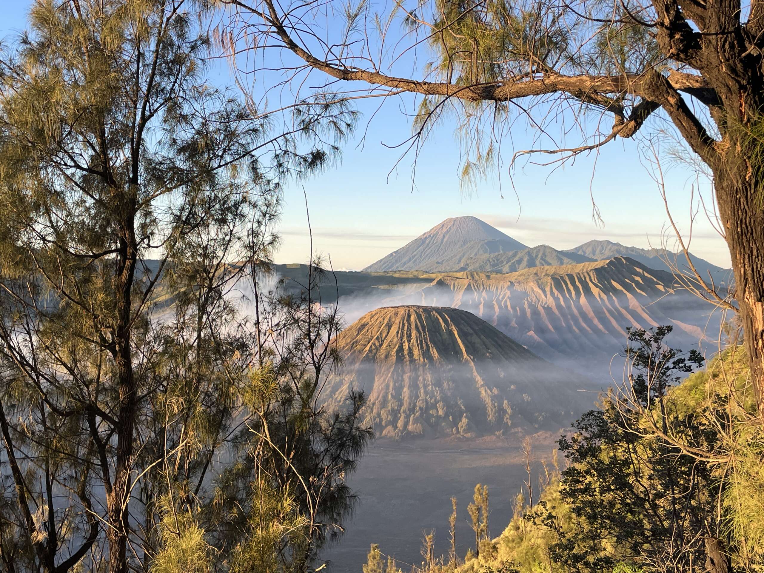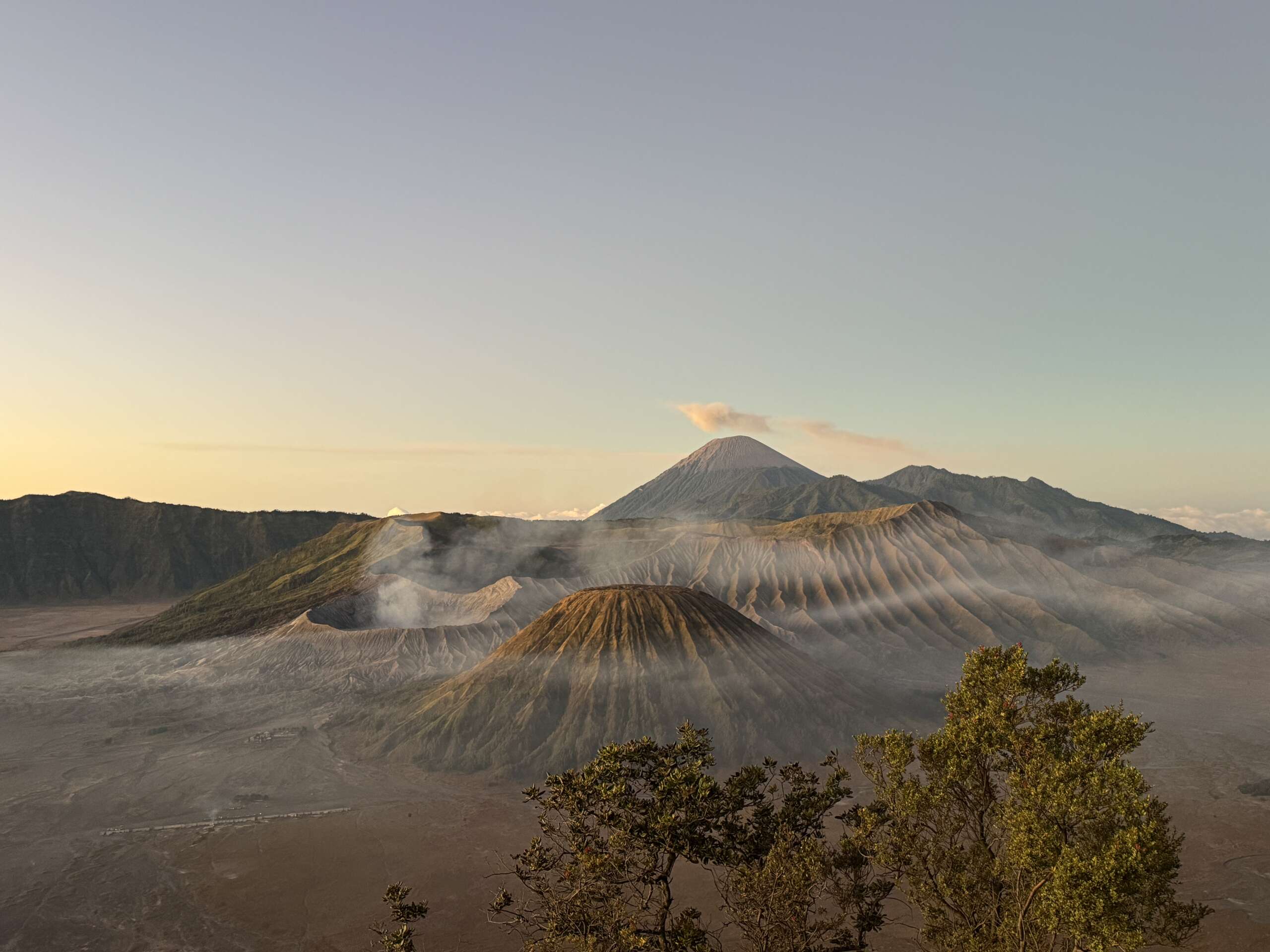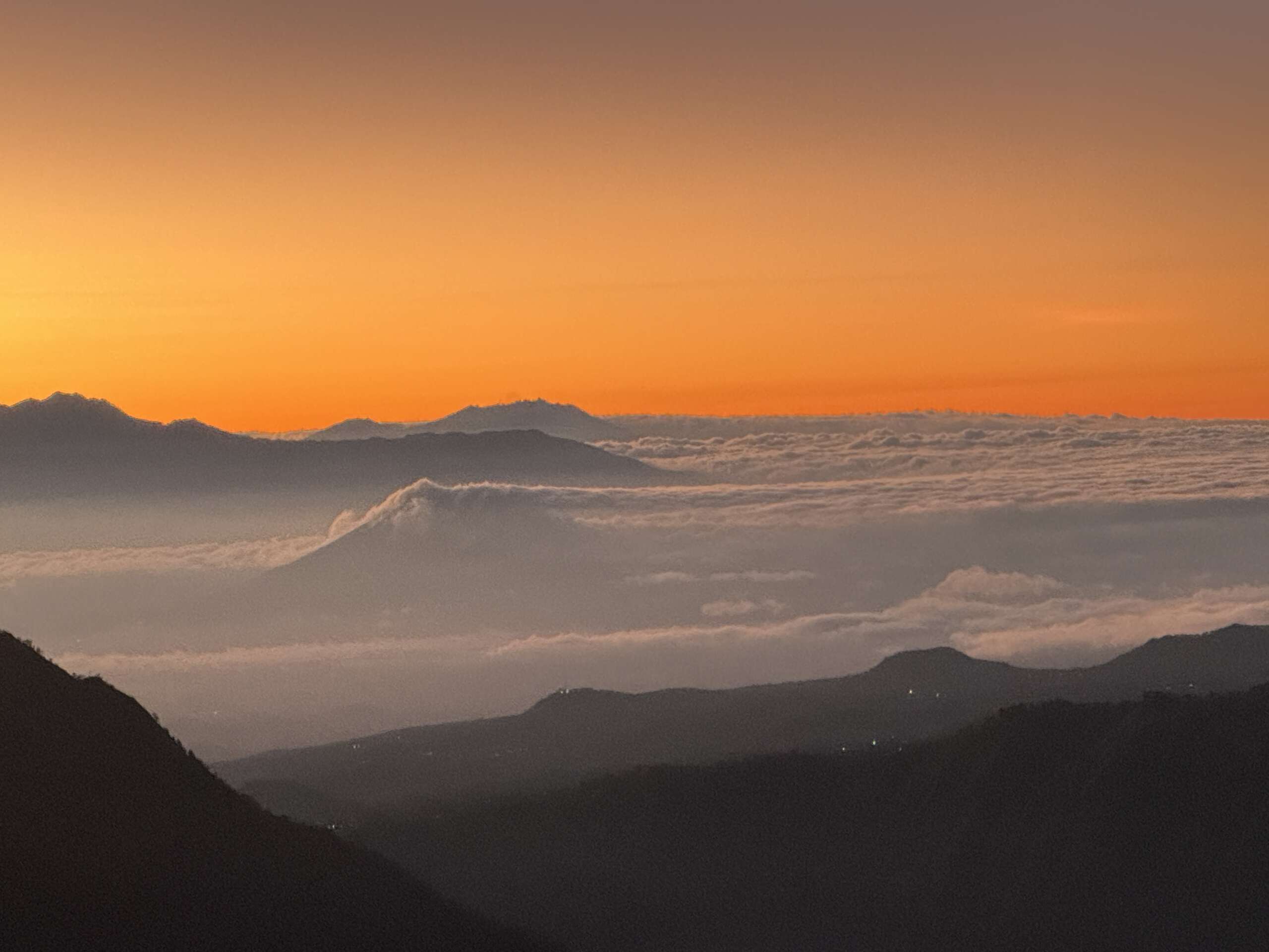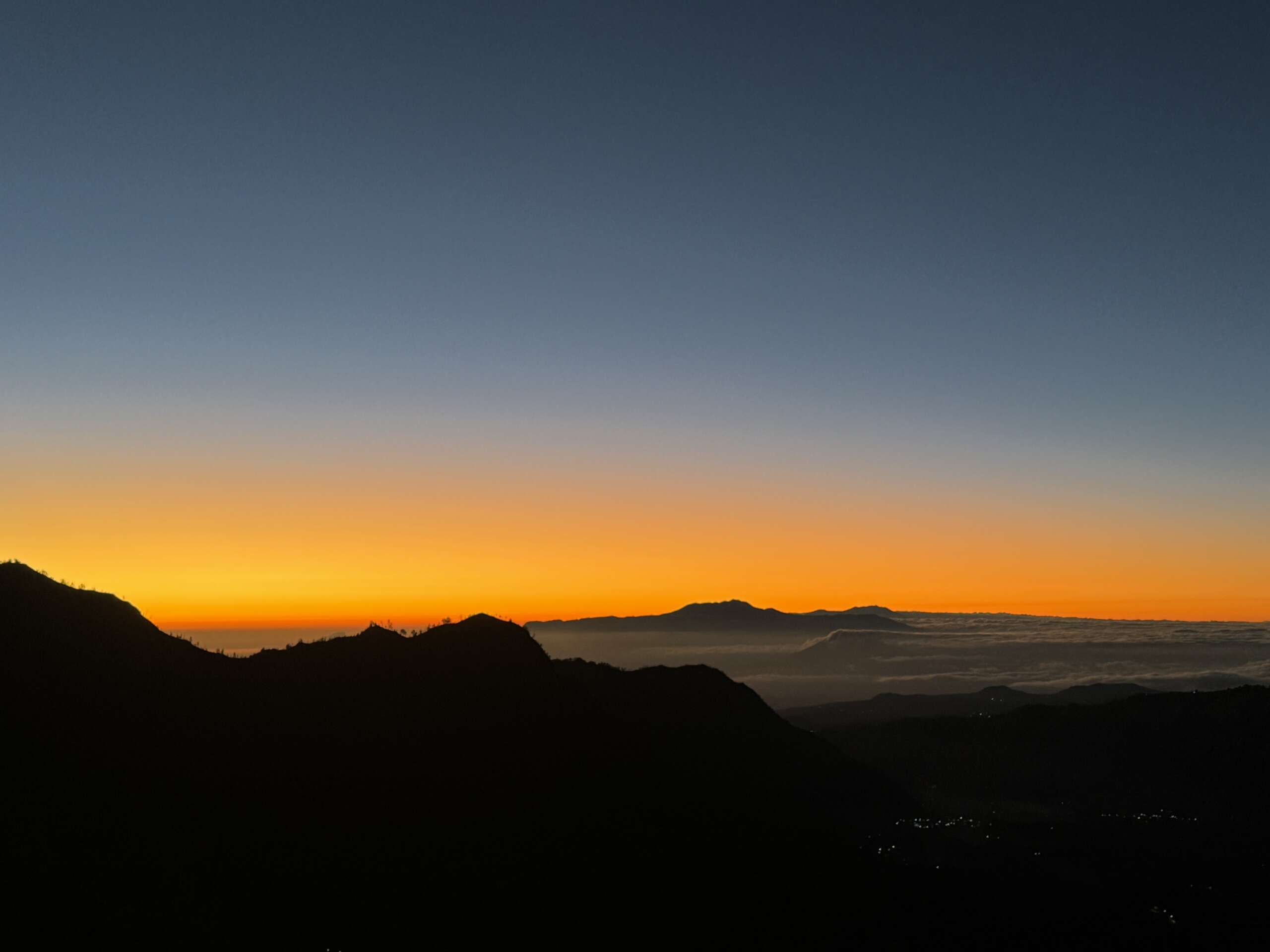 Le soleil se lève progressivement sur la caldeira du Tengger qui doit faire au bas mot une petite dizaines de kilomètres de diamètre et qui abritait avant la chambre de magma du volcan qui était au-dessus et qui a explosé il y a 45 000 ans.