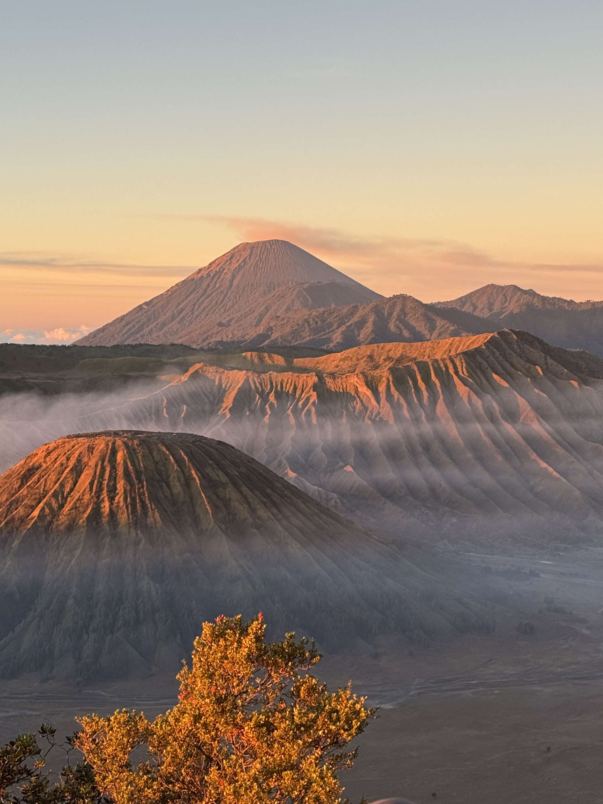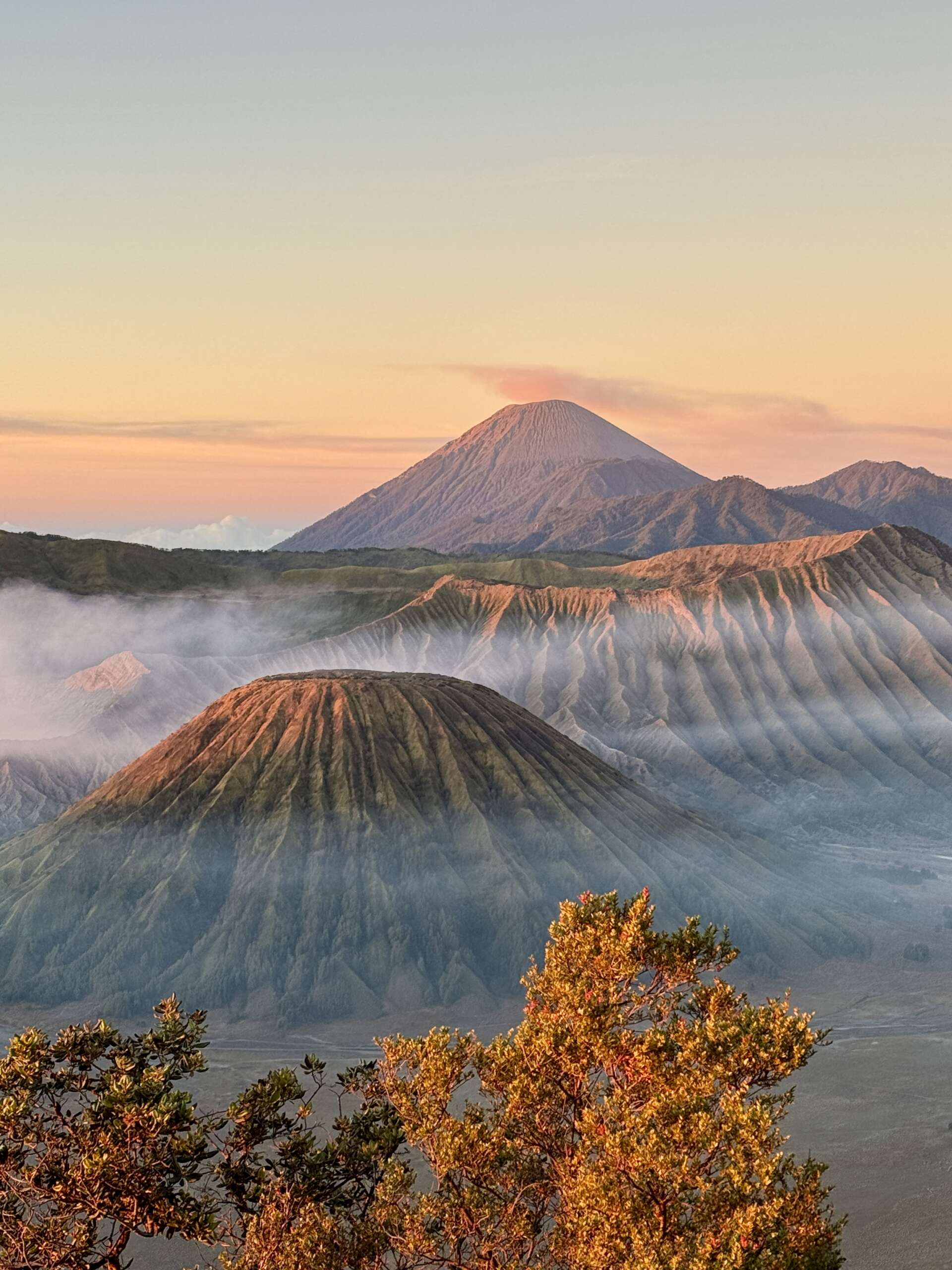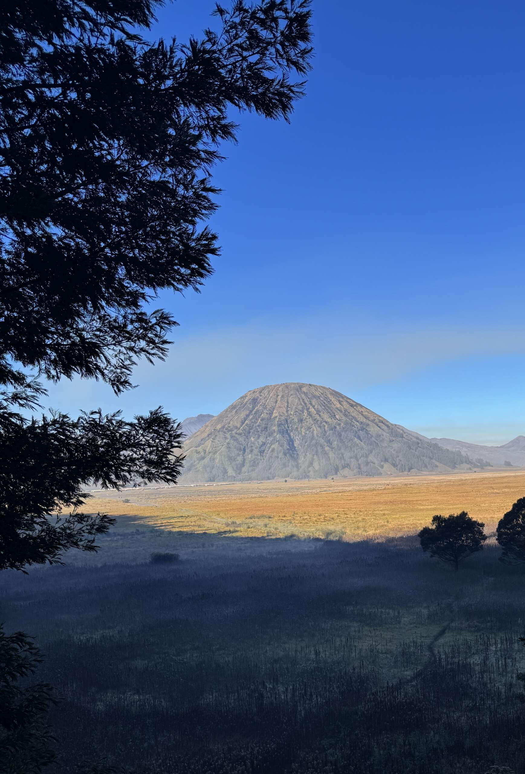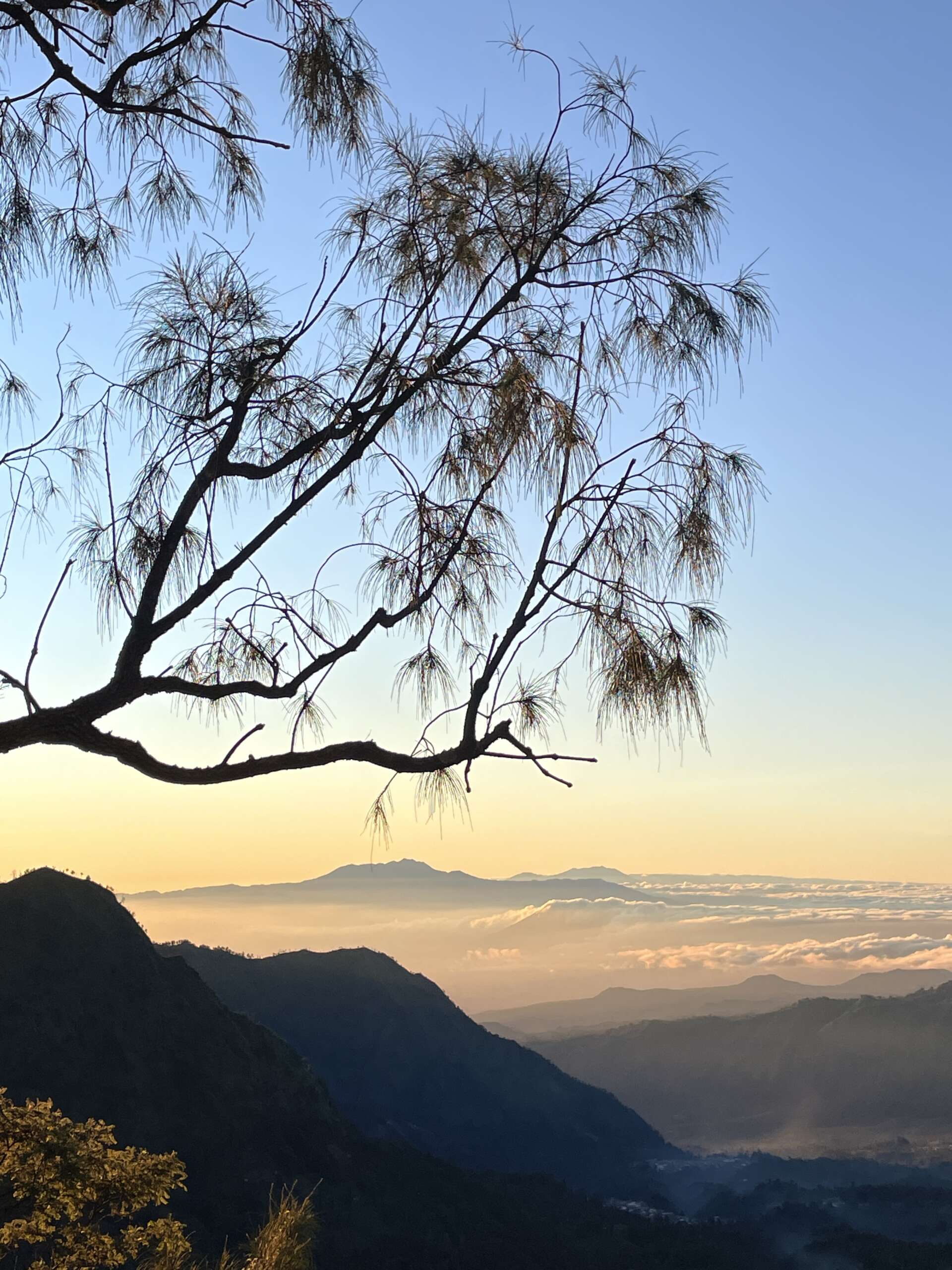 Le soleil se lève progressivement sur la caldeira du Tengger qui doit faire au bas mot une petite dizaines de kilomètres de diamètre et qui abritait avant la chambre de magma du volcan qui était au-dessus et qui a explosé il y a 45 000 ans.
