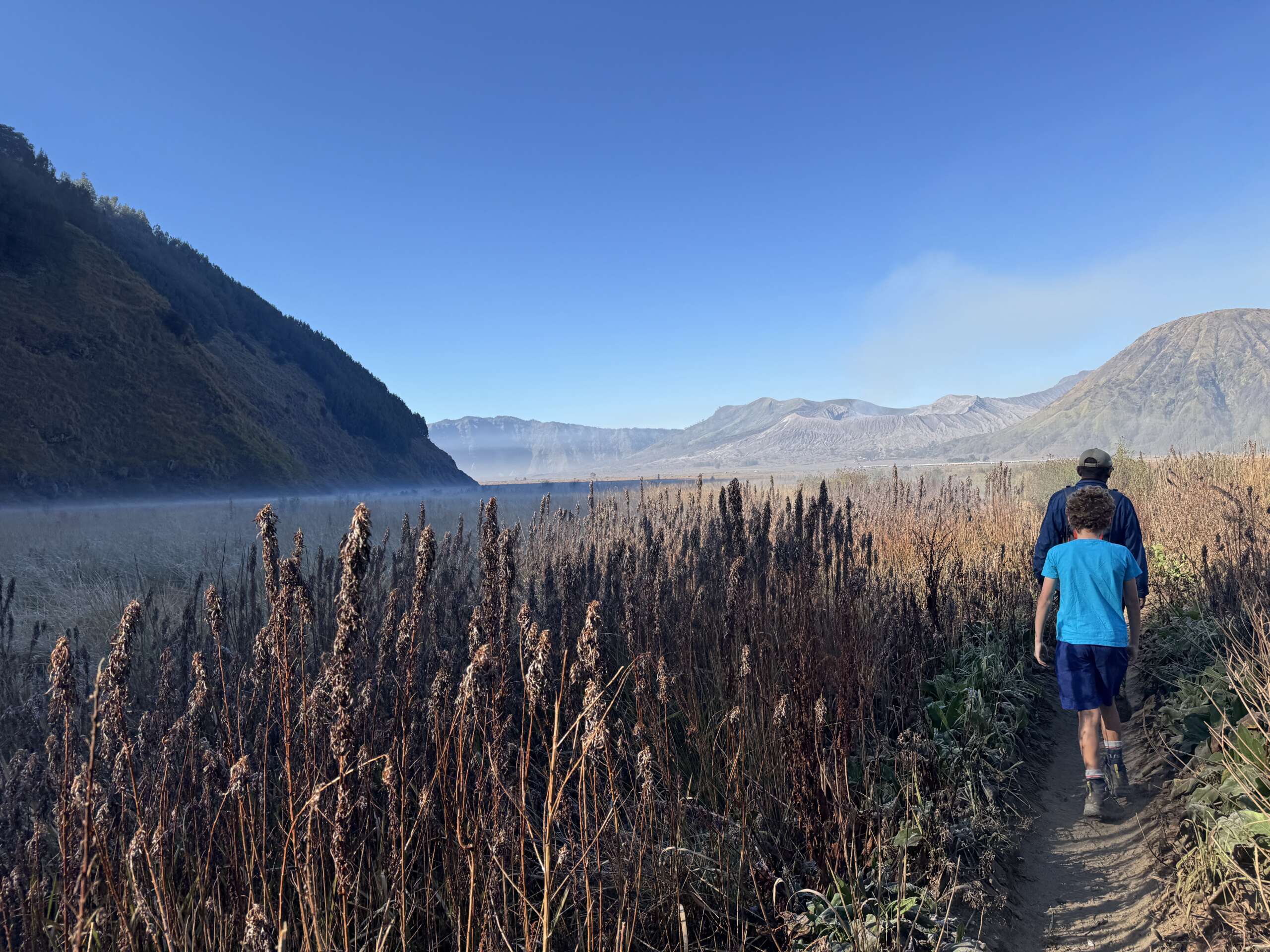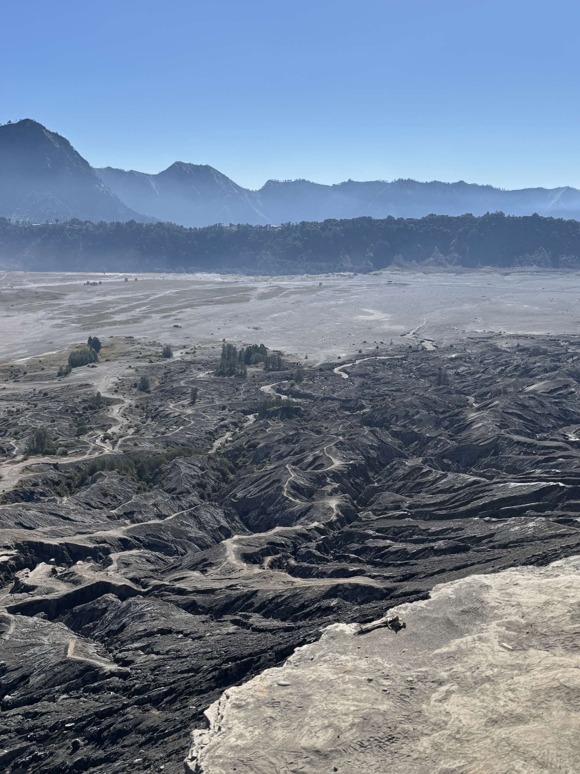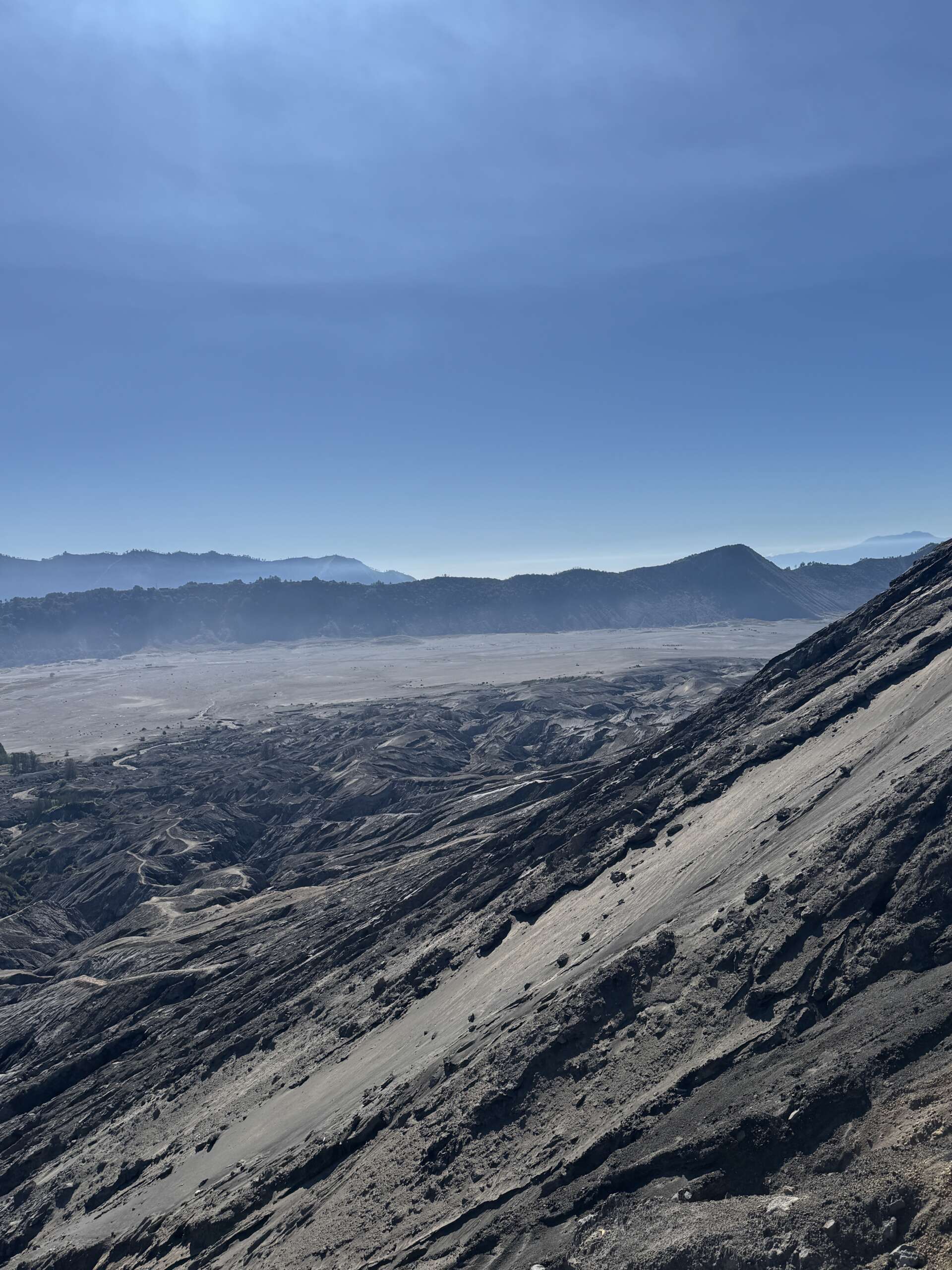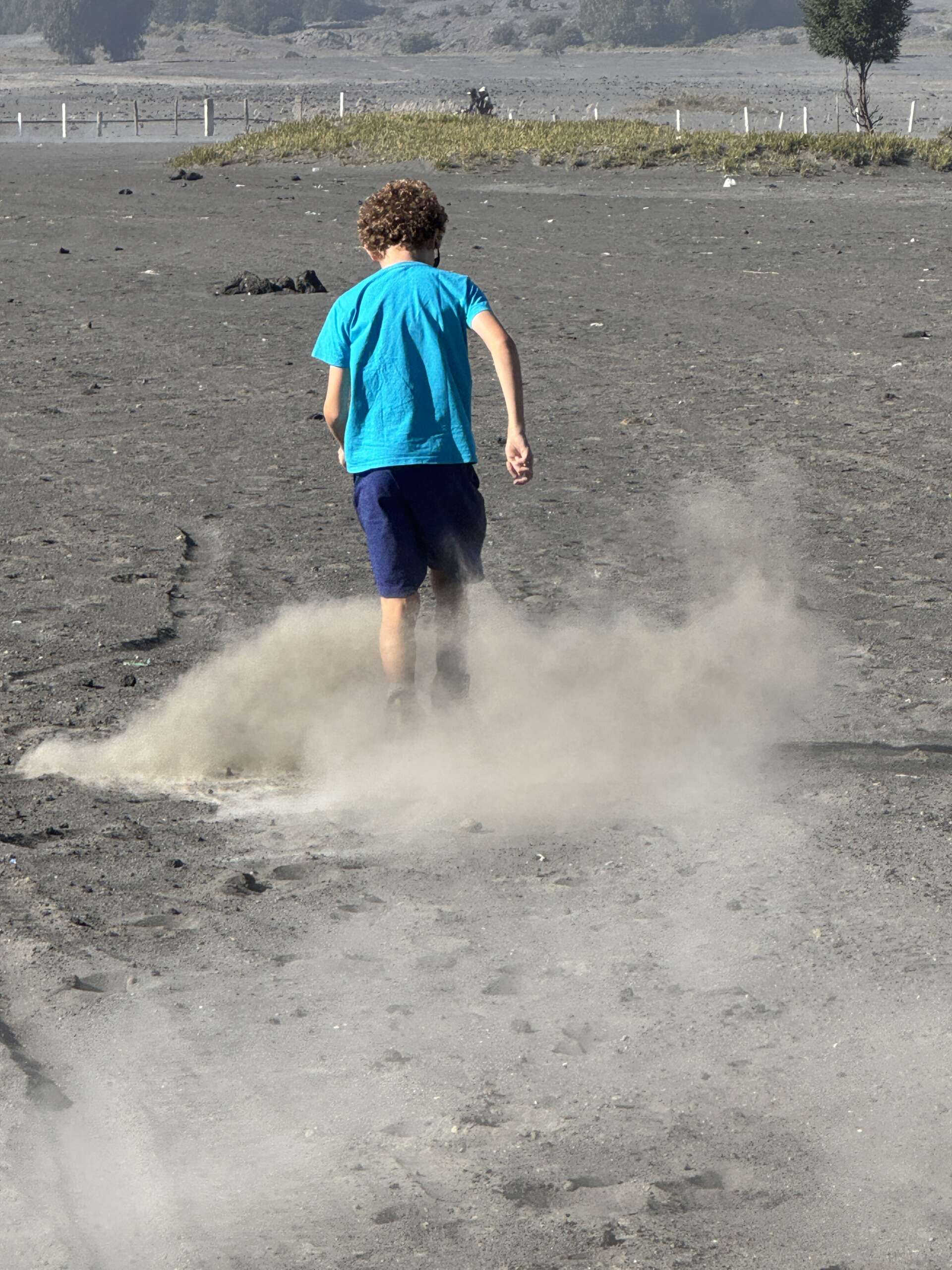 Arrivés à Penjakan 1 on retrouve notre jeep. La température a pris près de 15 degrés entre temps, donc on troque notre tenue de ski qui s’est déjà amenuisée au fil de la descente pour un t-shirt et un short. On nous dépose en haut de la Caldeira, ce qui s’avère presque un acte de résistance face au tourisme de masse car on est bien les seuls à descendre à pied dans la caldeira avant de traverser sur quelques kilomètres la mer de sable. Bien nous en a pris, car c’était vraiment très beau et pour le coup on était vraiment seuls au monde.