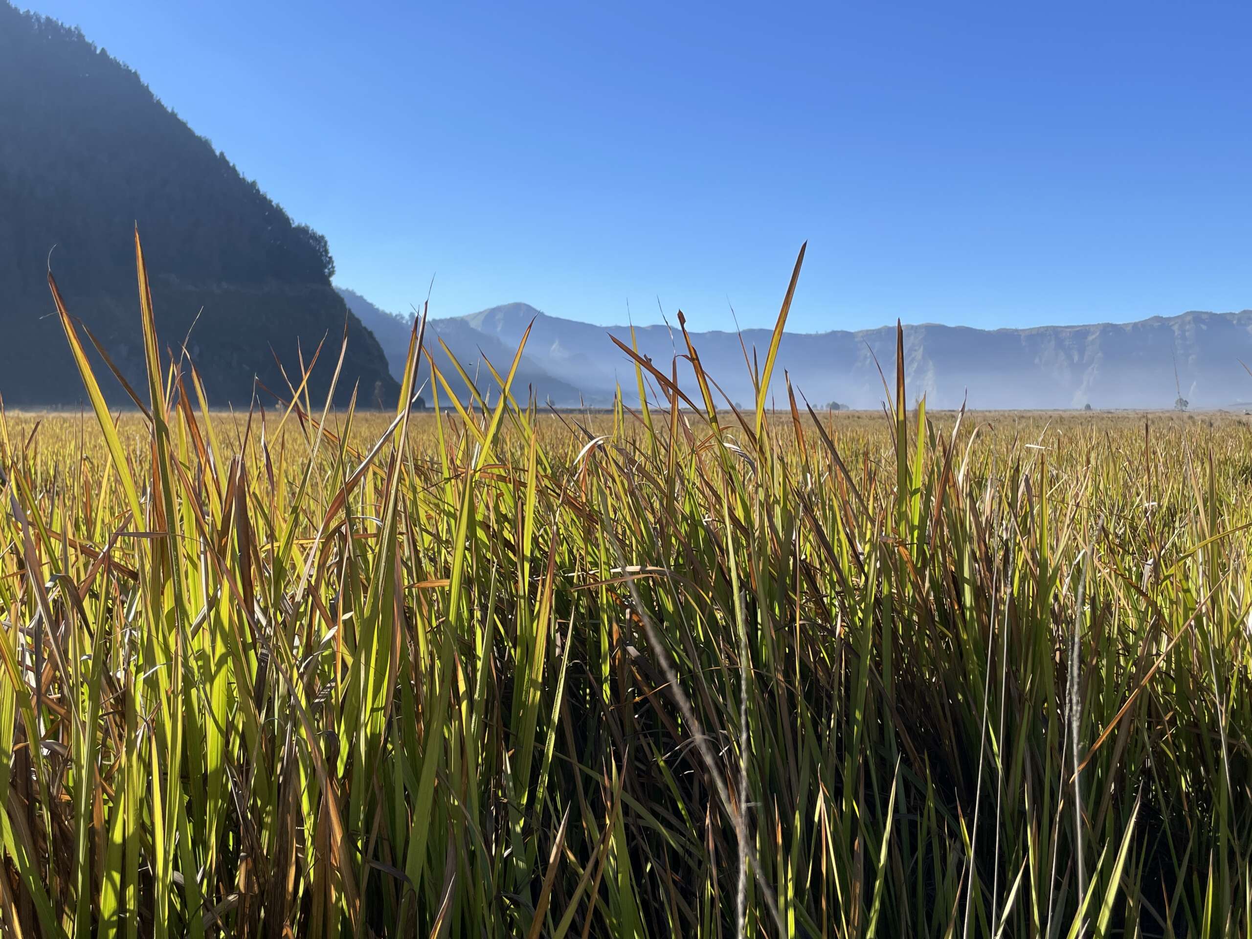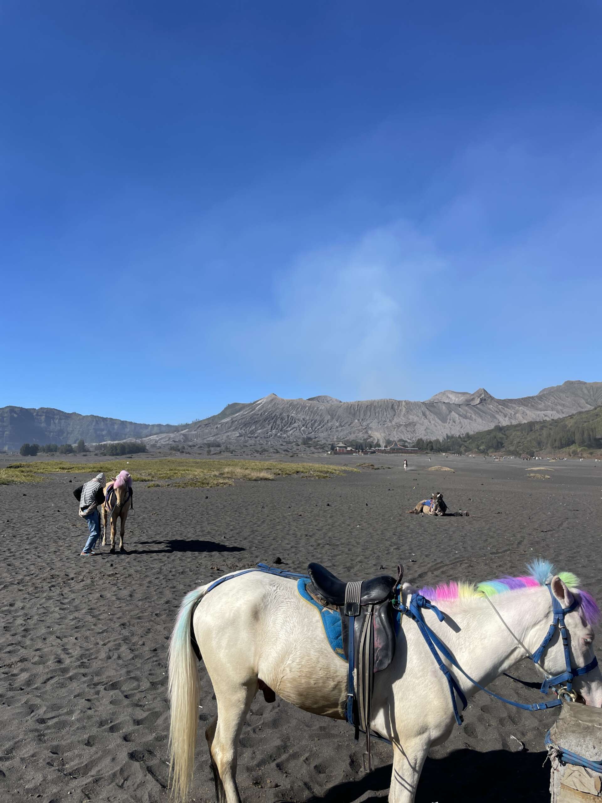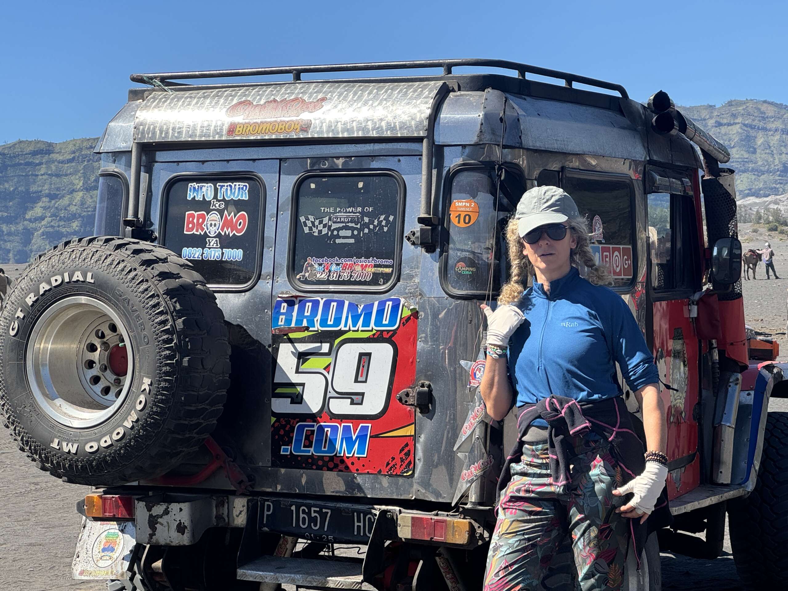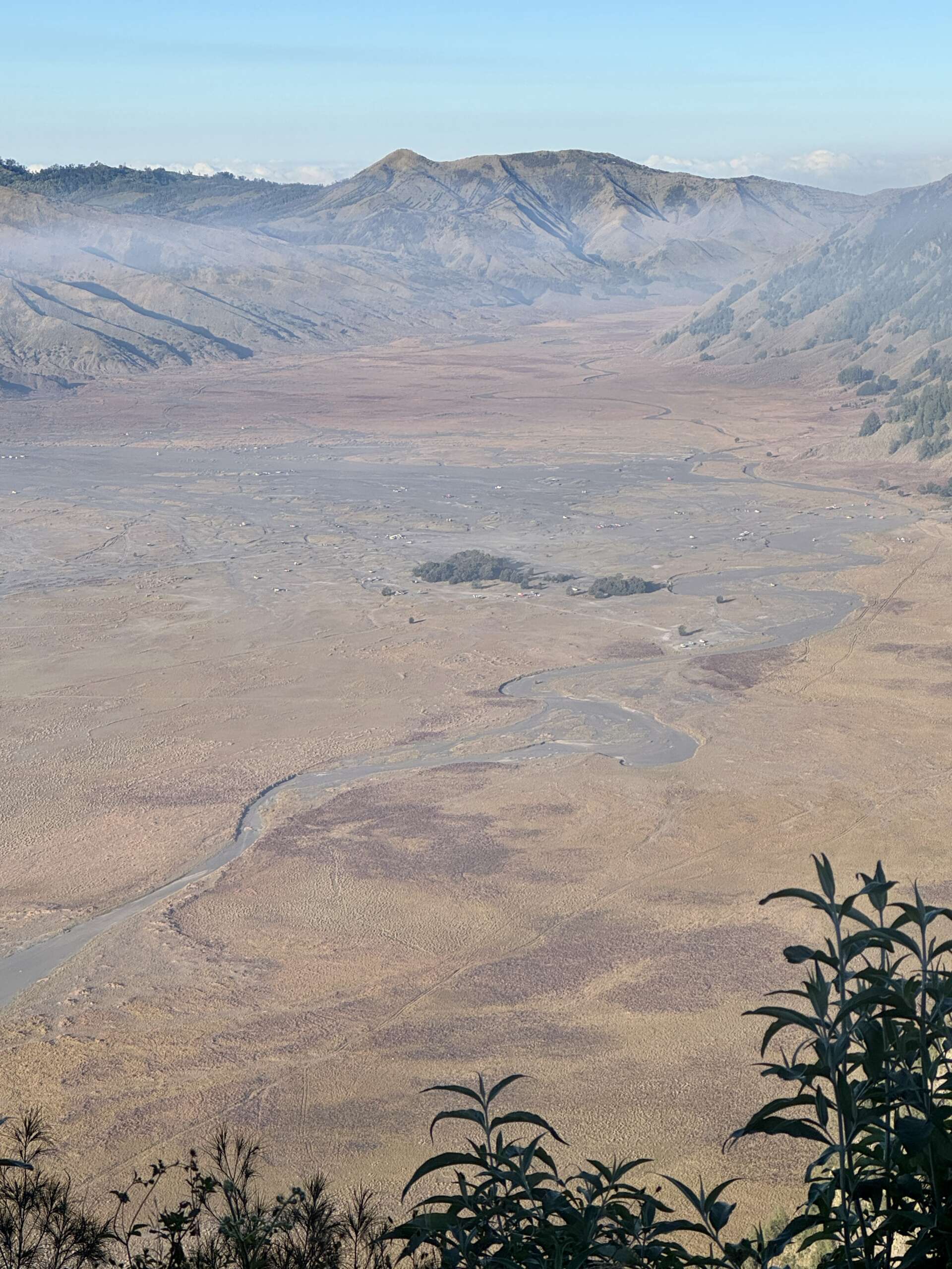 Arrivés à Penjakan 1 on retrouve notre jeep. La température a pris près de 15 degrés entre temps, donc on troque notre tenue de ski qui s’est déjà amenuisée au fil de la descente pour un t-shirt et un short. On nous dépose en haut de la Caldeira, ce qui s’avère presque un acte de résistance face au tourisme de masse car on est bien les seuls à descendre à pied dans la caldeira avant de traverser sur quelques kilomètres la mer de sable. Bien nous en a pris, car c’était vraiment très beau et pour le coup on était vraiment seuls au monde.