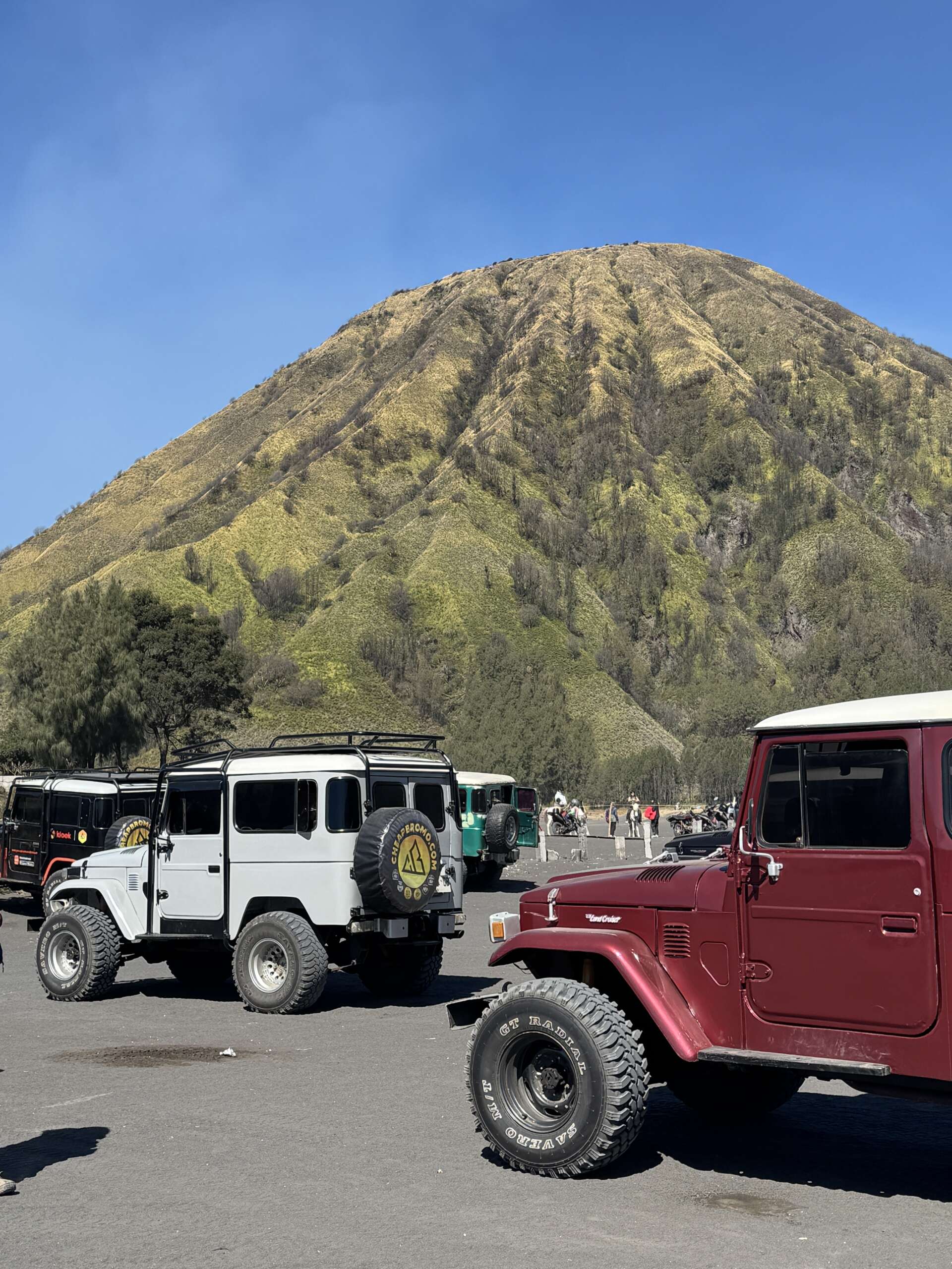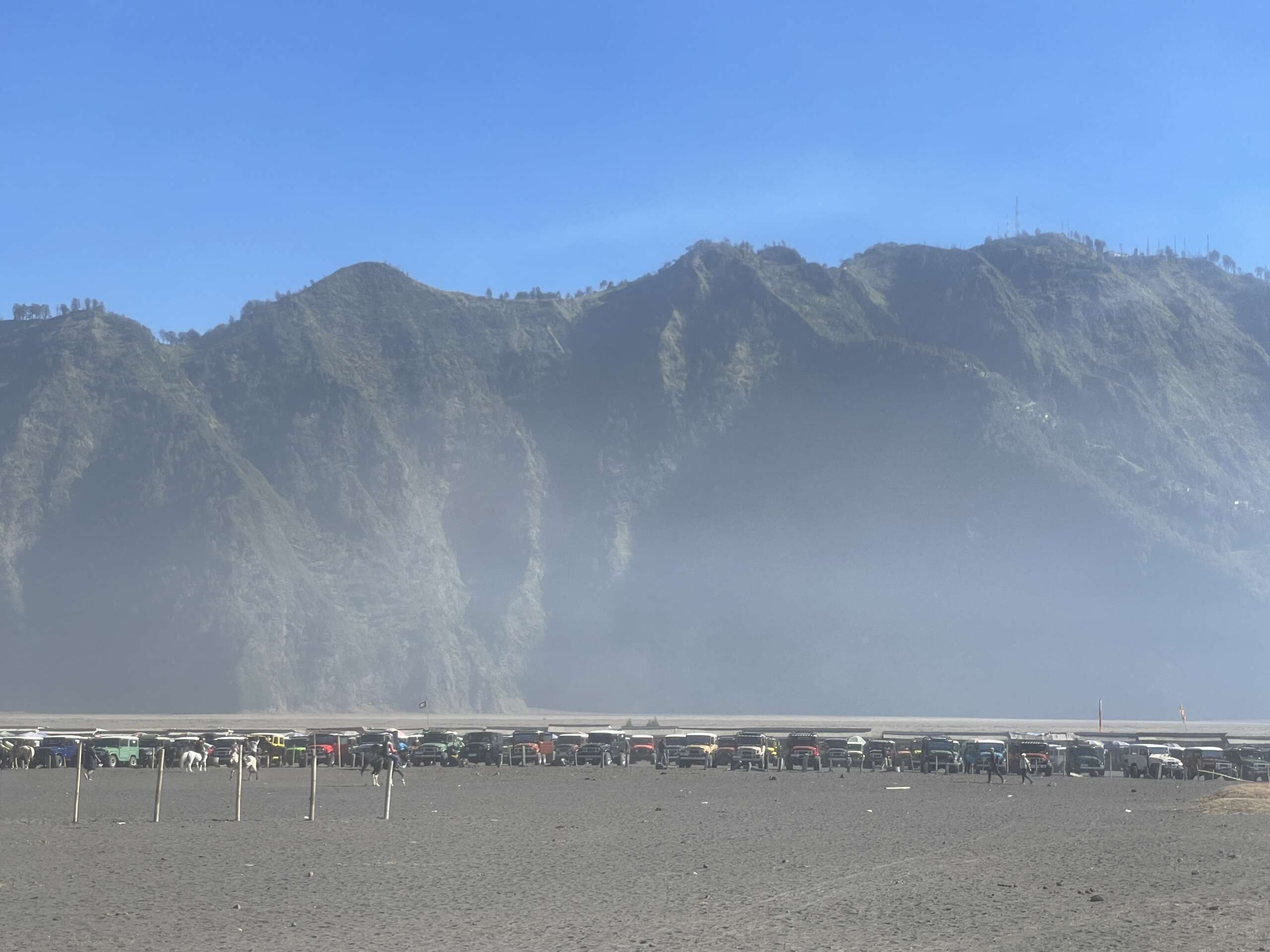 Mais toute bonne chose à une fin. Pour aller au bord du cratère du Bromo, nos amis indonésiens ont tiré la ficelle du tourisme et ont donc installé en plein cœur de la caldeira, à moins d’un km à pied du Bromo, ce qui est sans conteste le plus grand parking de jeep qu’il nous a été donné de voir dans notre vie. On allait quand même pas obliger les gens à marcher dans la caldeira en plein soleil quand même !