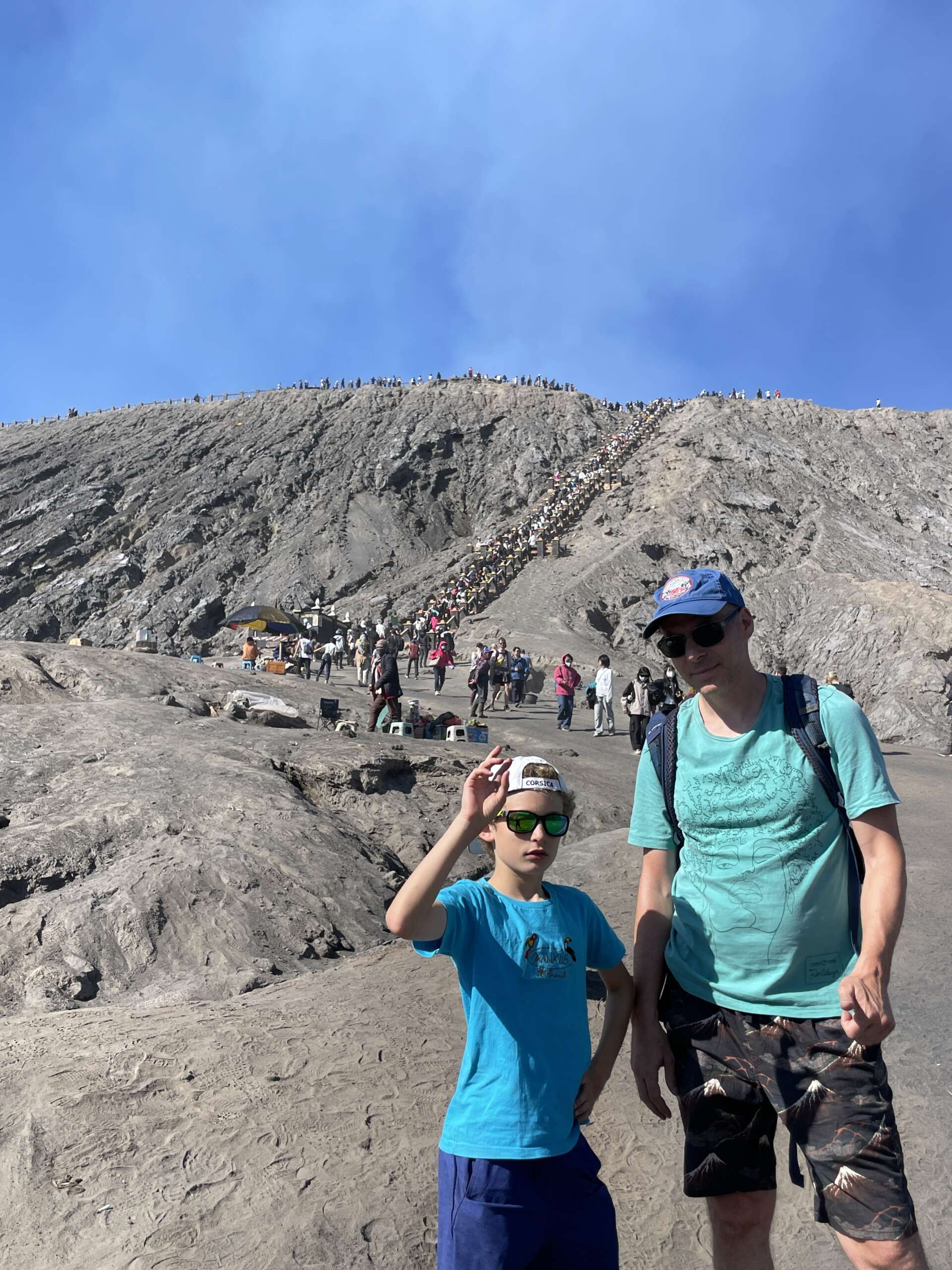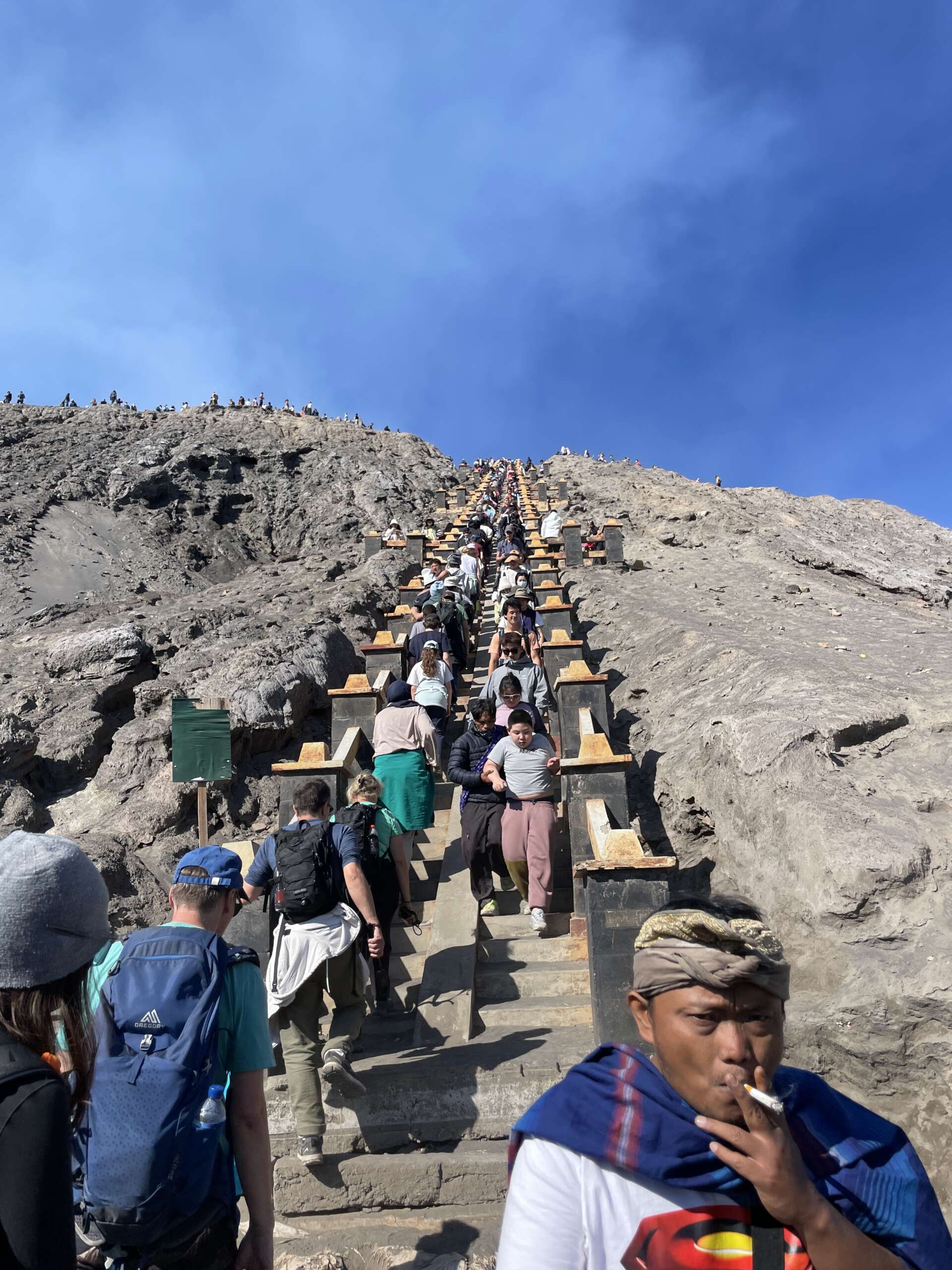 Et comme il restait 100 mètres de dénivelés le long du flanc du Bromo cette fois trop pentus pour nos canassons, ils ont fini avec un escalier de 249 marches (on les a comptés avec Noah), avec un sens pour monter et un pour descendre. Non mais on rêve !