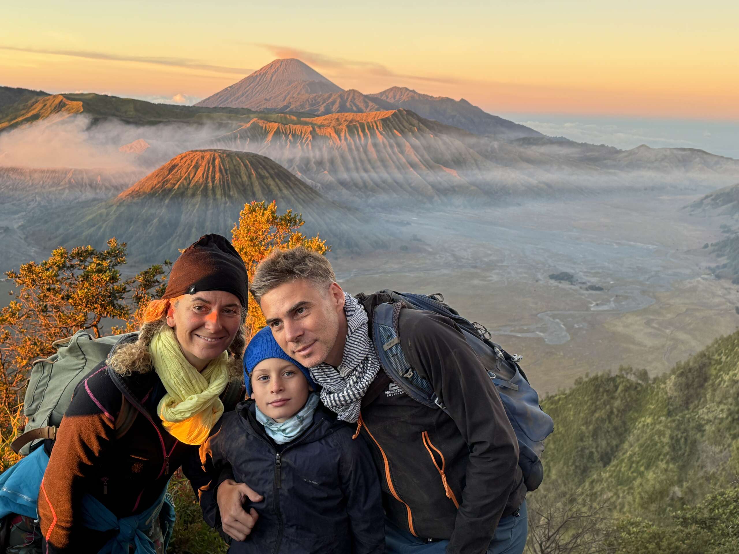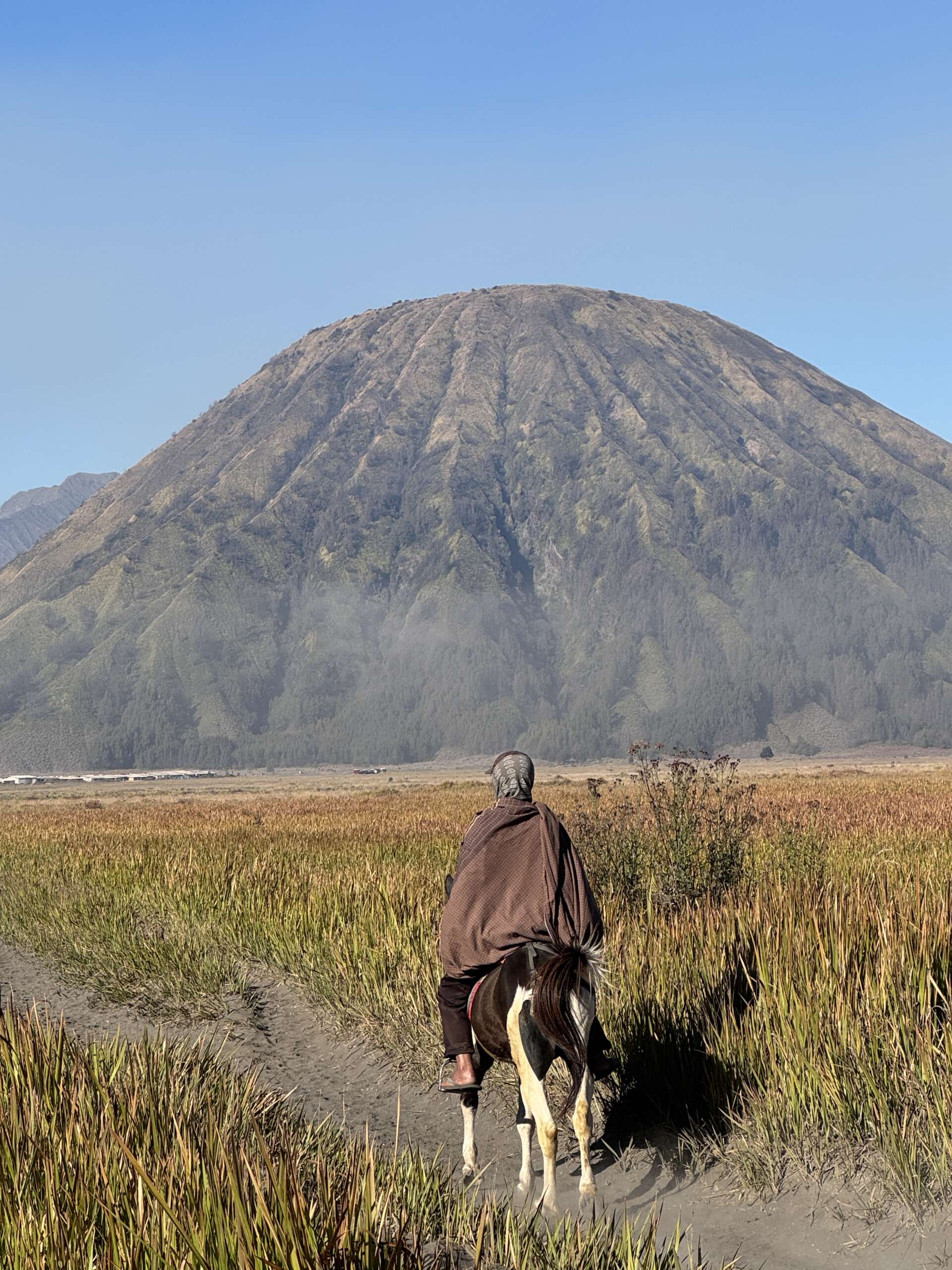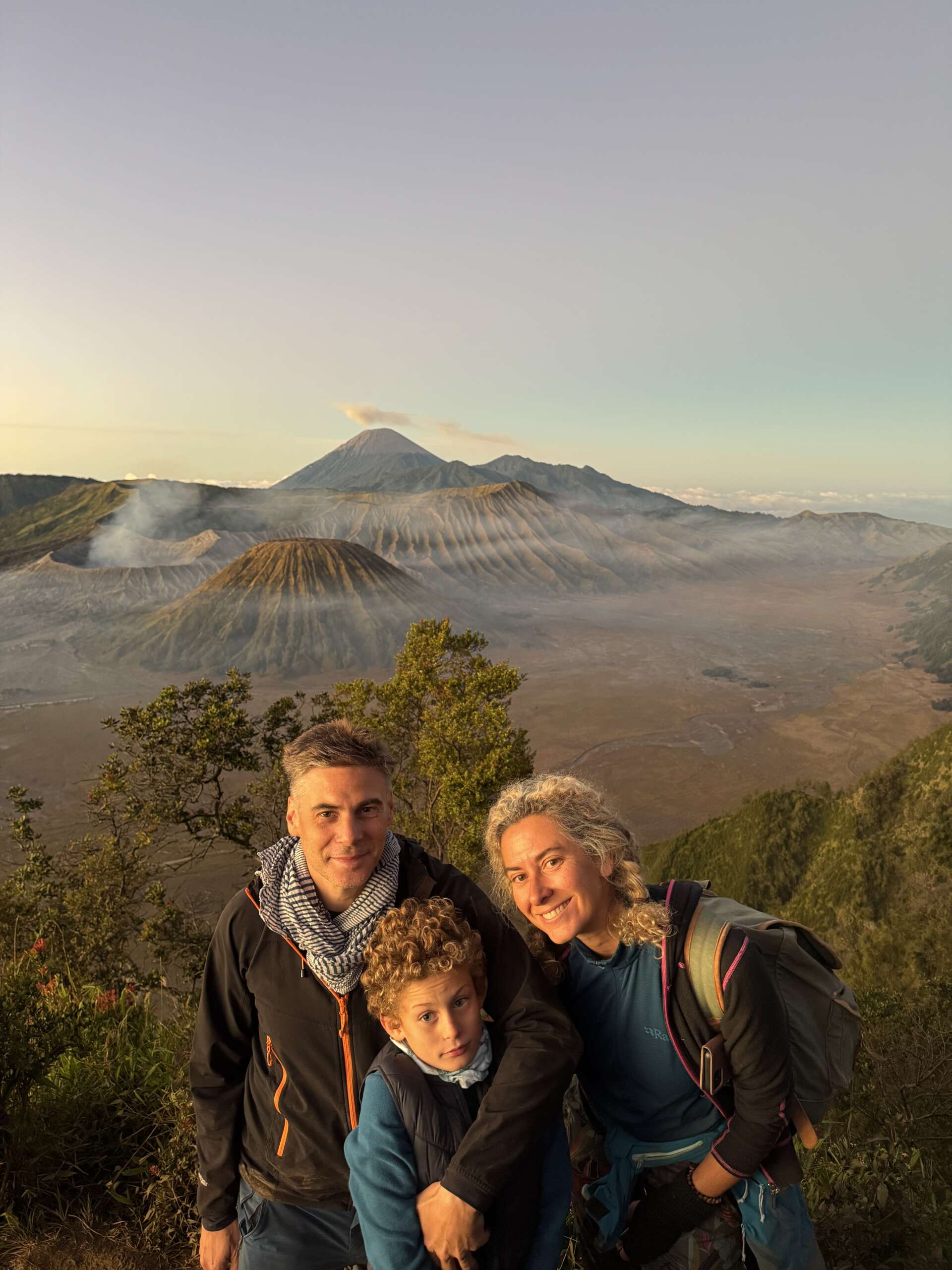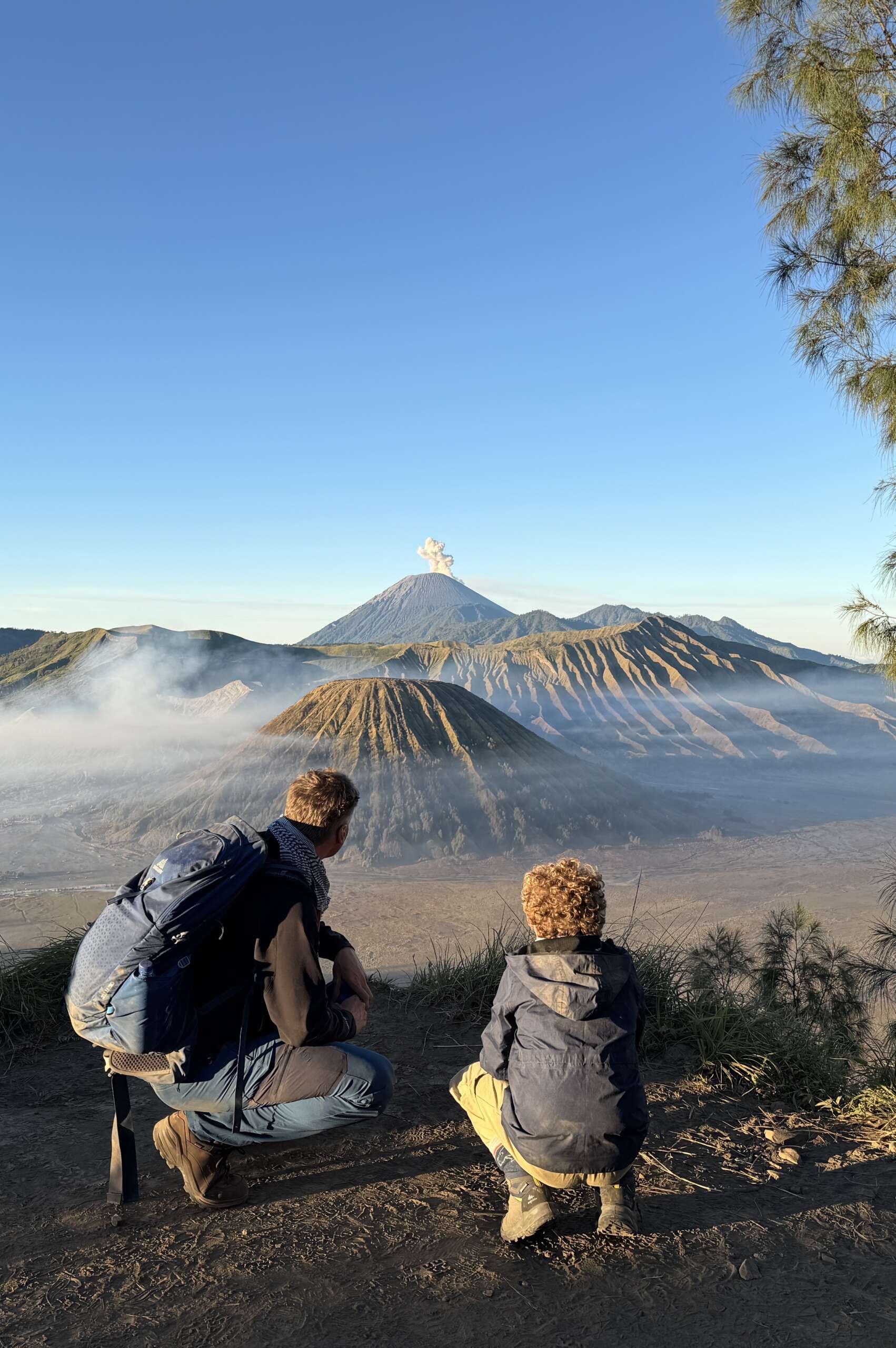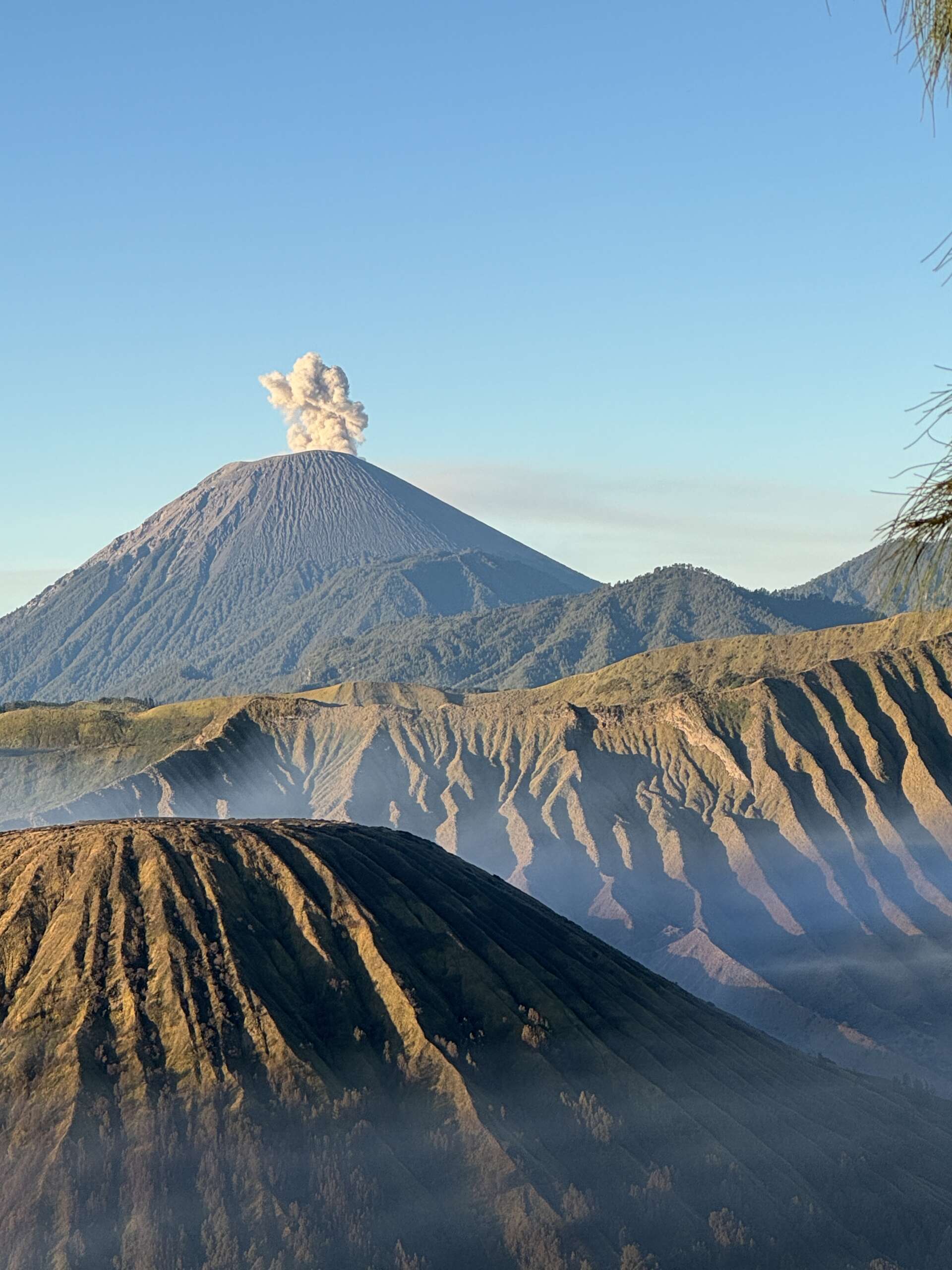 Dans la caldeira, la mer de sable, et au milieu, le volcan Batok avec ses stries vertes de végétation (il est désormais éteint ou suffisamment endormi pour avoir laissé le temps à la végétation de s’installer sur ses flancs). A sa gauche le volcan Bromo toujours actif d’où s’échappe des fumerolles, et en arrière-plan qui les surplombent tous, le Semuru – pourtant à plus de 35 km d’ici – haut de ses 3 676 mètres et plus haut volcan de l’ile de Java qui est en éruption quasi permanente depuis plusieurs mois. D’ailleurs, les premiers rayons du soleil sur le Semuru s’accompagnent immédiatement d’une énorme éjection de fumée propulsée à plus de 1 000 mètres au-dessus du Semuru. Impressionnant.