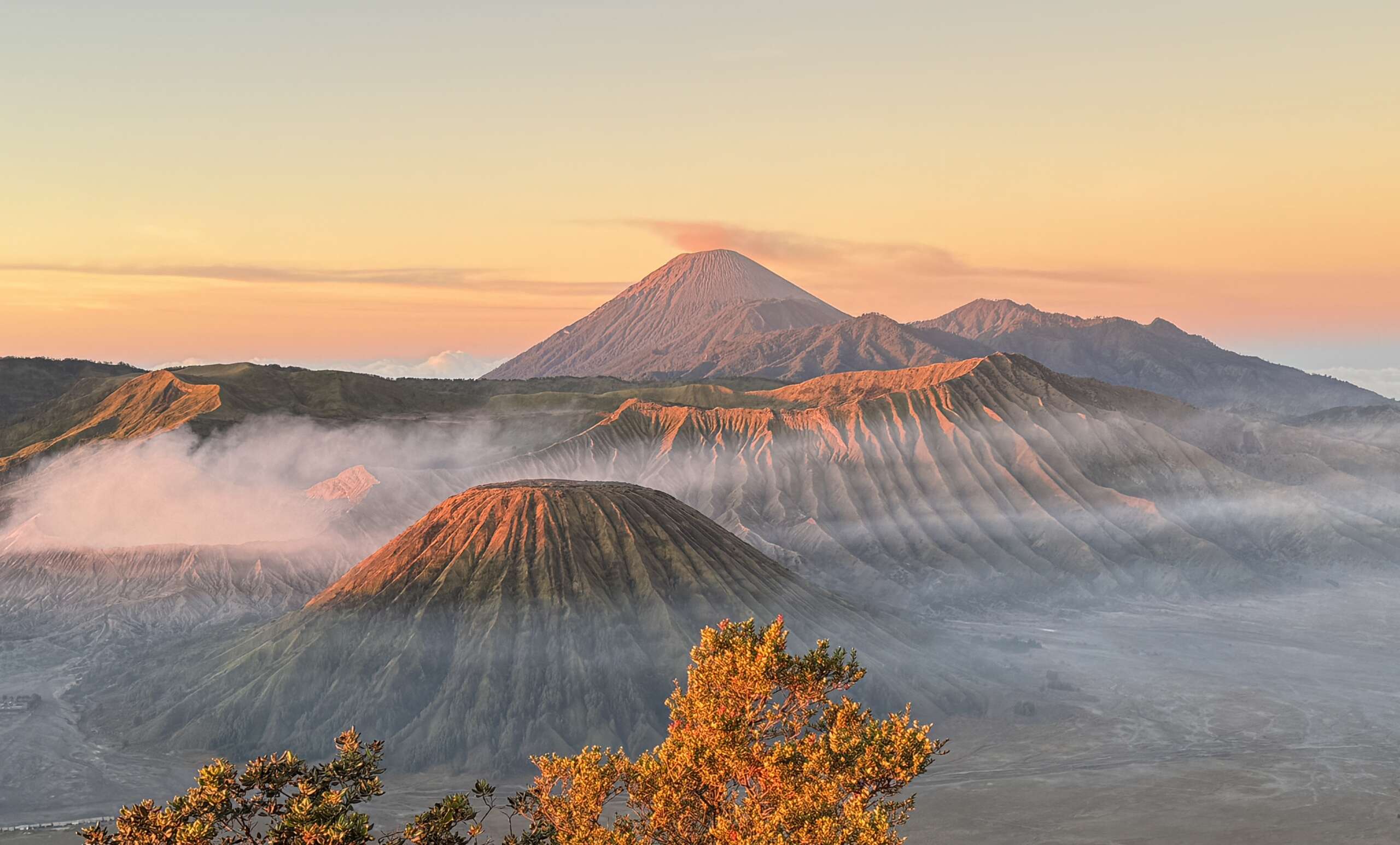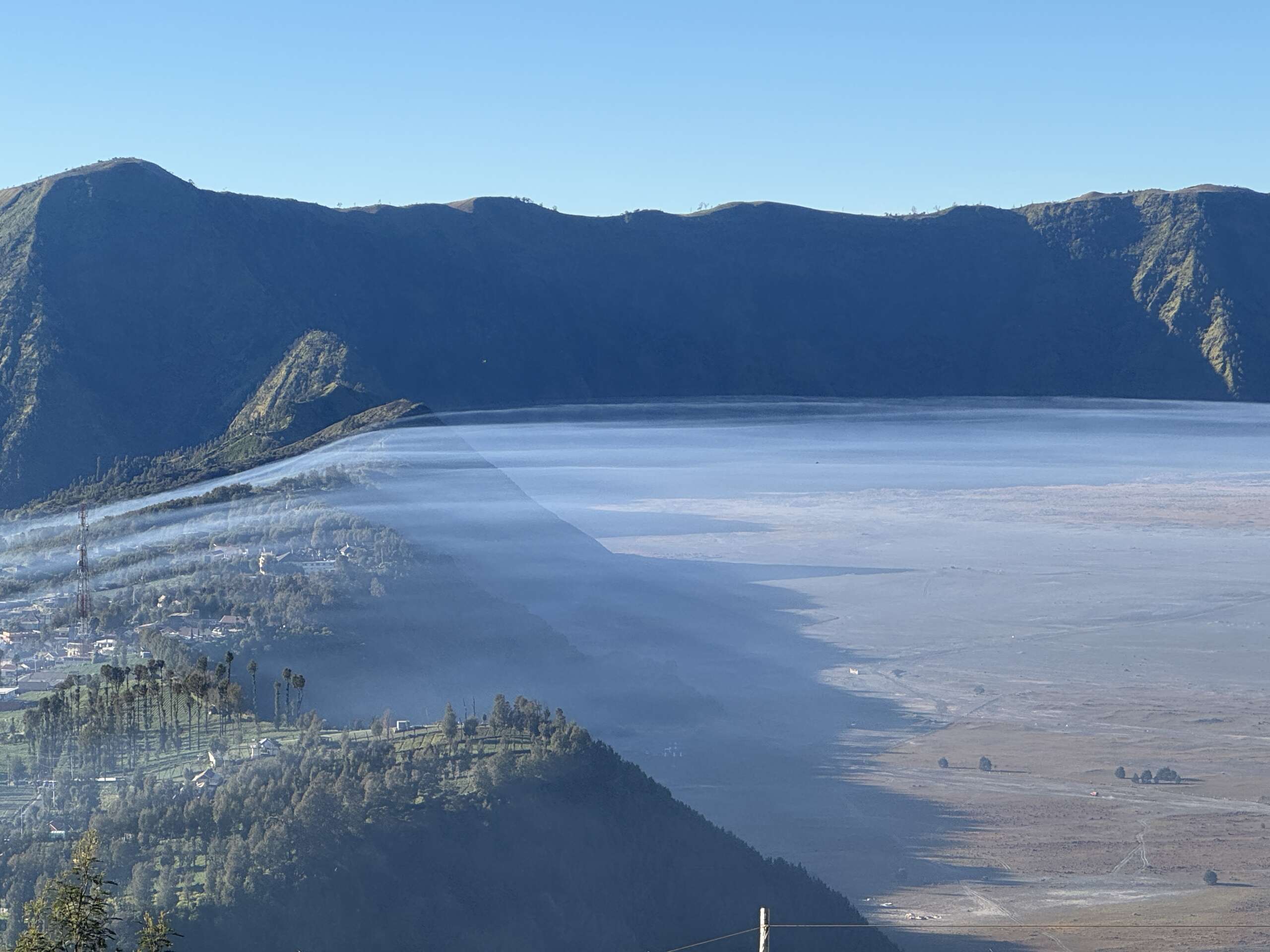 Pendant ce temps, les brumes au fond de la caldeira se lèvent et il ne reste plus que des filets parfaitement horizontaux qui, à la manière d’une toile d’araignée, tissent des lignes rectilignes parfaites du haut de la caldeira au sommet du Bromo.
