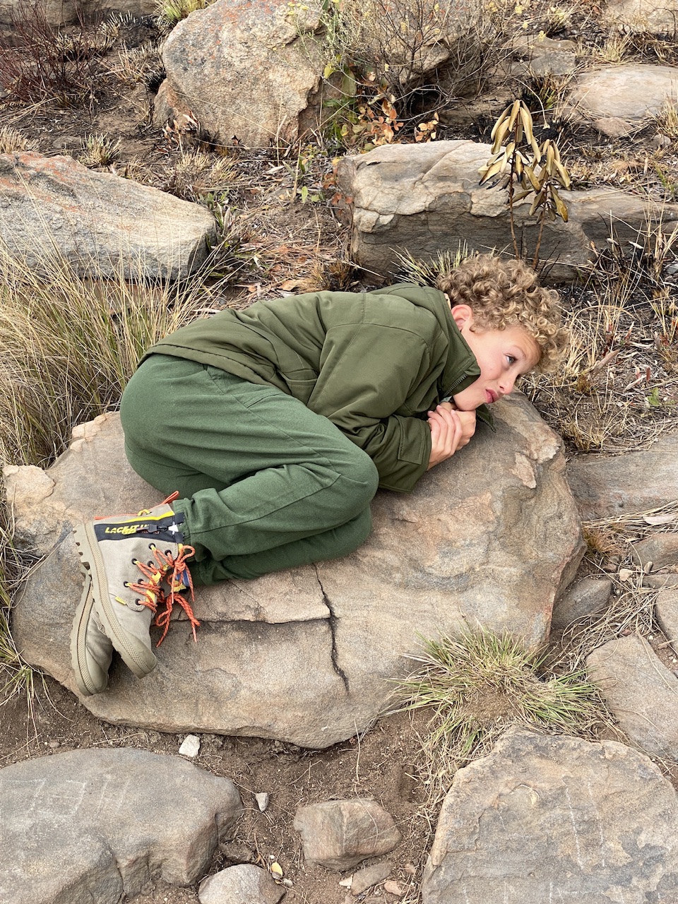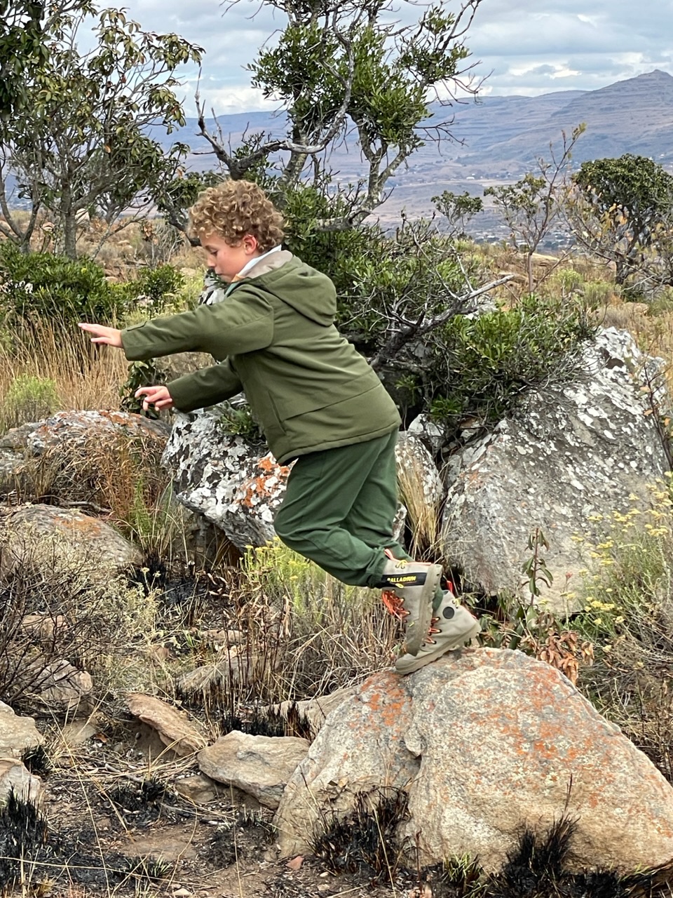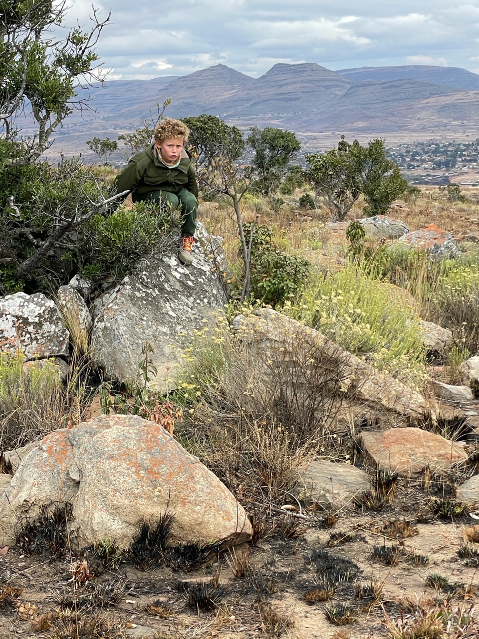 On aurait pu y rester 10 minutes comme la plupart des touristes, surtout que la luminosité n’est pas propice à une séance photographique, mais c’était sans compter Noah qui, habillé dans les couleurs exactes du paysage, s’est mis à crapahuter dans la végétation en donnant comme seule explication que ce n’était pas sa faute, c’était “sa nature”. Avec un signe qui croisait en arrière plan, la ressemblance avec notre lointain ancêtre est troublante.