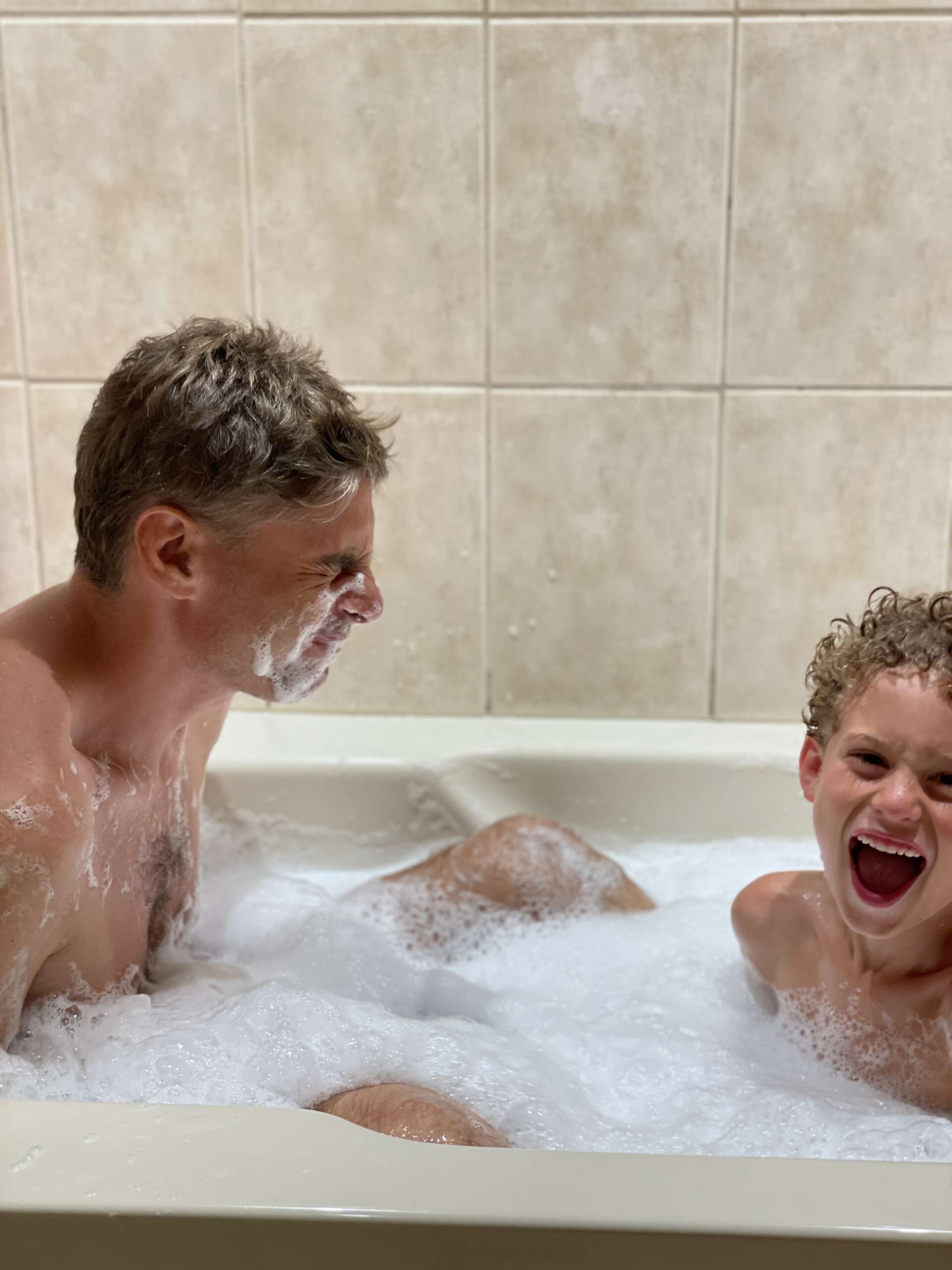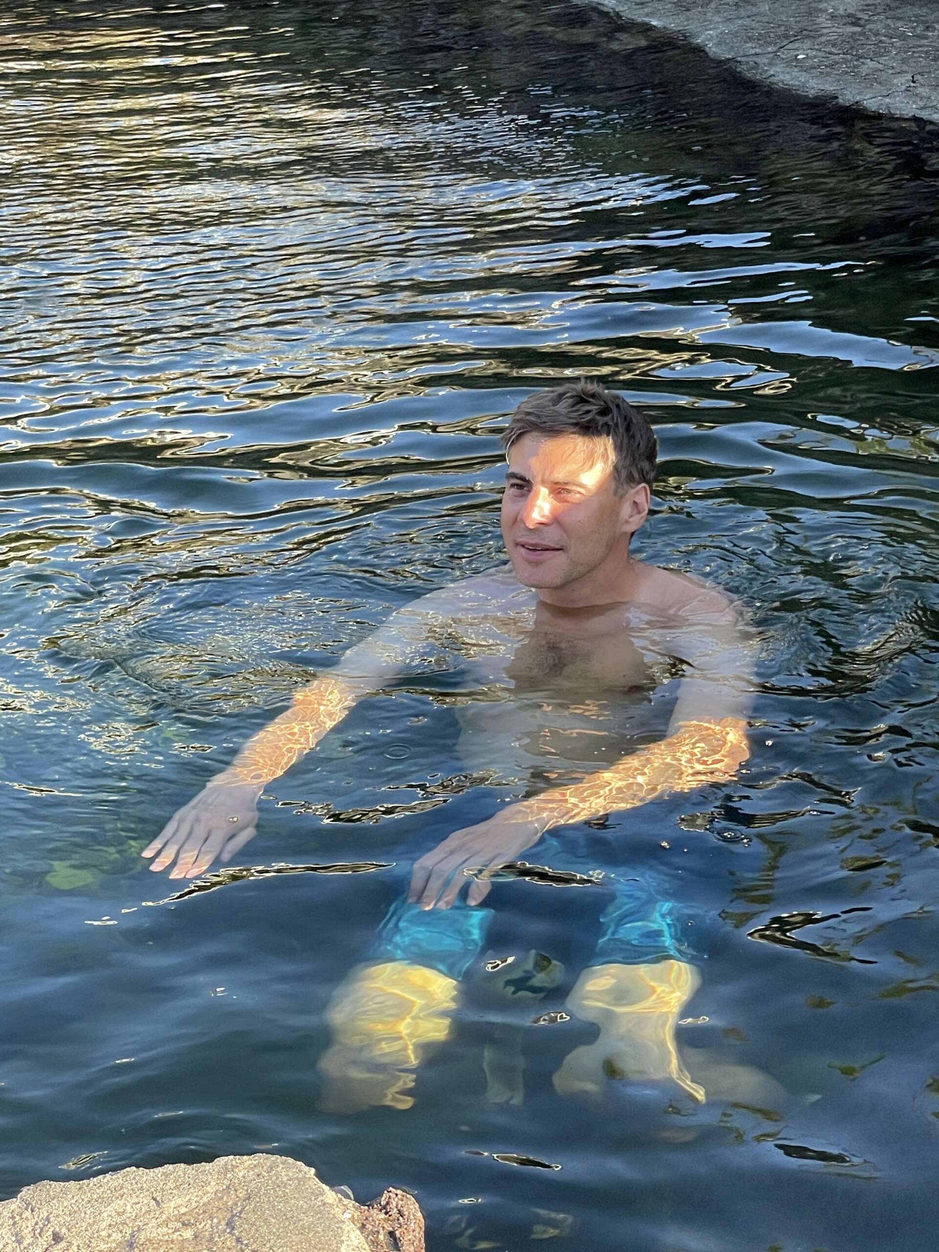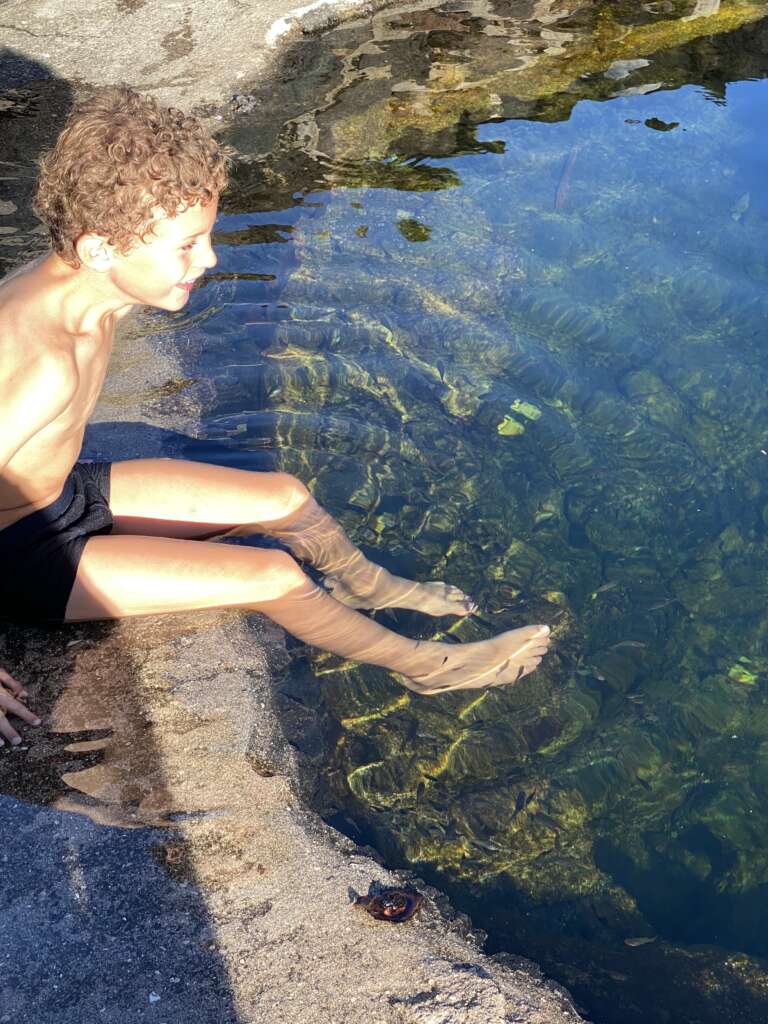 Noah est émerveillé à l’idée de s’être fait manger les pieds par des poissons, mais après 30 minutes de séance gratuite, notre « monsieur toujours plus » se dit que si on se baignait on pourrait avoir des chatouilles partout. Virginie botte en touche. Du coup je finis par accepter, et nous voici tous les deux à entrer dans la piscine – un peu froide je dois dire -. Mais l’effet est moins fort car on bouge et les poissons ne s’approchent vraiment que quand on reste immobiles.