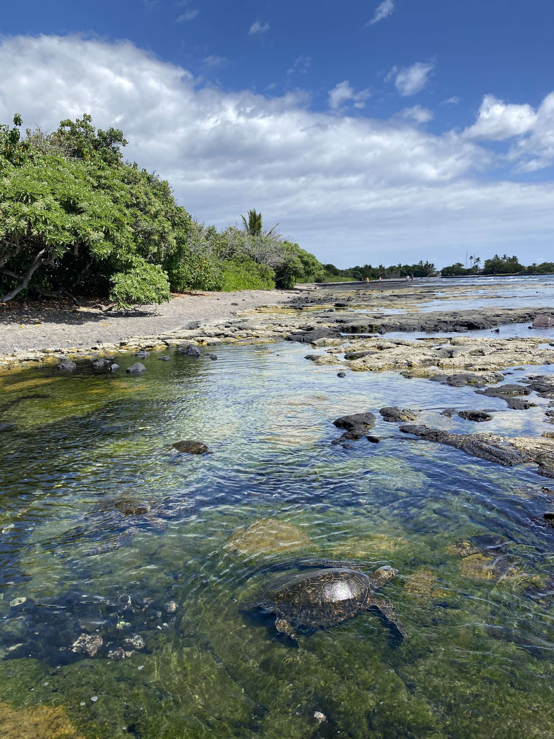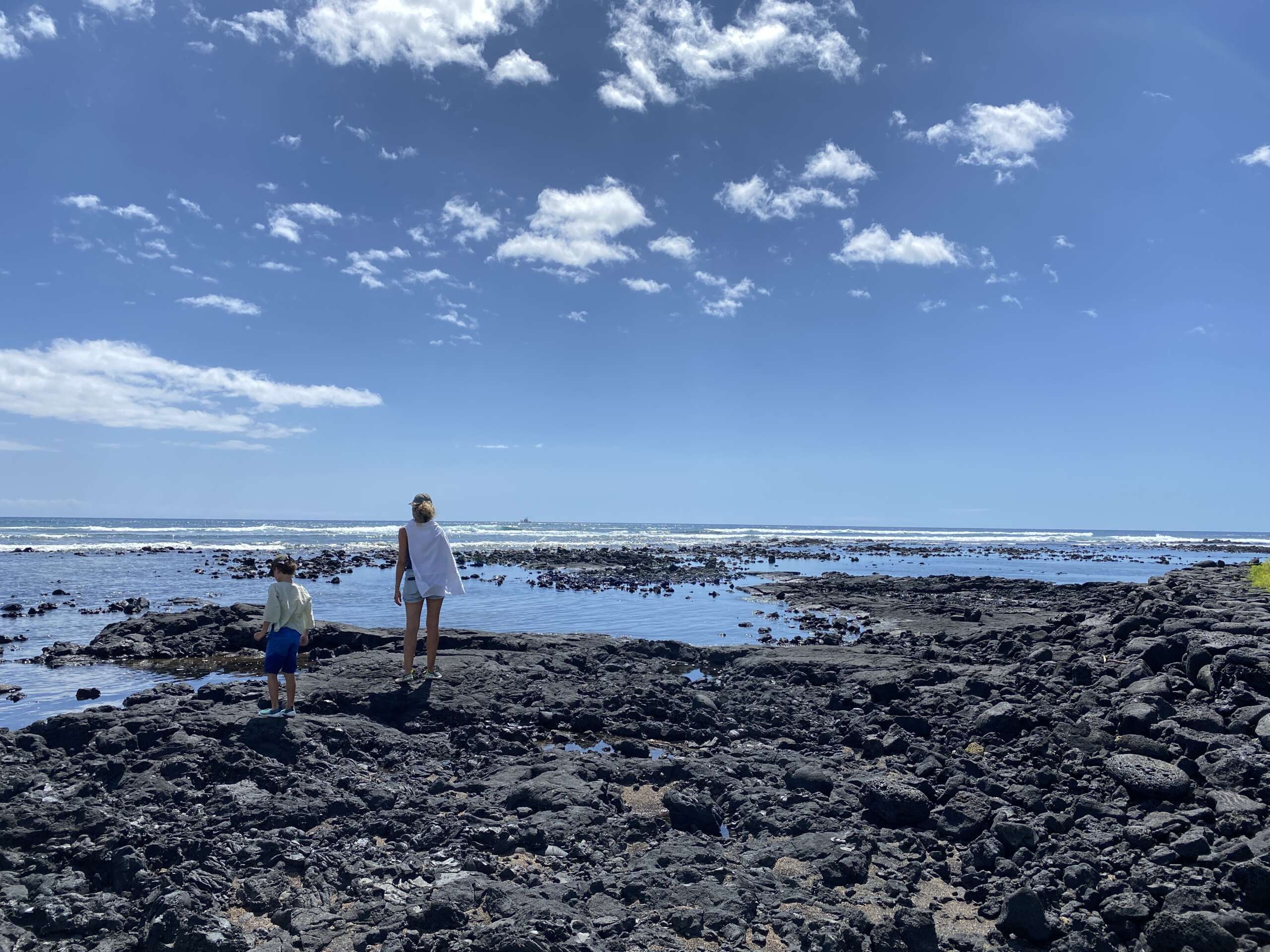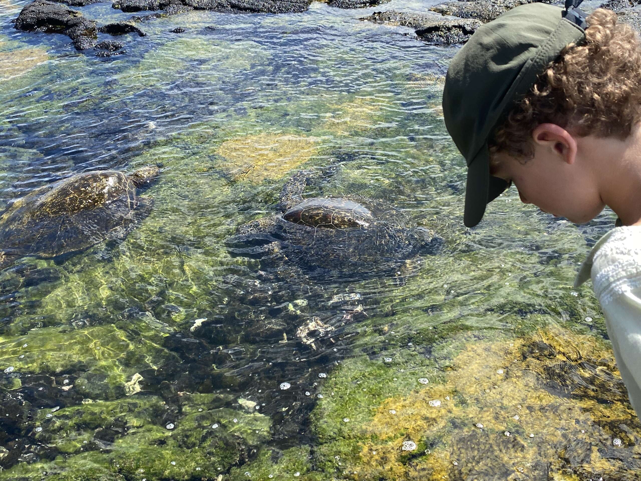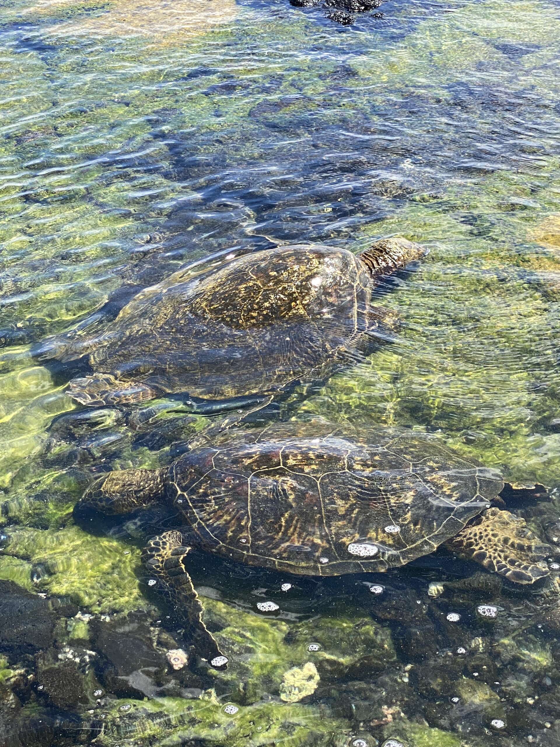 300 mètres après avoir garé la voiture, on débouche sur la plage de Honokohau. Il ne faudra pas 5 minutes de marche pour que Virginie spotte une première tortue entre les rochers dans des petites piscines naturelles créées par la marée.