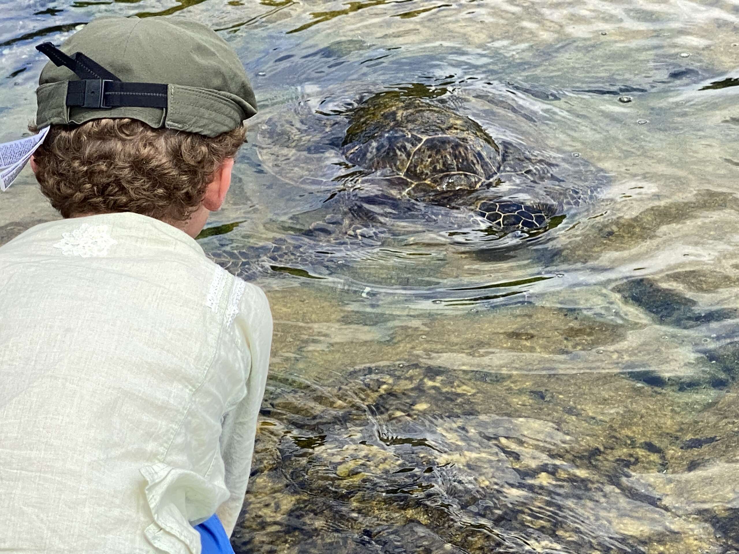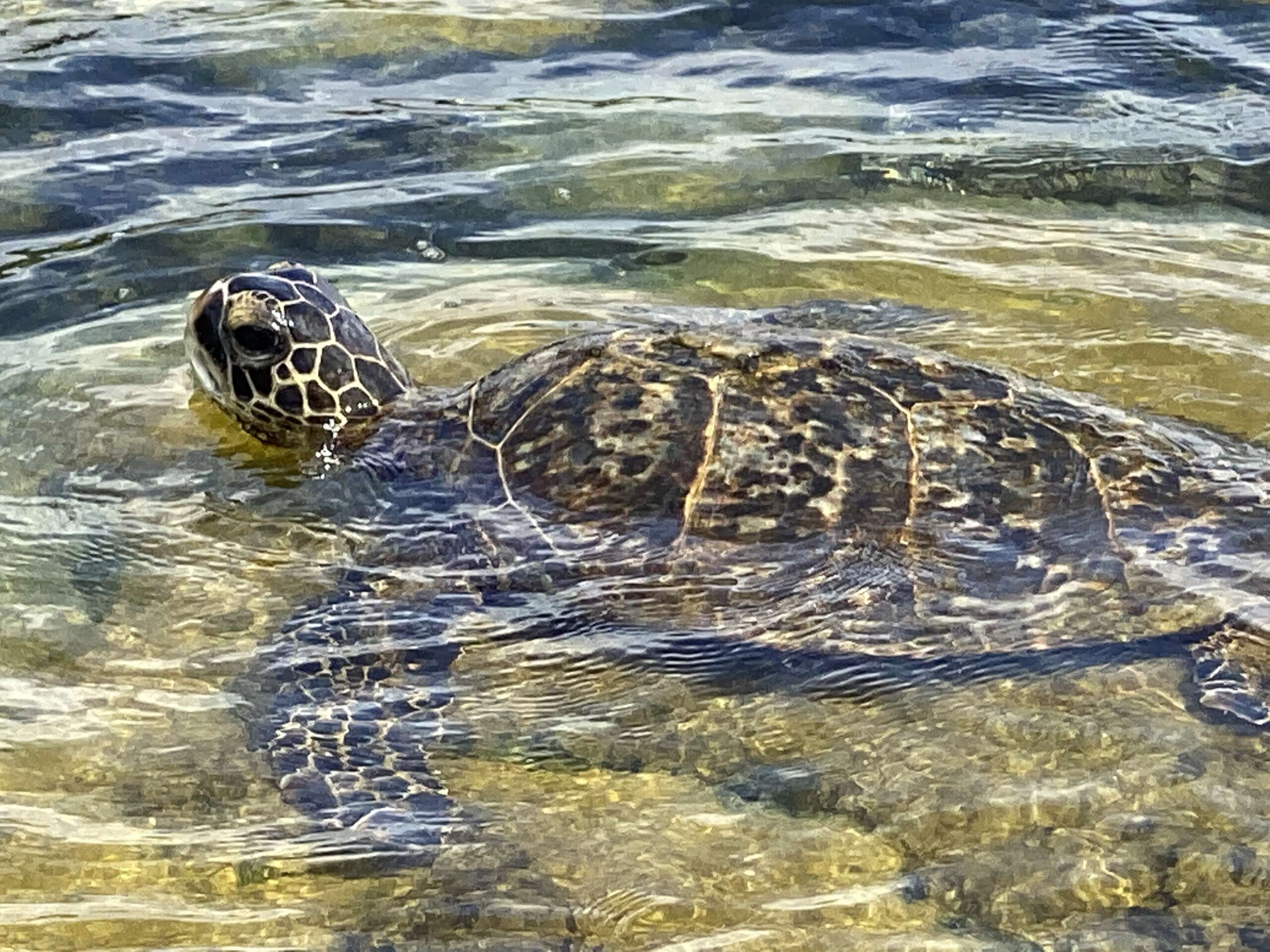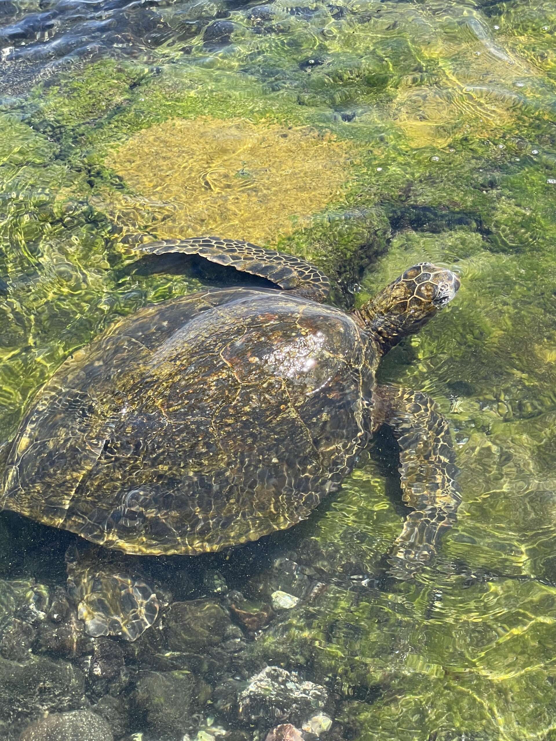 Ici, ce sont des tortues vertes qui viennent se nourrir d’algues à marée basse. C’est pratique du coup car on peut s’en approcher facilement à moins d’un mètre sans les déranger en passant de rochers en rochers.