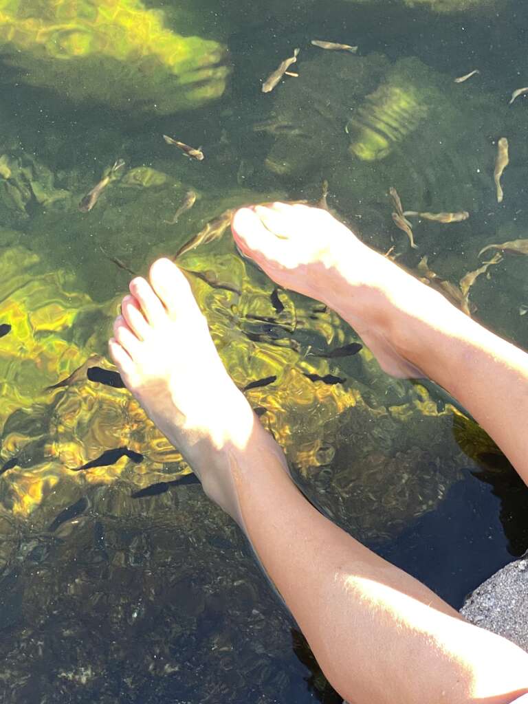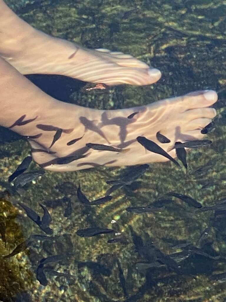 Bon, je ne sais pas si au final ça a fait grand-chose niveau désinfection. Mais l’expérience valait le coup. Virginie, elle, est ressortie avec des pieds tous doux et des mollets un peu rougis par le travail acharné de nos poissons.