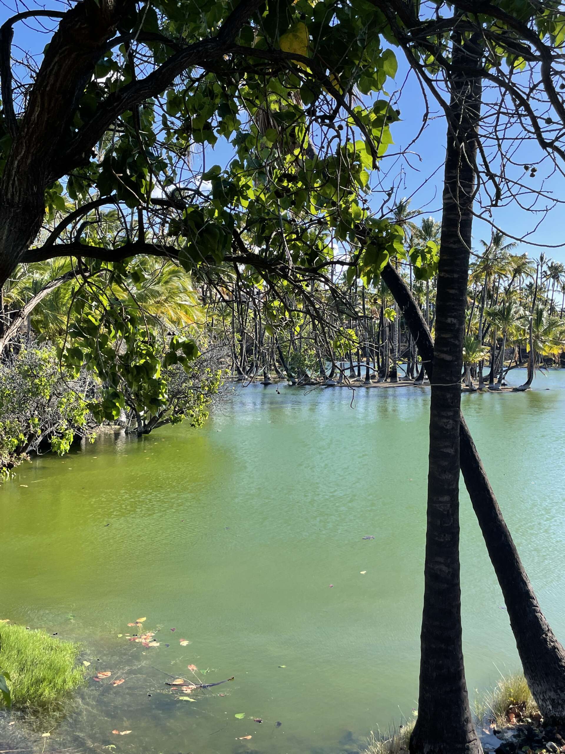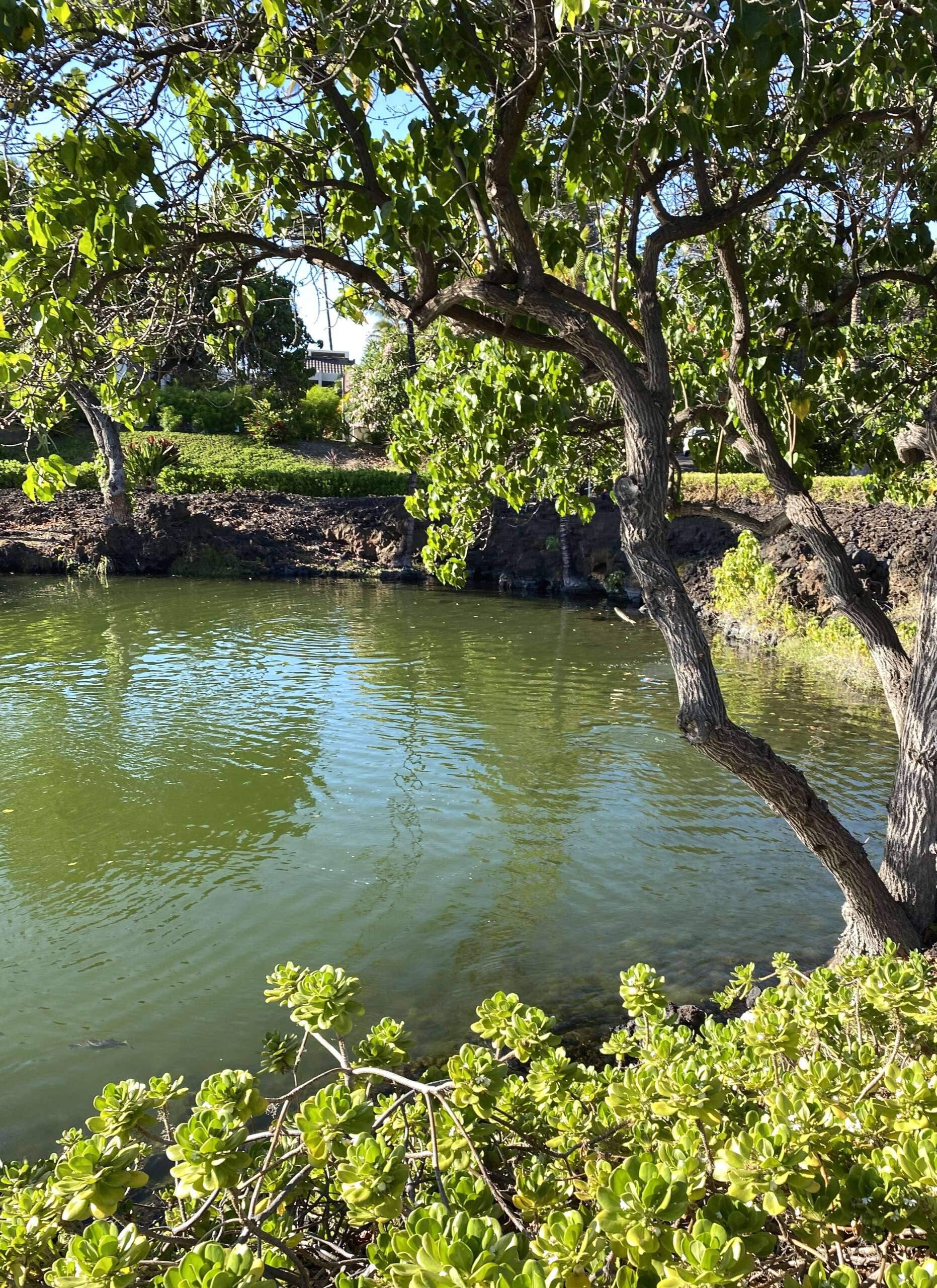 Et au milieu de ce désert, on retrouve quand même de ci de là des oasis de cocotiers en bord de mer. Exploitant d’anciens fishponds, je suppose que des promoteurs ont décidé de faire sortir au milieu du champs de lave des dizaines d’habitations en mode condominium, de tout artificaliser avec des pelouses et de faire même un golf. Jusque là, aucune bonne raison de s’arrêter ici…