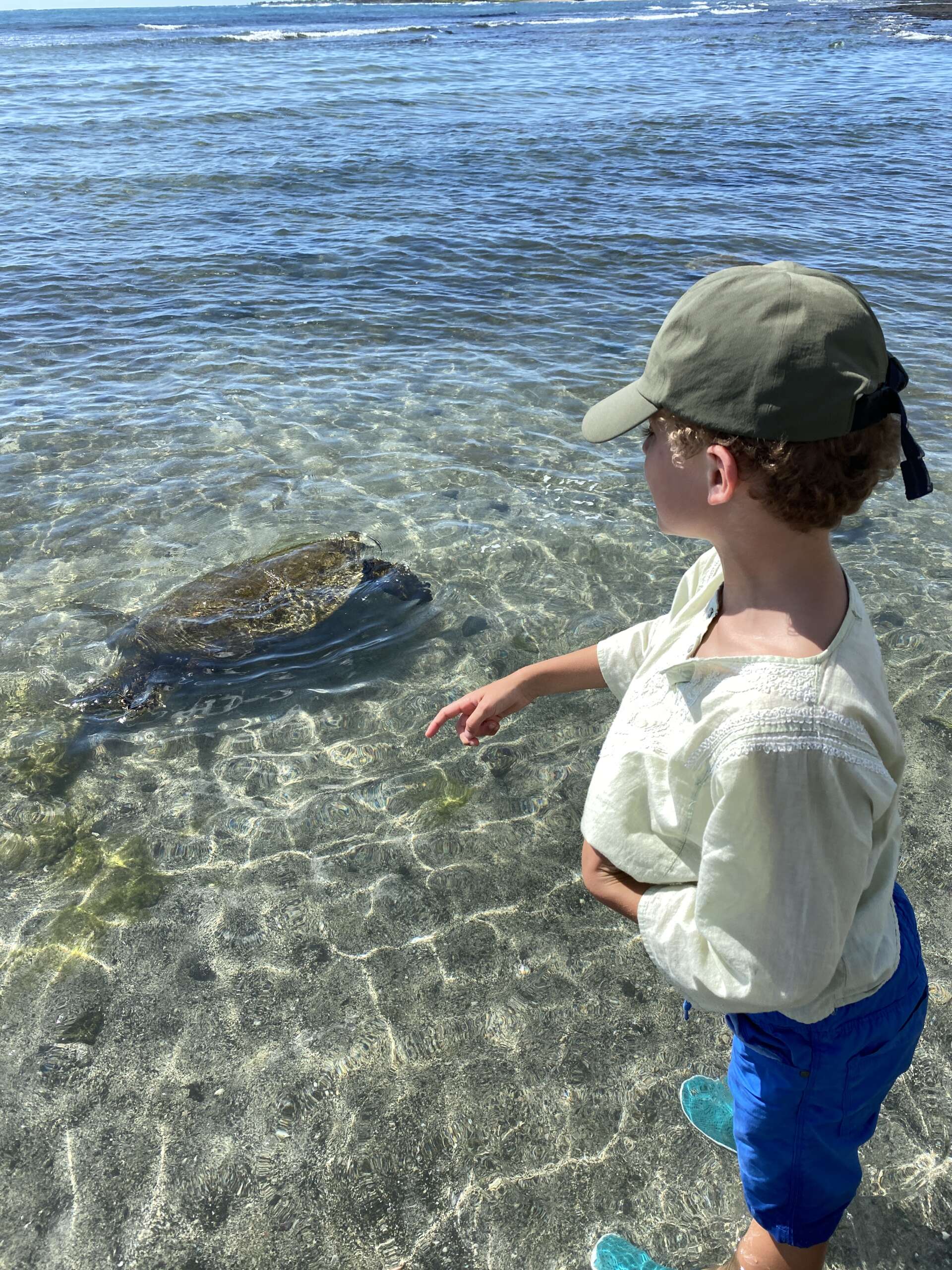 En 100 mètres on verra ainsi 5 tortues. 2 isolées, et un groupe de 3. Après de longues minutes d’observation très calme, on craque. Noah rêvait de pouvoir retoucher une tortue depuis sa dernière rencontre avec elles le jour de ses 4 ans. Elle est à 50cm de lui, on lui donne l’autorisation d’effleurer sa carapace. Ca dure 1 seconde, la tortue ne s’en est même pas rendue compte et Noah est super heureux.