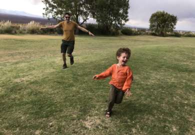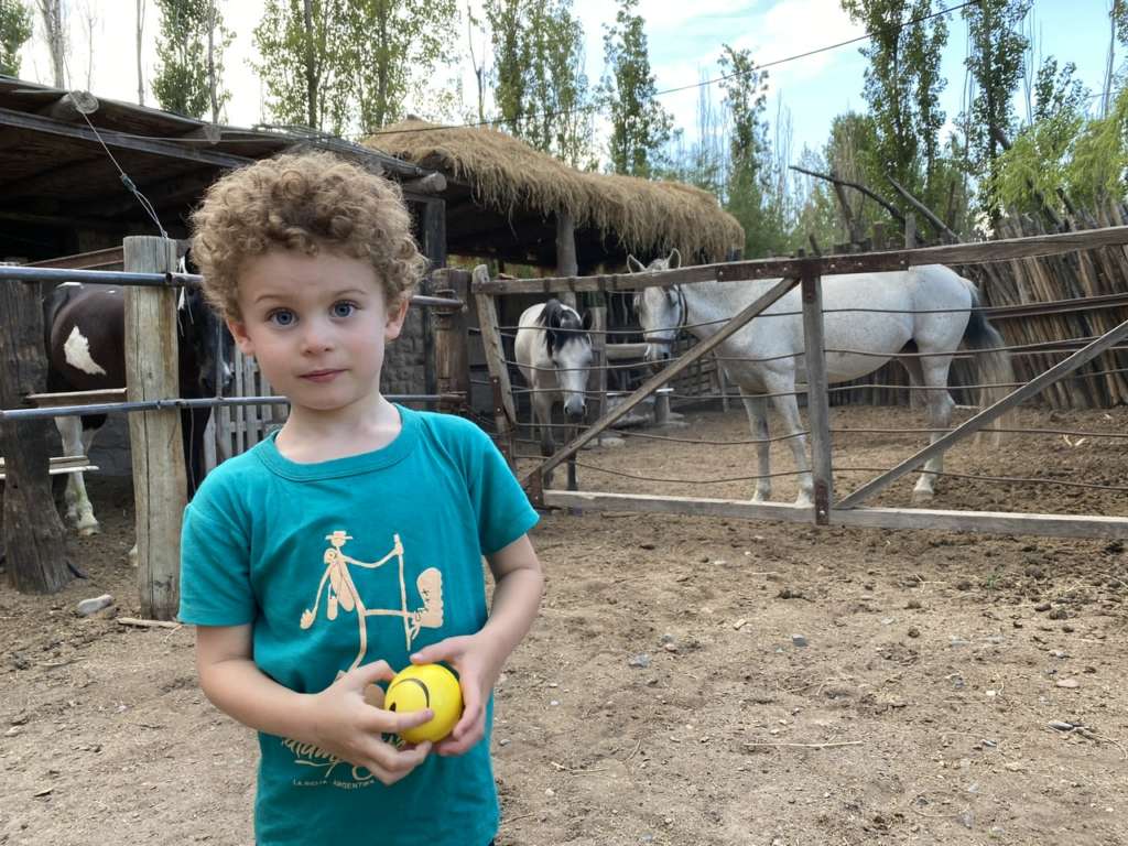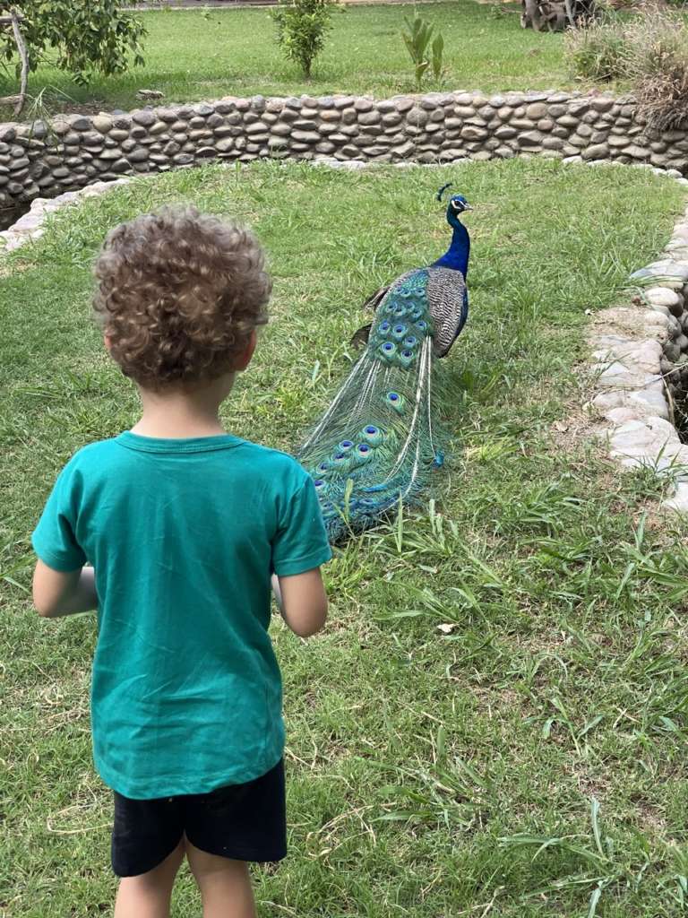 Noah fait rapidement le tour du propriétaire avec Gabriella, qui a épousé un Suisse et qui parle donc bien français. Il joue avec les paons, va voir des chevaux et se fait courir après par le chien.