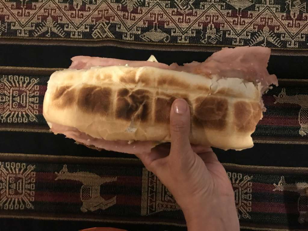 21h40 après plusieurs parties de mille bornes endiablées ou Noah a continué à mettre à Virginie des pneus crevés (je pense que l’histoire du pneu lui trotte encore dans la tête), on déguste des empanadas et surtout, un délicieux sandwich au lomito spécialité locale de San Juan. Enfin un bon sandwich. Avec Virginie on est d’accord là-dessus. Les 2 choses les plus dures à trouver en matière culinaire c’est un bon sandwich et une bonne salade.