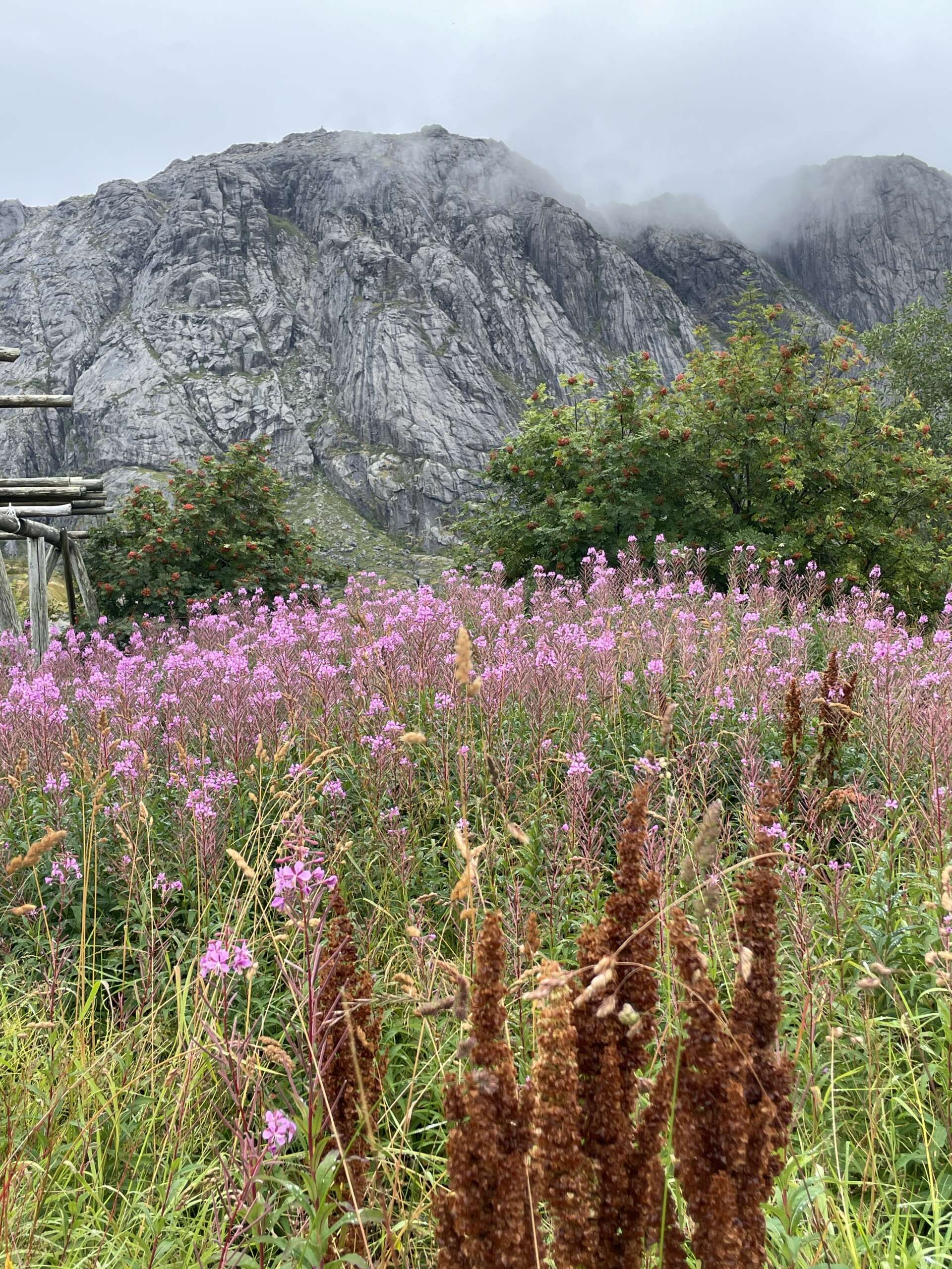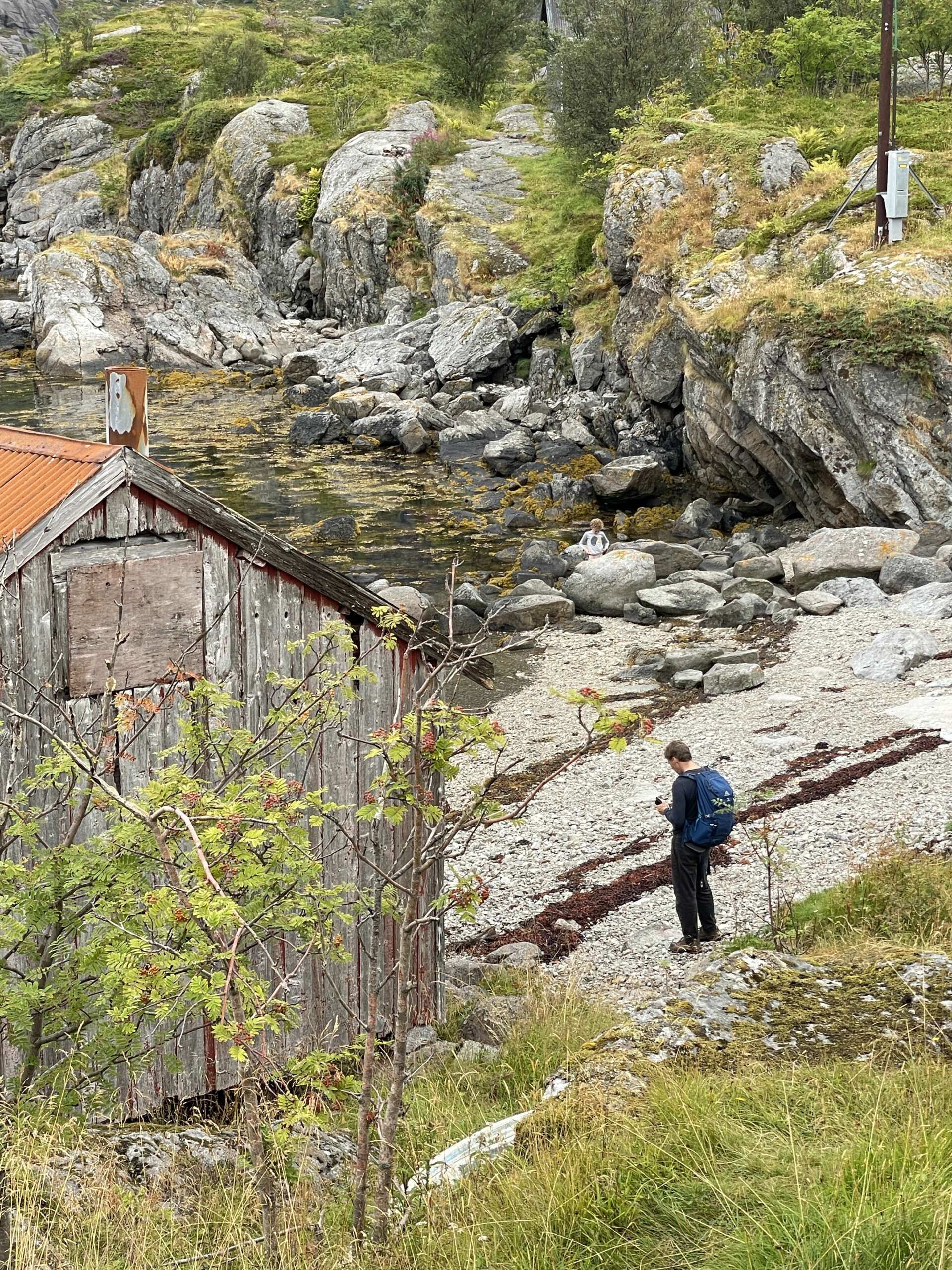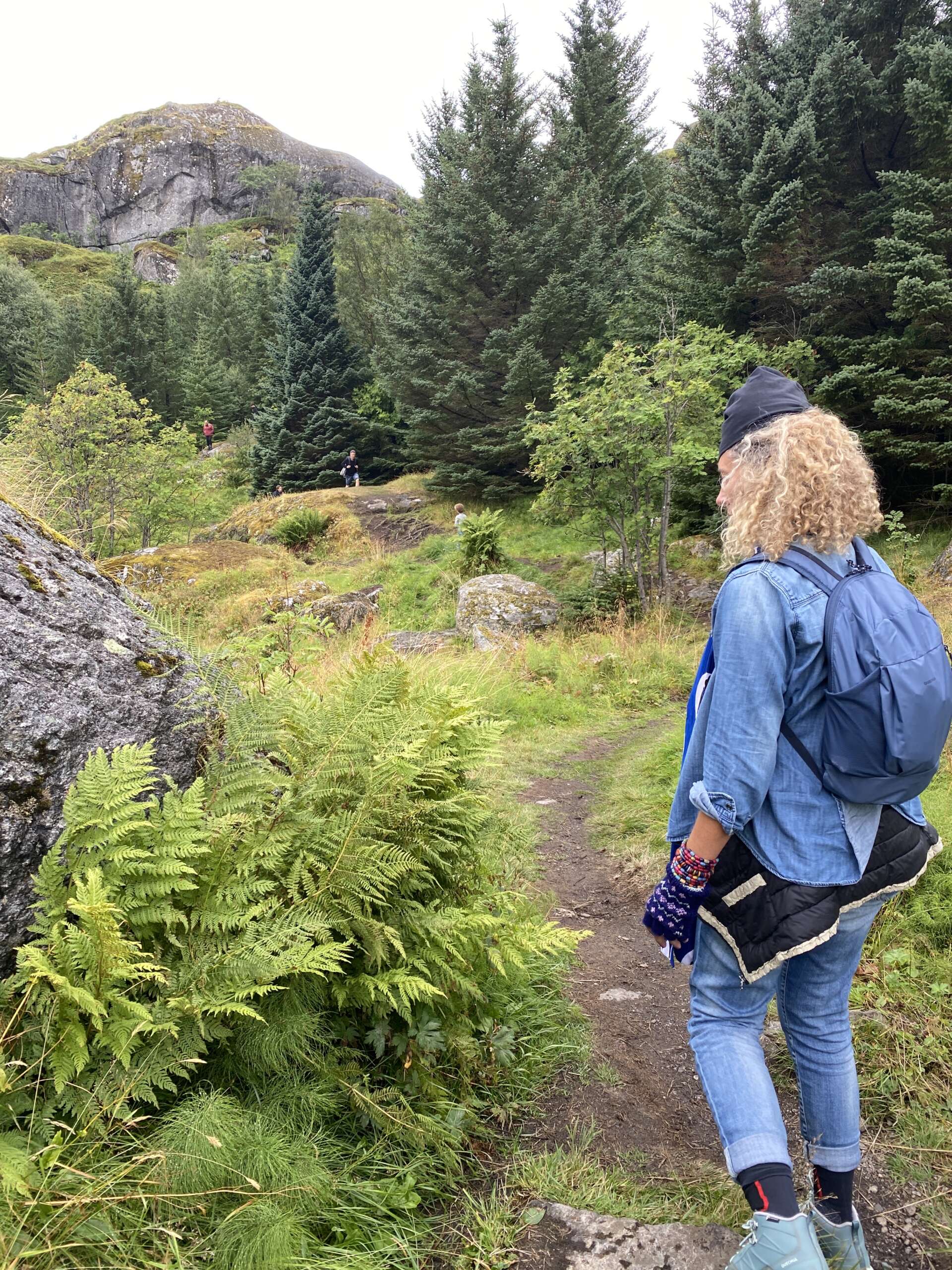 Le temps étant toujours gris (on est en Norvège, ou bien ? ), mais plus aucune pluie n’étant annoncée, je propose qu’on aille marcher un peu. Il y a une rando de 3h qui relie Nusfojord à Nesland par un chemin côtier qu’on n’aura pas le temps de faire, mais il y a une extension du début de cette rando qui permet d’atteindre la pointe jusqu’à l’embouchure du fjord.