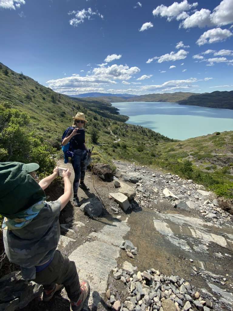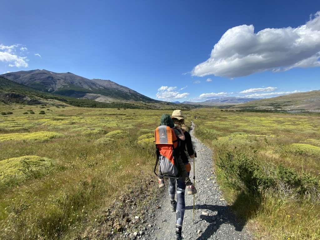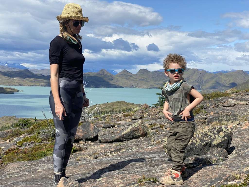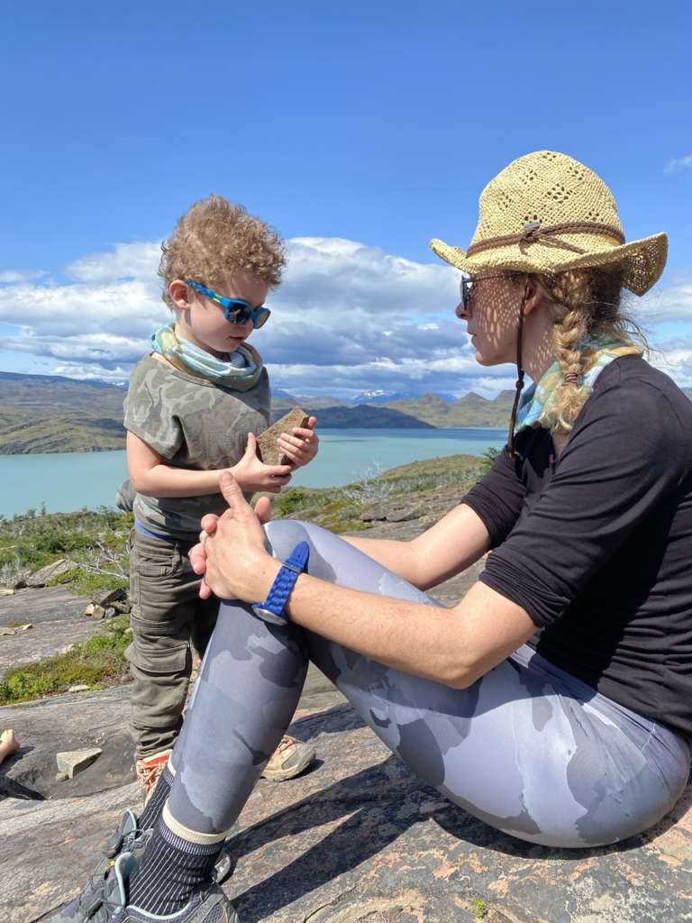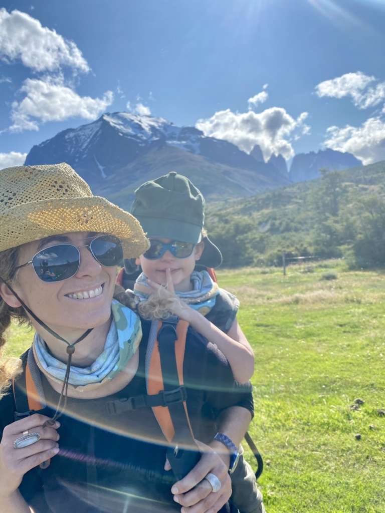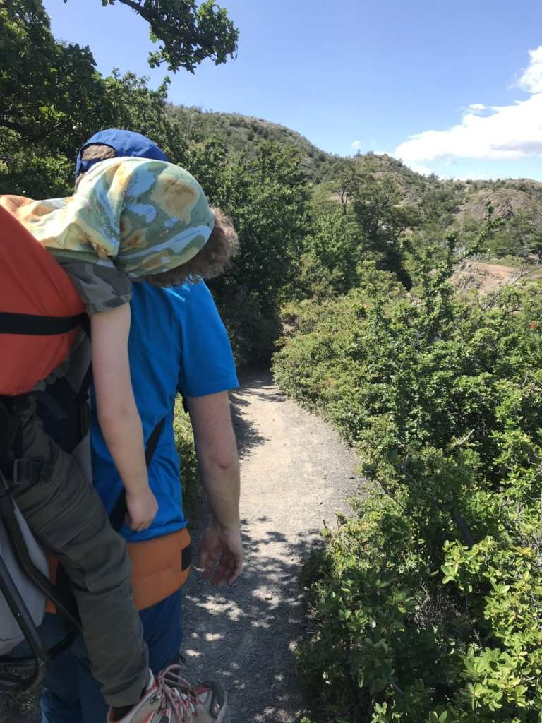 C’est l’heure du retour. Avant de faire les 10km dans l’autre sens, on monte à un lookout pour avoir une vue des lacs environnants et des fameuses « Cuernos ». Le vent patagonien qui avait été étonnamment totalement absent de la rando (au point qu’on crevait de chaud) s’est levé et au moment de monter au look out, j’avais Noah sur le dos et je me suis fait littéralement souffler par le vent. Je suis parti de côté sur plus d’1 mètre sur la première rafale et ensuite j’ai lutté une trentaine de secondes que la rafale se calme pour ne plus reculer davantage et essayer juste de me maintenir dans le vent sous les éclats de rire de Noah. Franchement, après coup c’est marrant, sur le coup je me suis demandé comment j’allais ne pas me faire emporter tout simplement dans la pente.