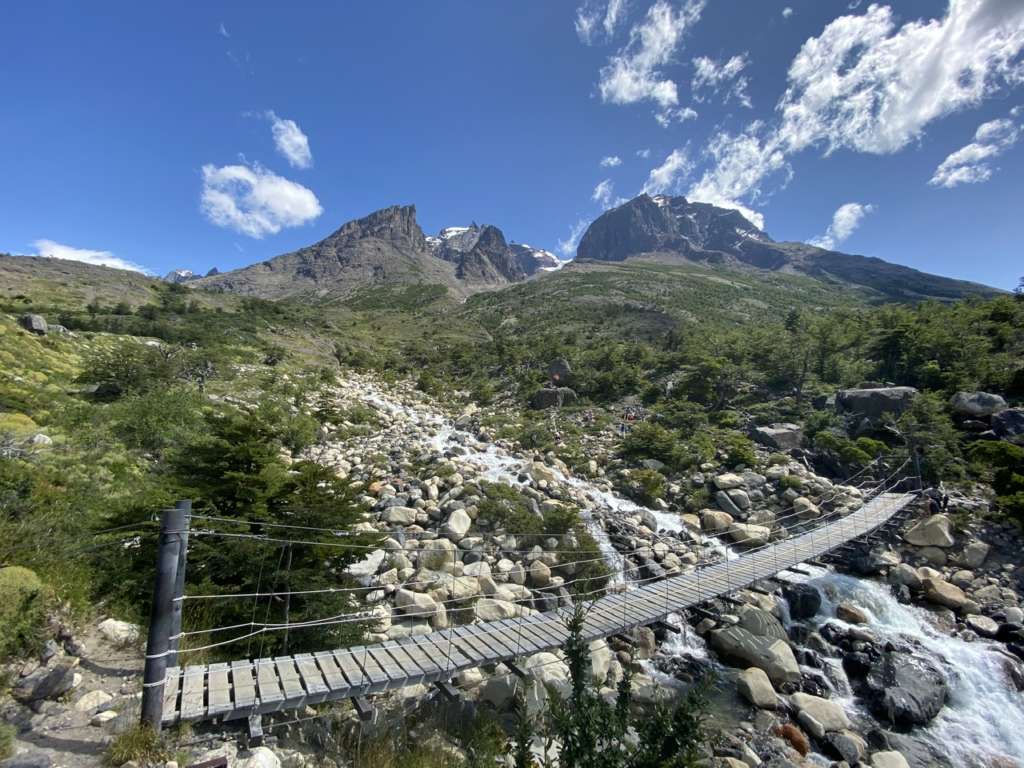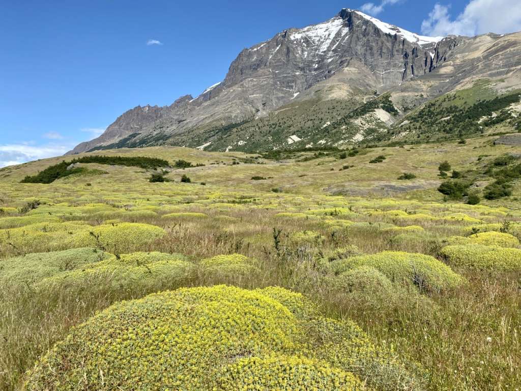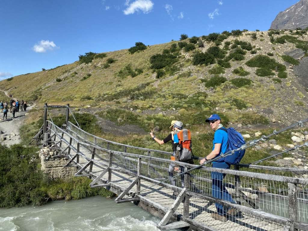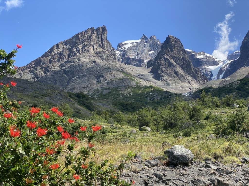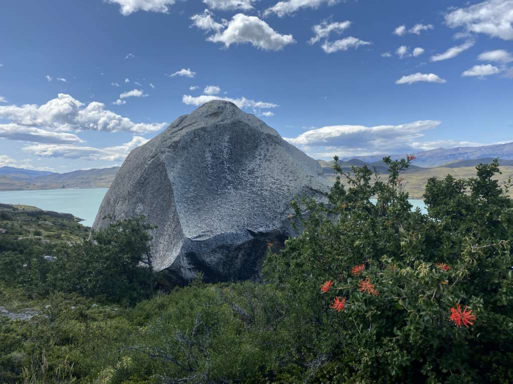 Et on n’est pas déçu. Très agréable et variée, on commence par longer le massif Paine d’un côté, le lac Nordenskjöld de l’autre (ah ben zut, on est retourné en Islande avec un nom pareil ?). On alterne entre la traversée de ponts suspendus, puis des plaines avec des mousses vert tendre, des forêts, des zones arides. On cottoie des fleurs de feu si typiques de la patagonie. Avec Noah on se goinfre de baies de Chura (baies minuscules qui ressemblent à des toutes petites pommes de moins d‘un centimètre et qui ont un vrai goût de pomme), on cueille des champignons. La rando est longue, mais pas difficile.