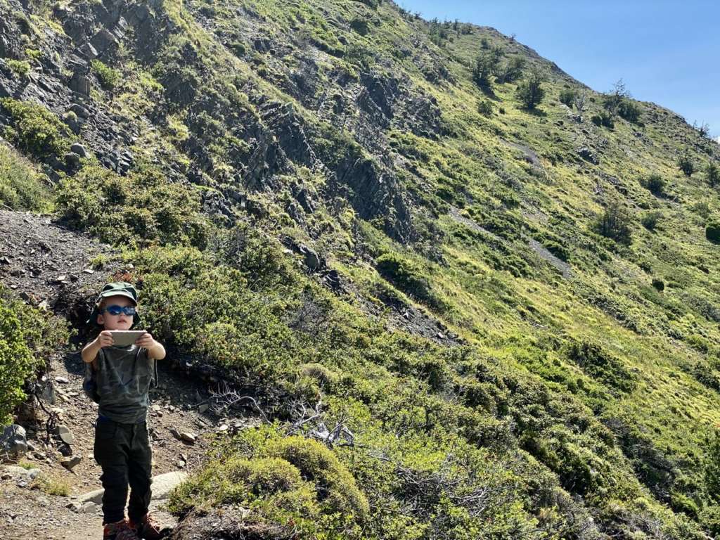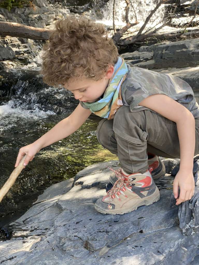 Alors qu’on s’apprête à attaquer un petit raidillon, Noah manifeste les premiers signes d’ennui, prémices d’un désir d’arrêter de marcher. Tandis que je commence à me creuser la tête pour trouver une idée pour le distraire, voila que tout seul, il a un éclair de génie qui va nous sauver la mise. Il trouve sur le bas côté un morceau de roche parfaitement rectangulaire de la taille d’un téléphone portable et se met spontanément à prendre des photos avec. S’en suivra 1h à prendre fleurs, roches, paysages en photos, puis les autres randonneurs qu’on croise. Les gens prennent la pause, Noah va leur montrer ensuite les photos qu’il a prise en faisant le geste caractéristique de swiper d’une photo à l’autre, puis il explique que les photos sont stockées dans son appareil et qu’il les mettra sur internet et sur youtube. C’est officiel. Noah, 3 ans, est meilleur que ses 2 mamies sur internet.